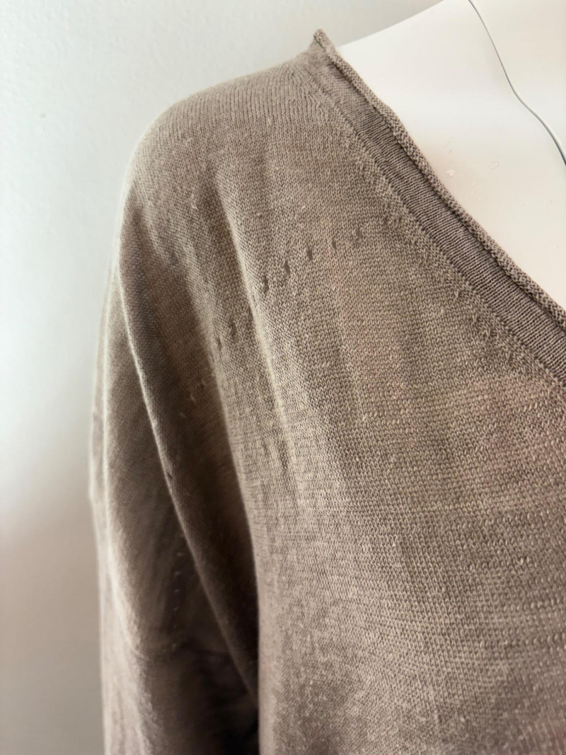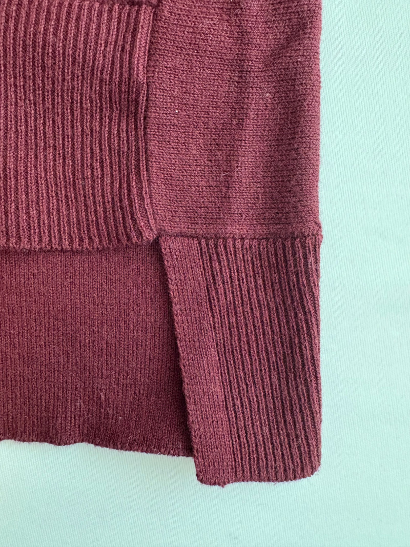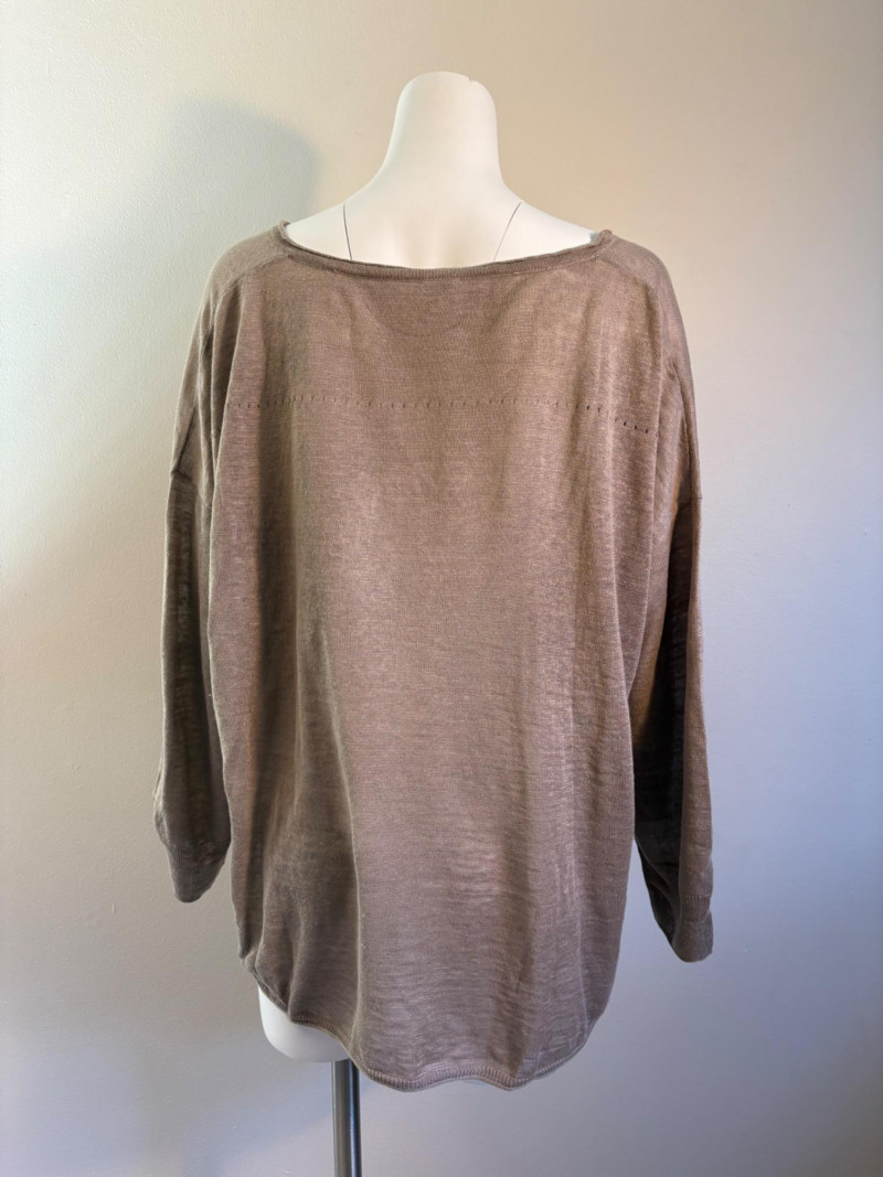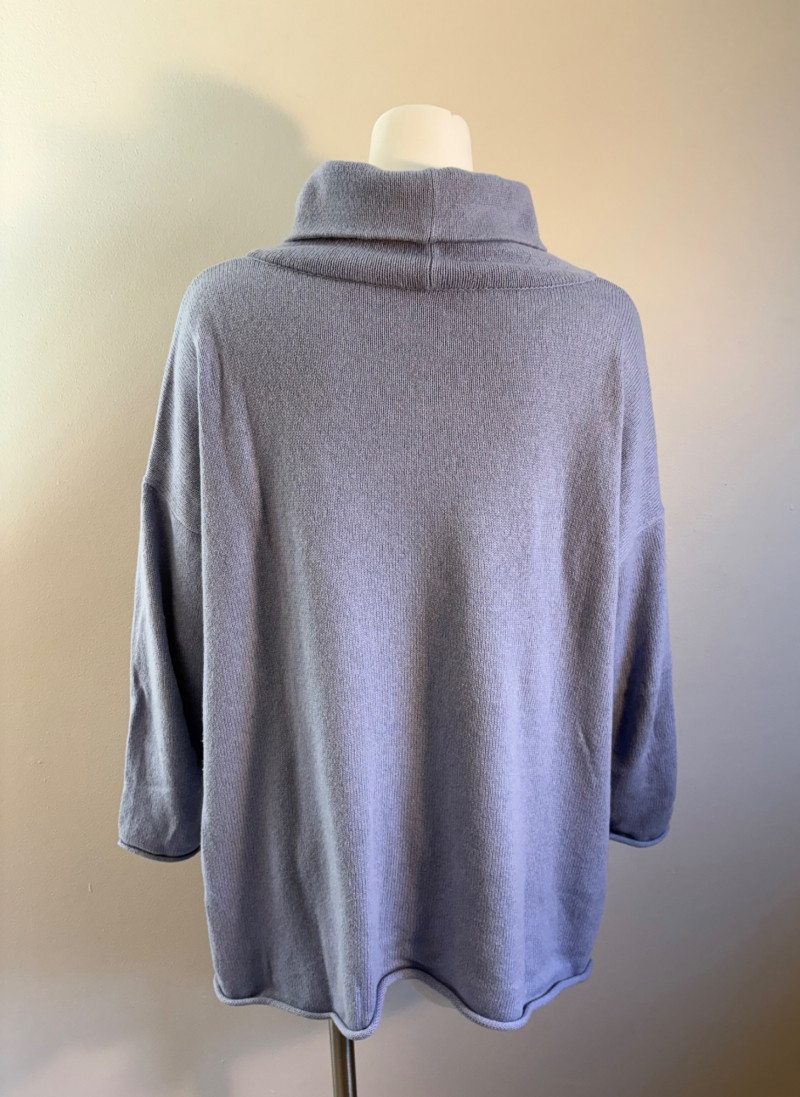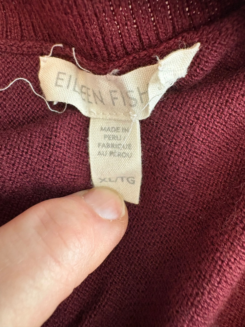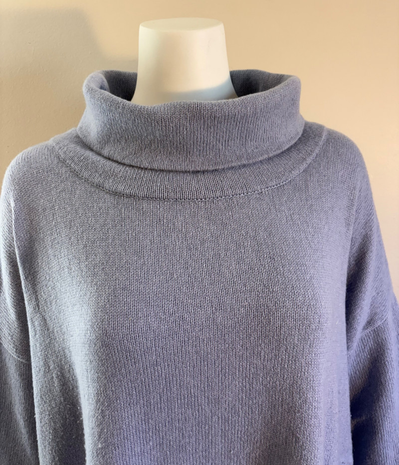 All sweaters in this trio are in very good condition except that all need a patient sweater shave. If you are willing to put in the time, you will have three fabulous pieces to work with. See last 3 photos for an example of the pilling on each. Pale purple-blue turtleneck sweater from Eileen Fisher has dropped shoulders and rolled hems on cuffs and bottom hem. Pilling is very mild on this one - mostly around the armpits. 70% cotton with 30% recycled cashmere. Measures 28" pit to pit and 26" from back neck seam to bottom hem. Size tag says XL. Burgundy sweater from Eileen Fisher has ribbed neckline, cuffs, and split ribbed hem with back about 2" lower than front. Pilling across the lower front is relatively mild as is overall wear. 100% cotton. Measures 28" pit to pit and 26.5" from back neckline to bottom of hem. Size tag says XL. Taupe sweater from Poetry has deep V-neck. dropped shoulder seams, and a decorative pattern just below the shoulders ( front & back) with ribbing along neckline, cuffs, and bottom hem. Pilling is across the front - otherwise in great shape. 100% linen. Measures 27" pit to pit and 27" from back neckline to bottom back hem. Size tag says 16.