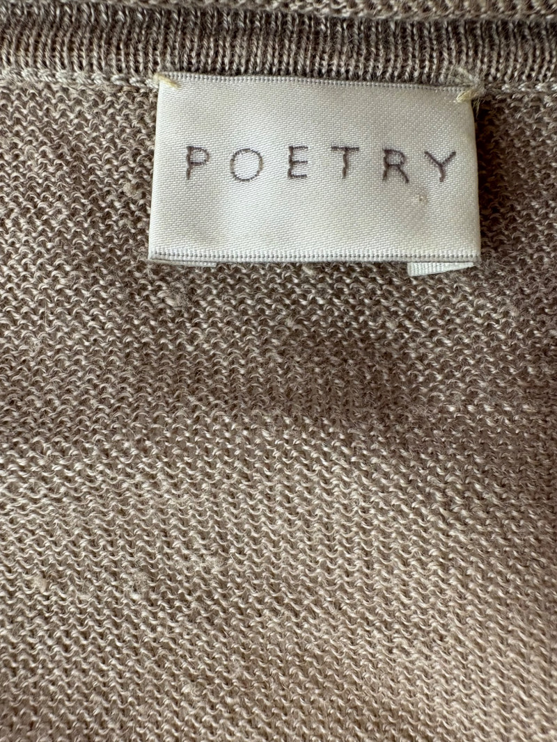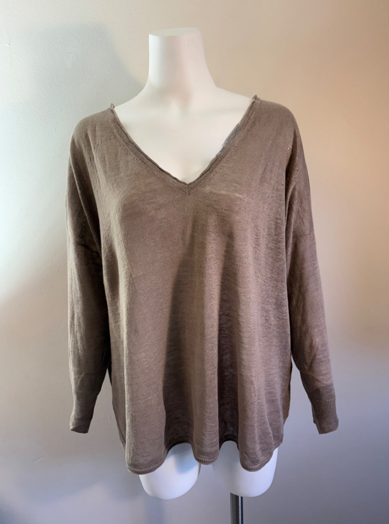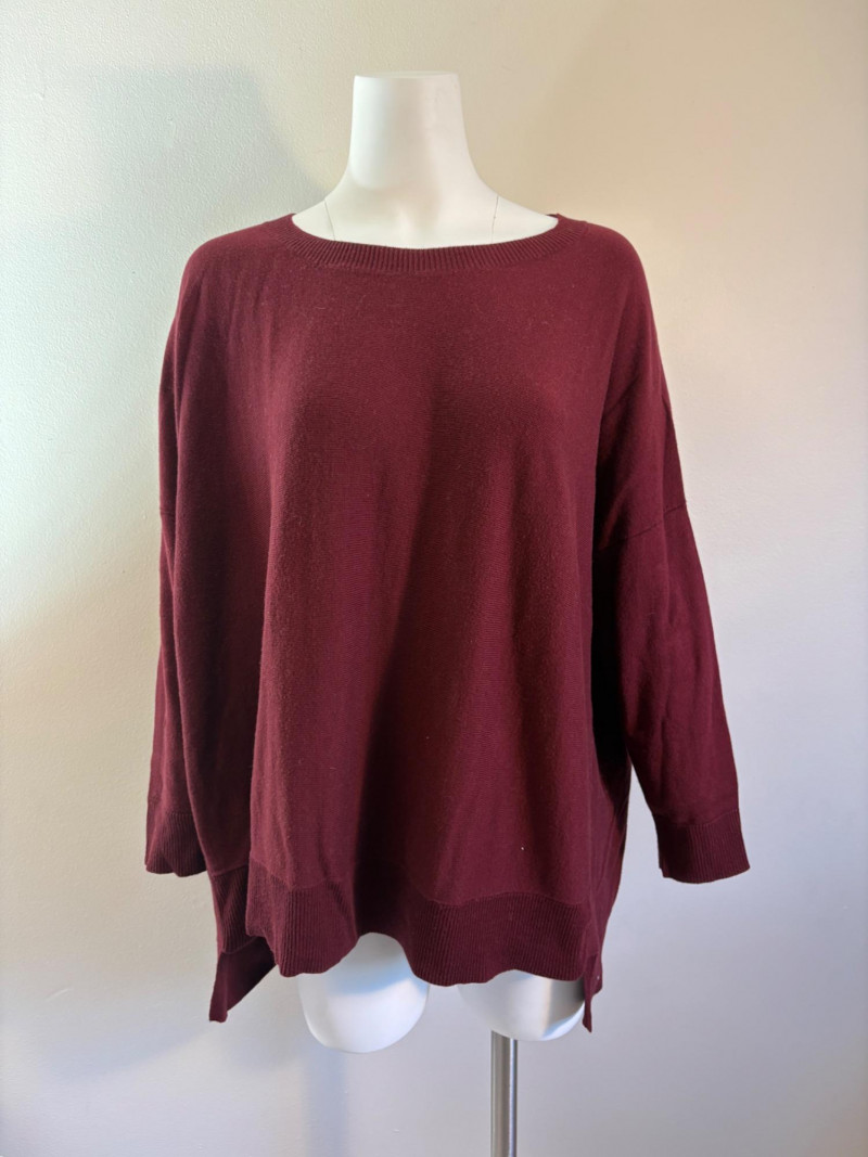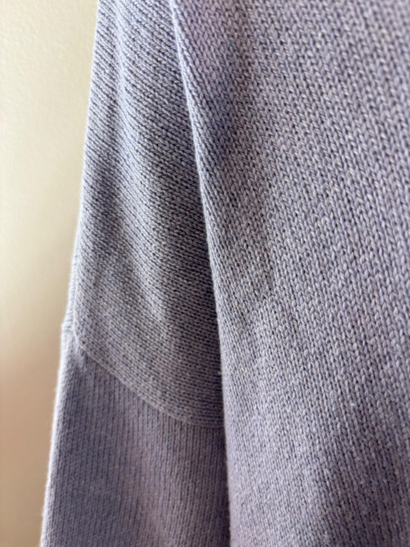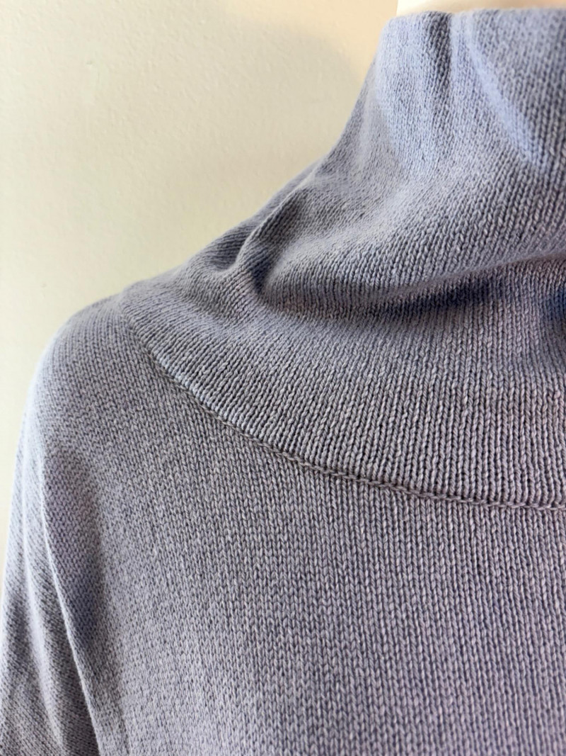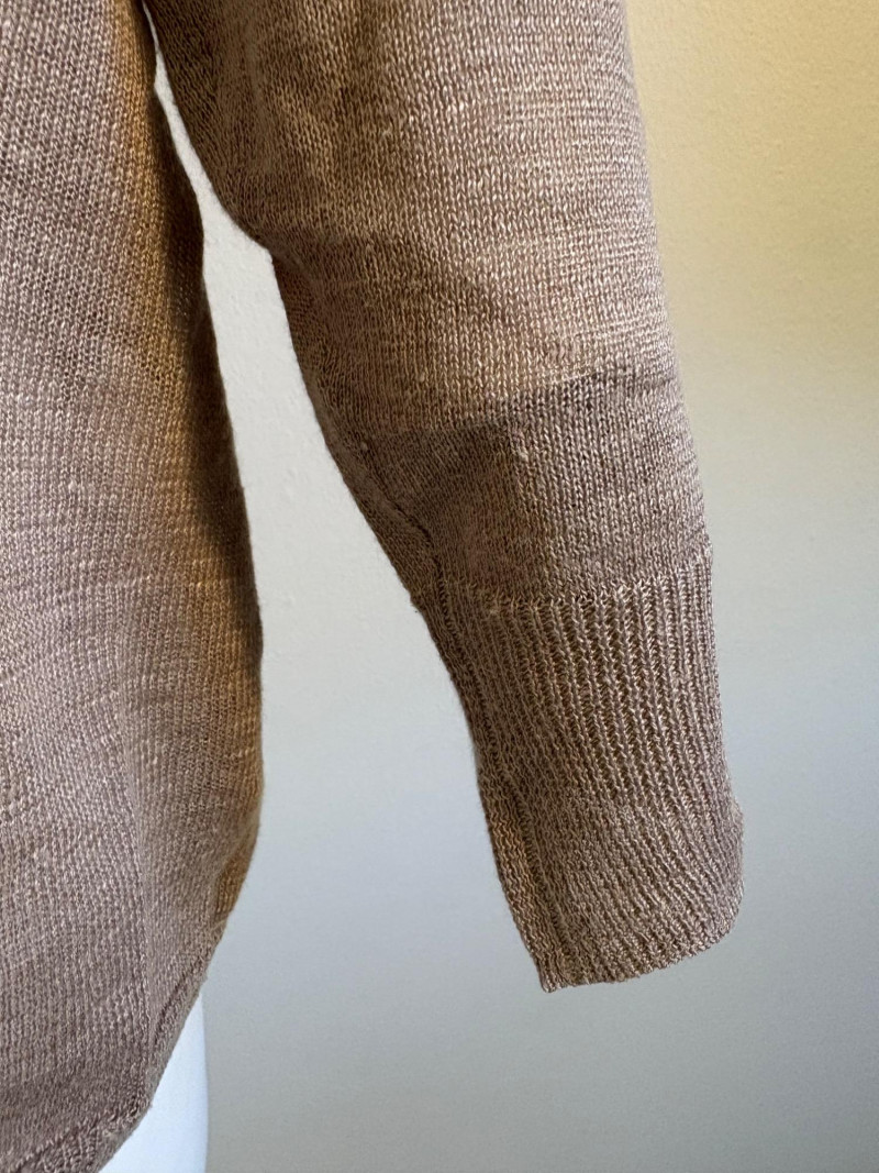 All sweaters in this trio are in very good condition except that all need a patient sweater shave. If you are willing to put in the time, you will have three fabulous pieces to work with. See last 3 photos for an example of the pilling on each. Pale purple-blue turtleneck sweater from Eileen Fisher has dropped shoulders and rolled hems on cuffs and bottom hem. Pilling is very mild on this one - mostly around the armpits. 70% cotton with 30% recycled cashmere. Measures 28" pit to pit and 26" from back neck seam to bottom hem. Size tag says XL. Burgundy sweater from Eileen Fisher has ribbed neckline, cuffs, and split ribbed hem with back about 2" lower than front. Pilling across the lower front is relatively mild as is overall wear. 100% cotton. Measures 28" pit to pit and 26.5" from back neckline to bottom of hem. Size tag says XL. Taupe sweater from Poetry has deep V-neck. dropped shoulder seams, and a decorative pattern just below the shoulders ( front & back) with ribbing along neckline, cuffs, and bottom hem. Pilling is across the front - otherwise in great shape. 100% linen. Measures 27" pit to pit and 27" from back neckline to bottom back hem. Size tag says 16.
