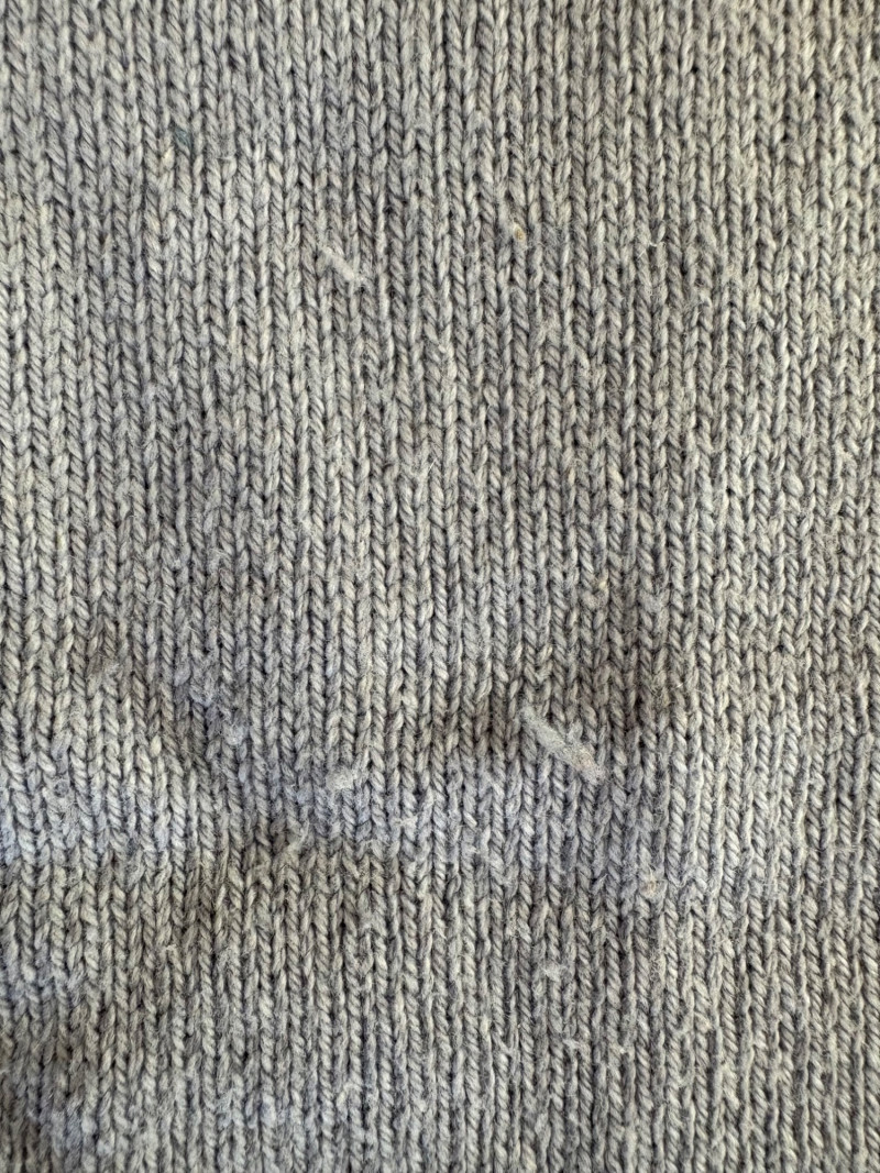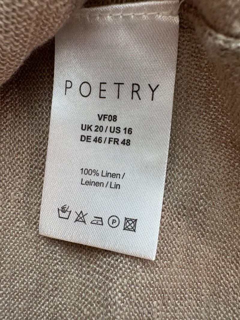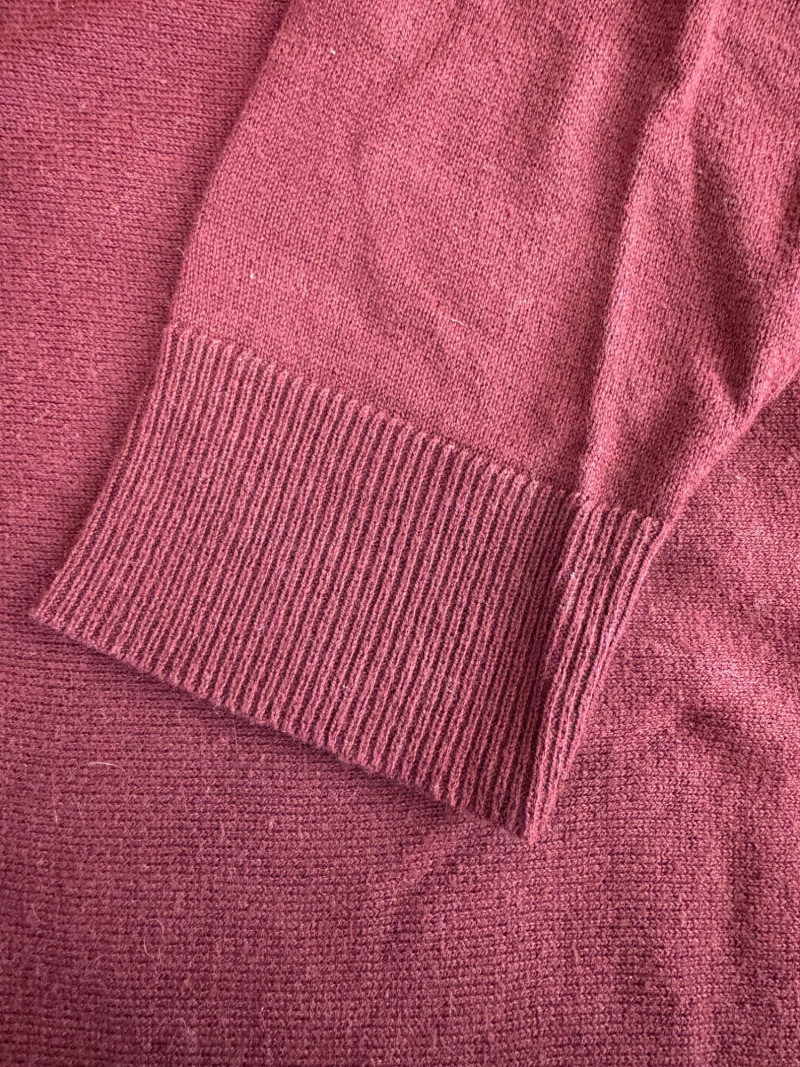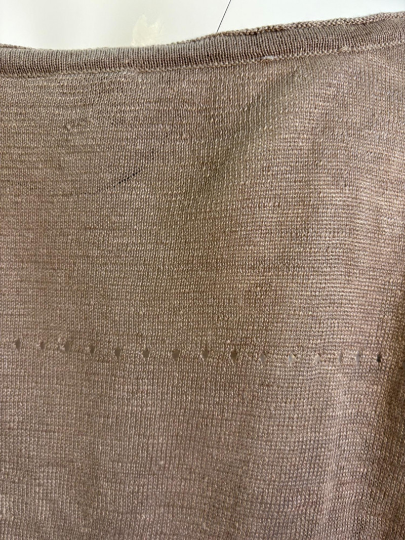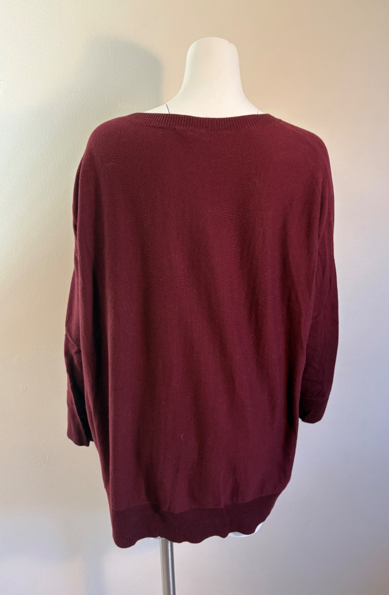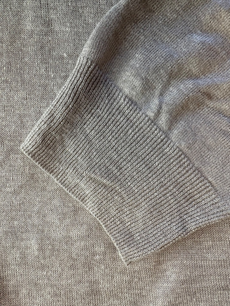 All sweaters in this trio are in very good condition except that all need a patient sweater shave. If you are willing to put in the time, you will have three fabulous pieces to work with. See last 3 photos for an example of the pilling on each. Pale purple-blue turtleneck sweater from Eileen Fisher has dropped shoulders and rolled hems on cuffs and bottom hem. Pilling is very mild on this one - mostly around the armpits. 70% cotton with 30% recycled cashmere. Measures 28" pit to pit and 26" from back neck seam to bottom hem. Size tag says XL. Burgundy sweater from Eileen Fisher has ribbed neckline, cuffs, and split ribbed hem with back about 2" lower than front. Pilling across the lower front is relatively mild as is overall wear. 100% cotton. Measures 28" pit to pit and 26.5" from back neckline to bottom of hem. Size tag says XL. Taupe sweater from Poetry has deep V-neck. dropped shoulder seams, and a decorative pattern just below the shoulders ( front & back) with ribbing along neckline, cuffs, and bottom hem. Pilling is across the front - otherwise in great shape. 100% linen. Measures 27" pit to pit and 27" from back neckline to bottom back hem. Size tag says 16.