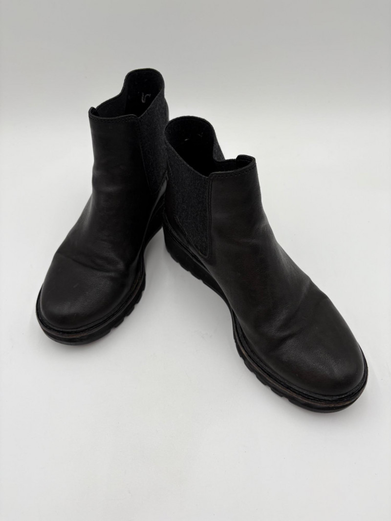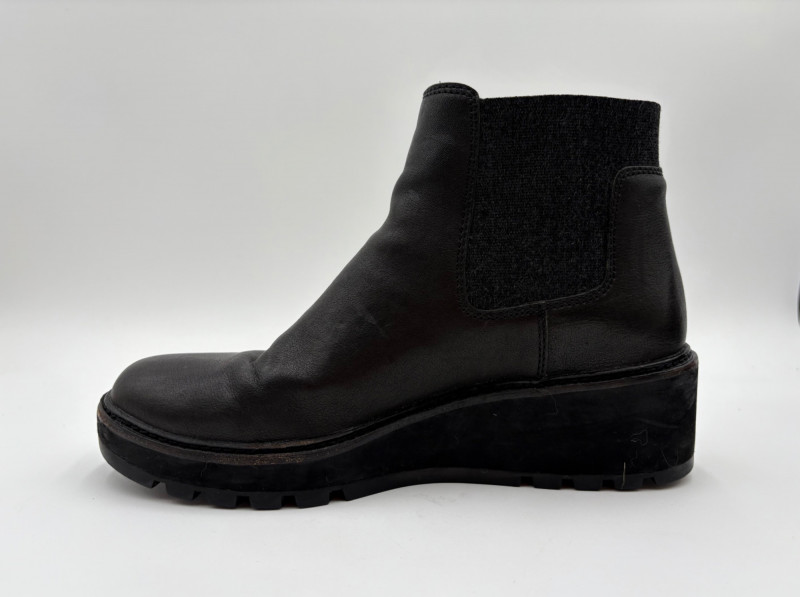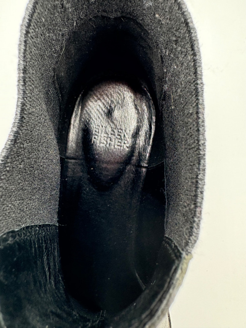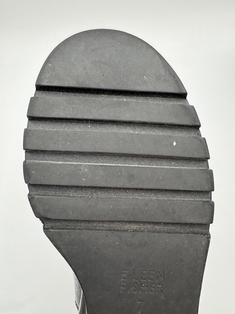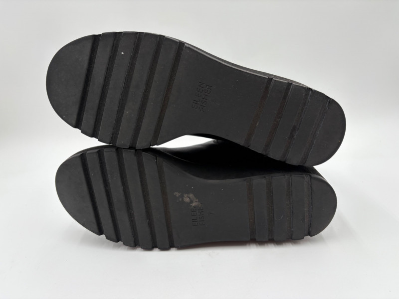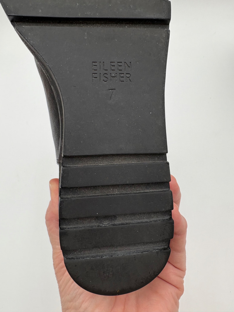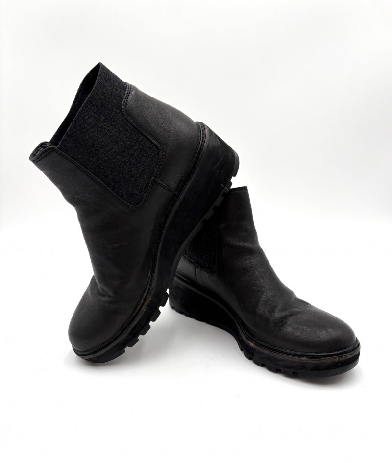 Funky black leather ankle boots from Eileen Fisher with 3/4" lug sole and 2" wedged heel. Elastic insert on both inner and outer ankle and above heel. In very good used condition with lots of life left in them. Size 7