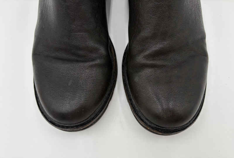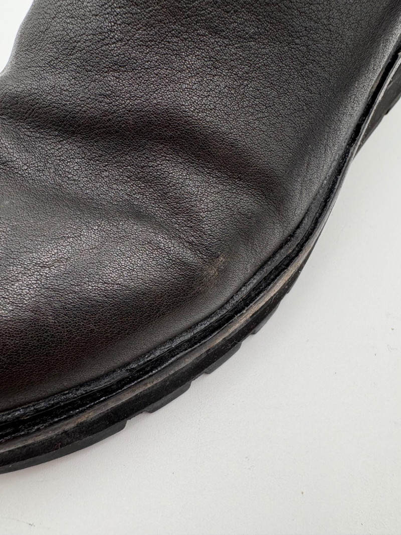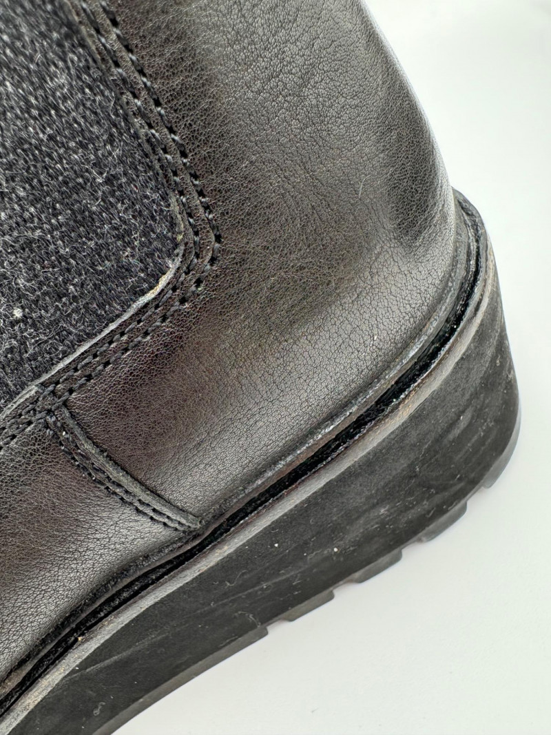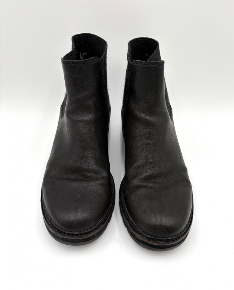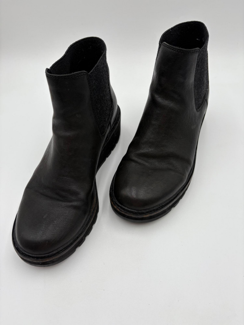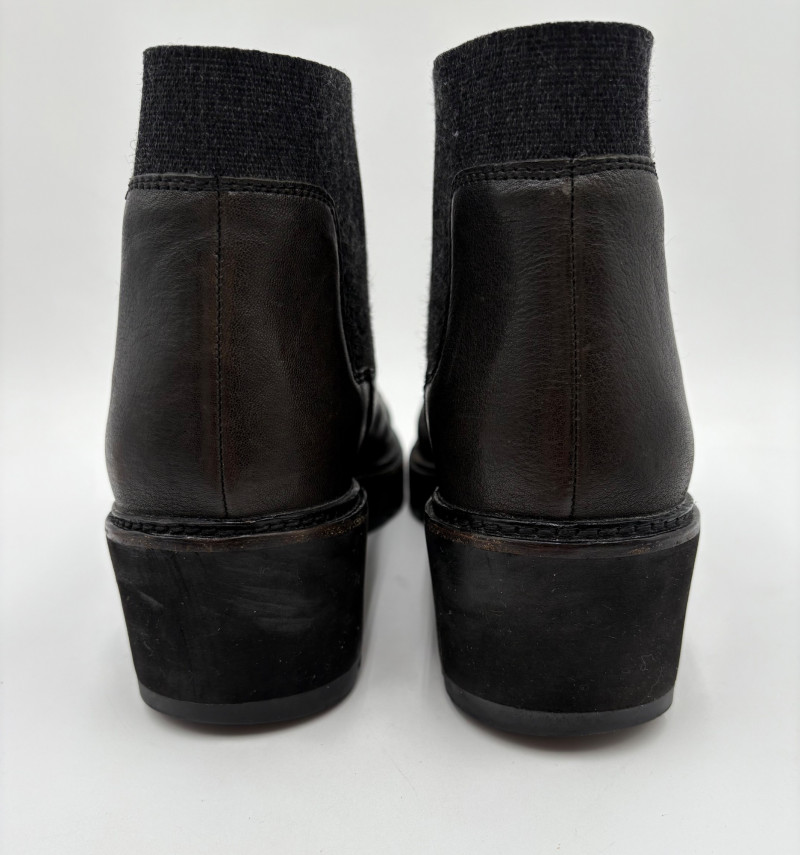 Funky black leather ankle boots from Eileen Fisher with 3/4" lug sole and 2" wedged heel. Elastic insert on both inner and outer ankle and above heel. In very good used condition with lots of life left in them. Size 7