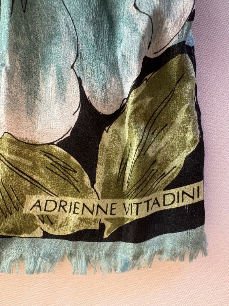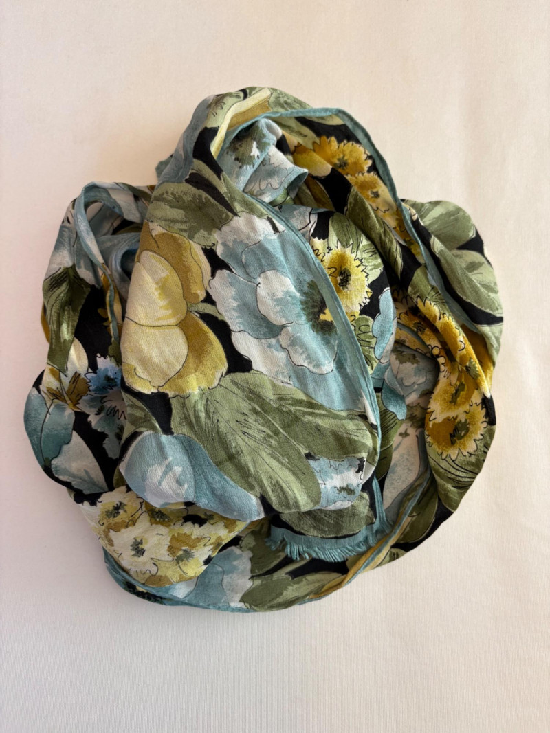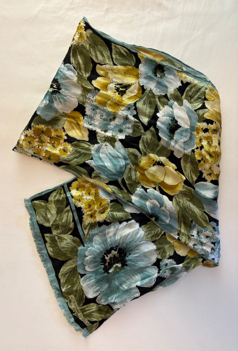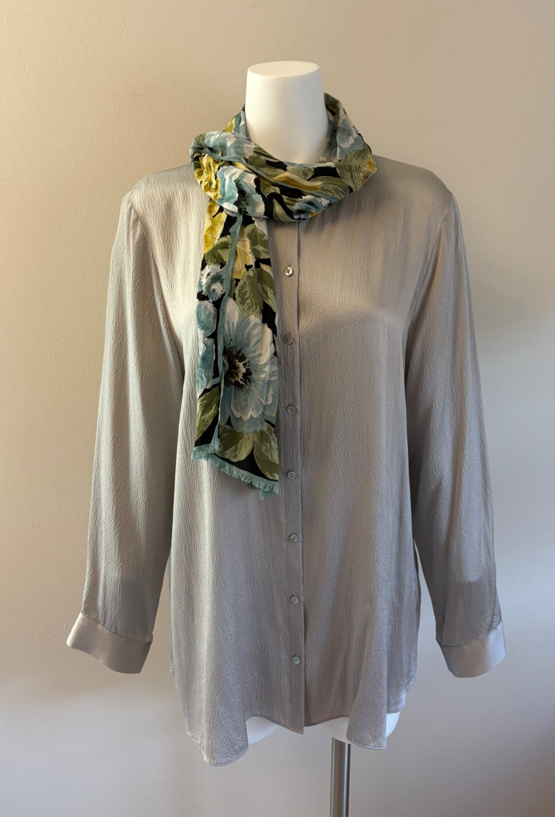 Stunning shimmery silver shirt from Eileen Fisher. Small curved collar, front button closure, 2 button closure on cuffs with pleats, and curved bottom hem. In excellent condition. 100% silk, Measures 23" pit to pit and 30" from back neck seam to bottom of back hem. Size tag says XL. Floral multicolored scarf from Adrienne Vittadini. In excellent condition. Fabric tag is missing, but feels like 100% silk. Measures approx. 10" x 50".