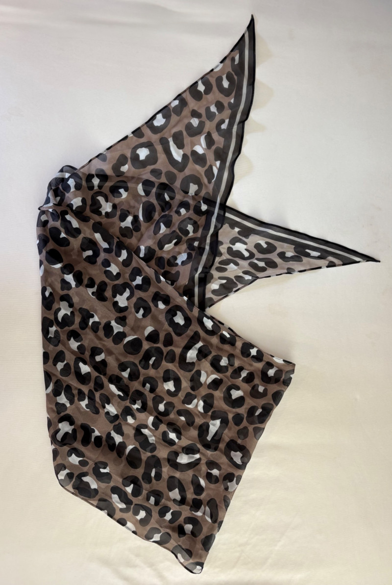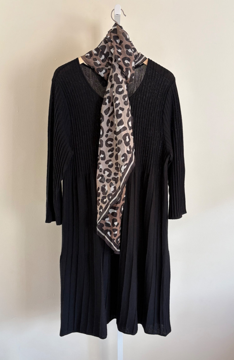 Knit dressed paired with a printed scarf from Eileen Fisher & Cabi. Black long sleeve knit dress from Eileen Fisher has narrow ribbing on bodice and sleeves with a wider rib on the skirt section. In very good condition. 100% wool. Measures 21" pit to pit and 39" from back neckline to bottom of back hem. Size tag says XL. Animal print scarf from Cabi is trapezoid shaped. In good condition. 100% silk. Measures approx. 13" x 70"