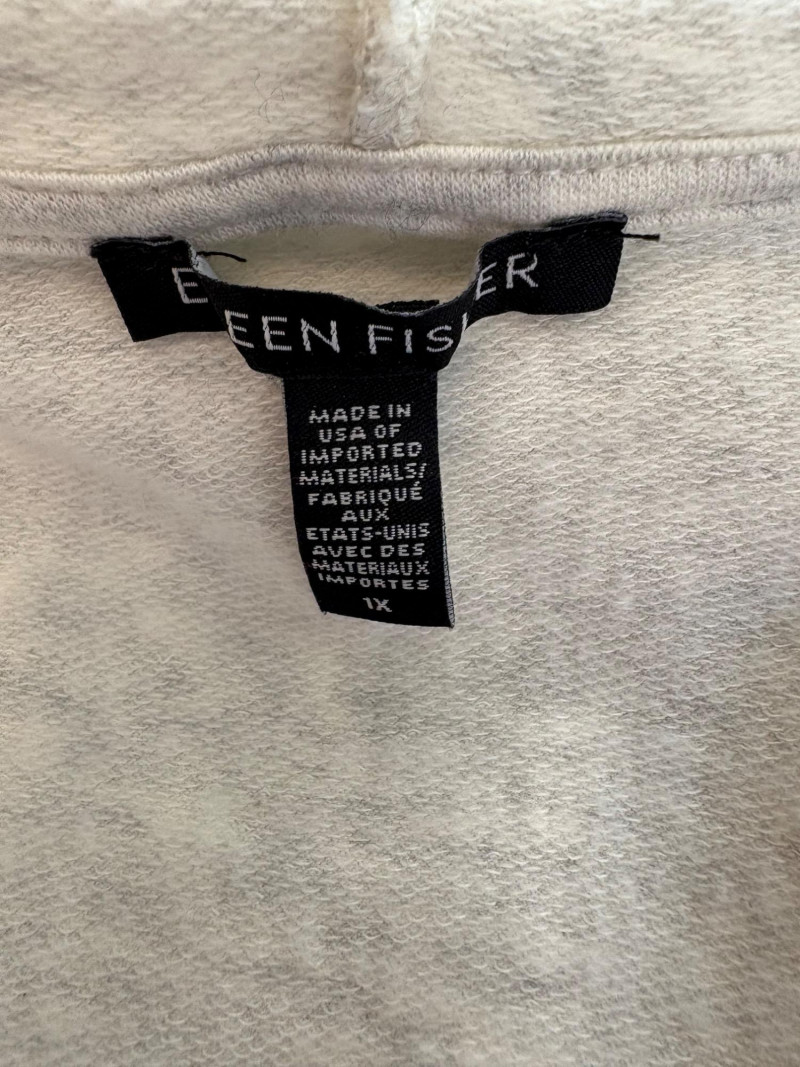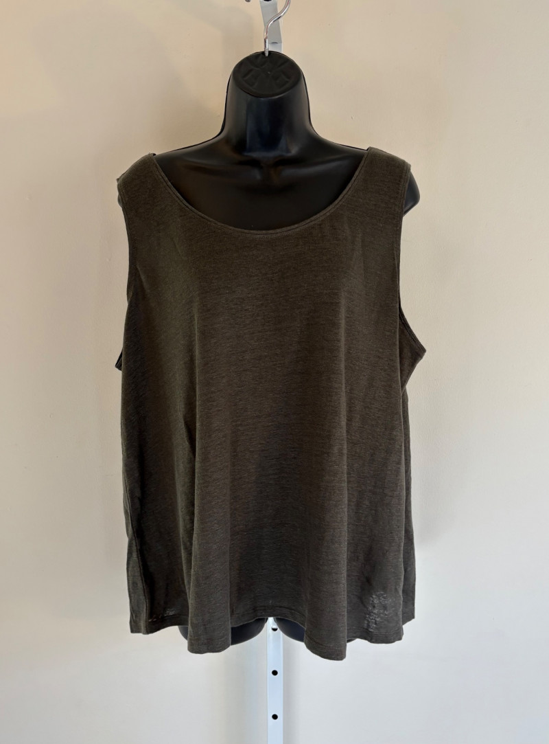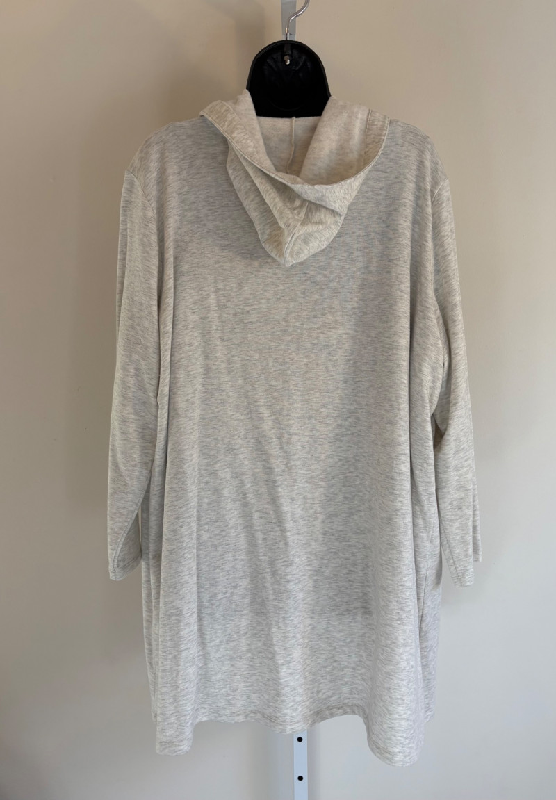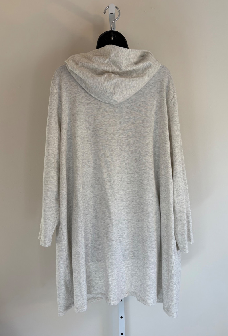 Wonderful pairing From Eileen Fisher of a long white/grey Tencel cardigan & deep grey-green linen tank. Grey-green tank has narrow banding along neckline & armholes. In excellent condition. 100% linen. Measures 23"pit to pit and 21.5" from back scoop neck to bottom hem. Size tag says XL. White-grey super soft cardigan has long sleeves, open front with patch pockets, and hood with interesting construction. In excellent condition. 65% Tencel with 28% cotton and 7% elastane. Measures 25" pit to pit and 33" from back neck seam to back bottom hem. Size tag says 1X.
