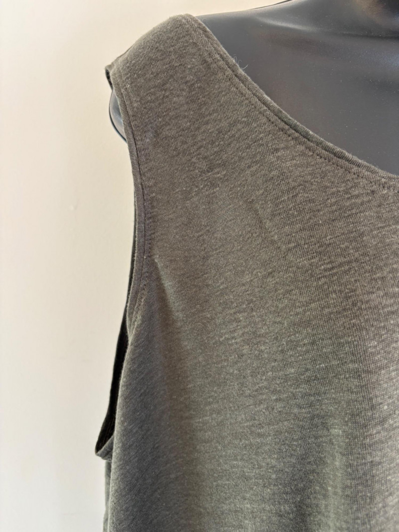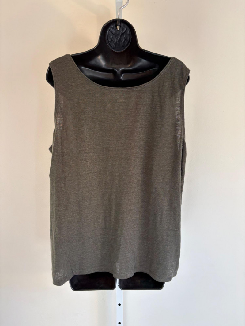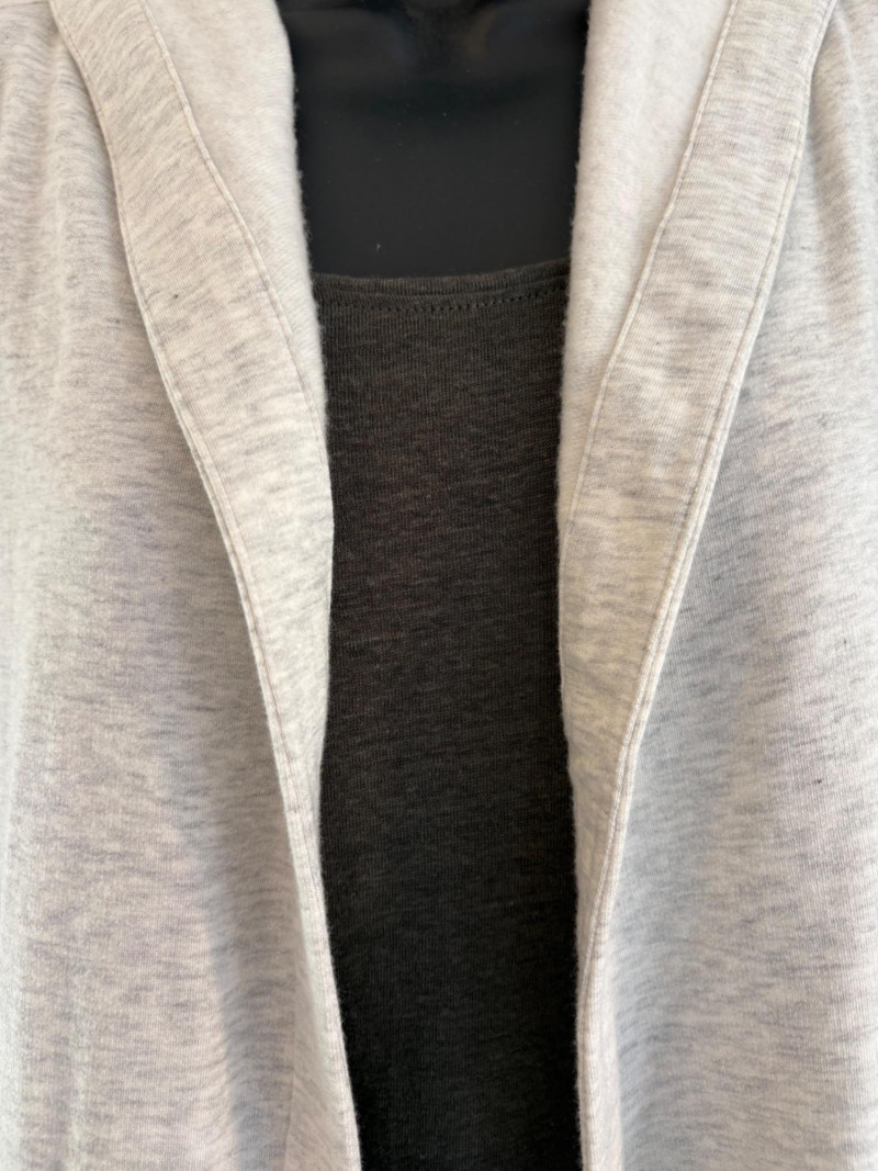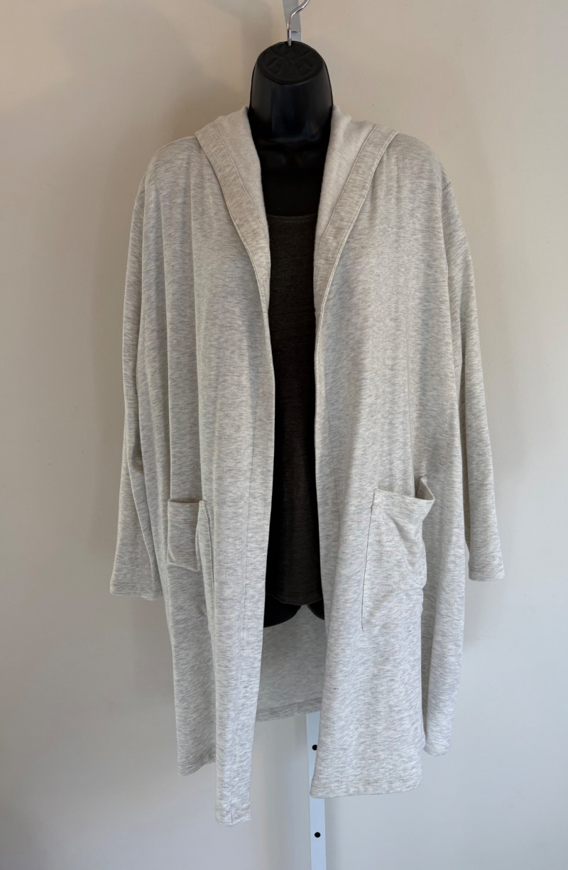 Wonderful pairing From Eileen Fisher of a long white/grey Tencel cardigan & deep grey-green linen tank. Grey-green tank has narrow banding along neckline & armholes. In excellent condition. 100% linen. Measures 23"pit to pit and 21.5" from back scoop neck to bottom hem. Size tag says XL. White-grey super soft cardigan has long sleeves, open front with patch pockets, and hood with interesting construction. In excellent condition. 65% Tencel with 28% cotton and 7% elastane. Measures 25" pit to pit and 33" from back neck seam to back bottom hem. Size tag says 1X.