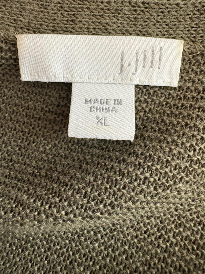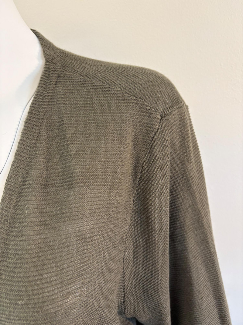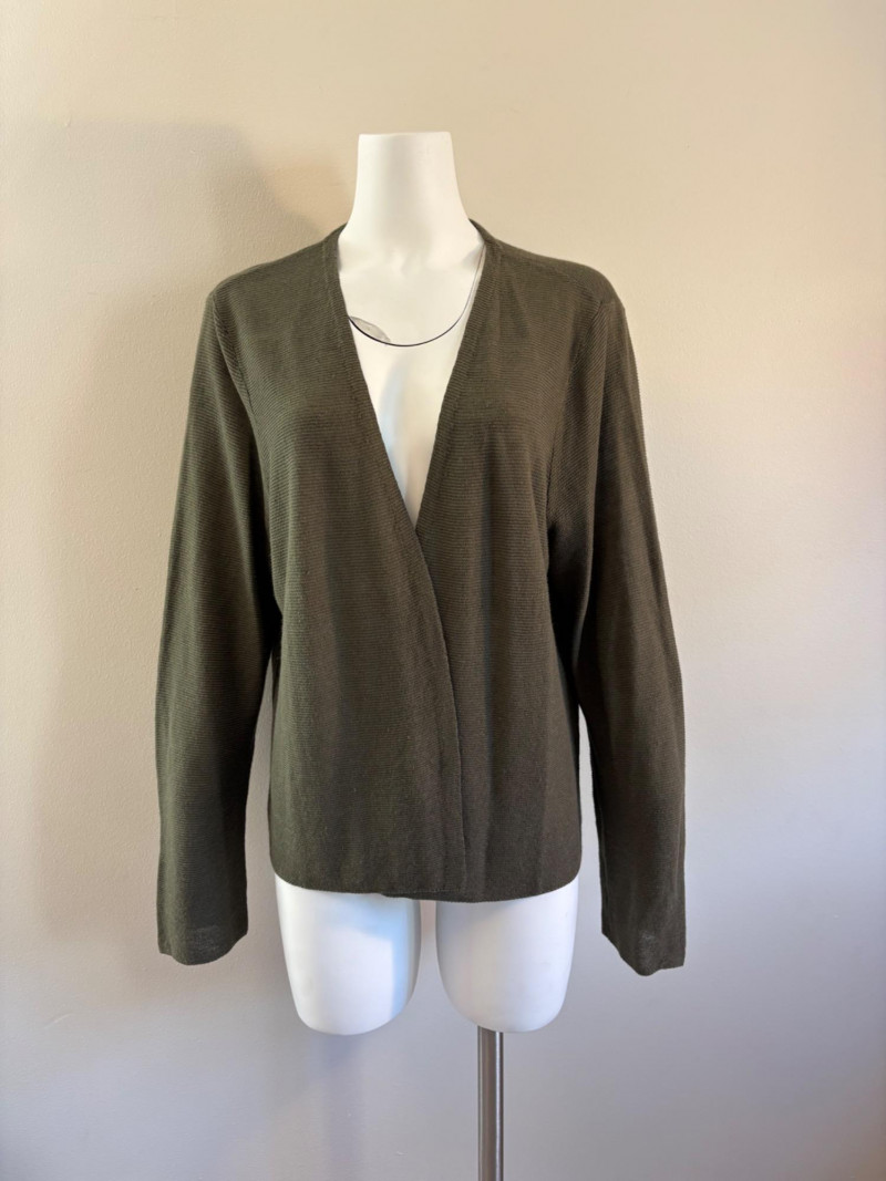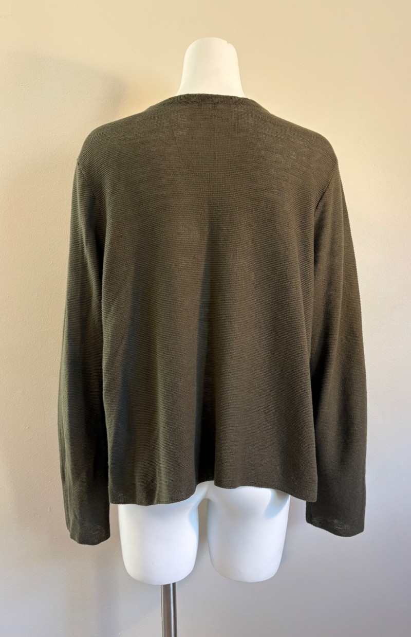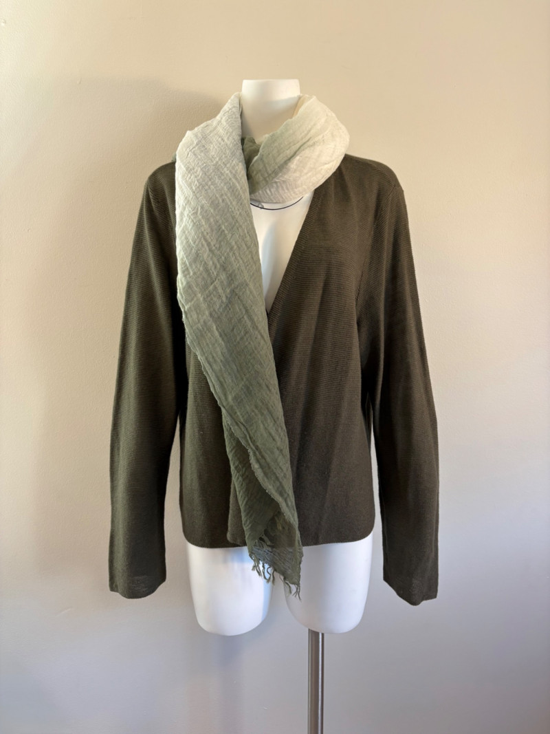 Lovely pairing of Eileen Fisher & J. Jill items. Olive green lightweight knit cardigan from J. Jill has long sleeves, open front, and simple lines. In very good used condition. 59% linen with 22% cotton and 19% model. Measures 23" pit to pit and 23" from back neckline to bottom hem. Size tag says XL. Fabulous green ombre scarf from Eileen Fisher. New with tag. 60% organic linen with 40% cotton. Moves from deep green to white back to green. Measures approx. 28” x 66”.