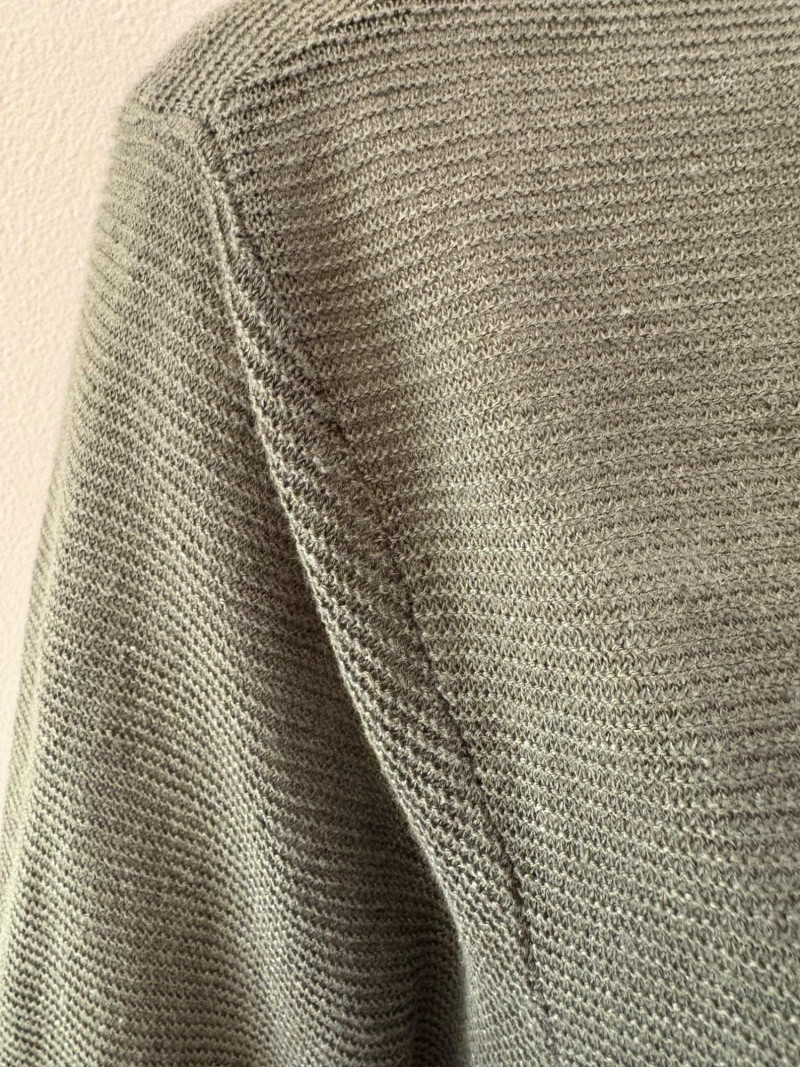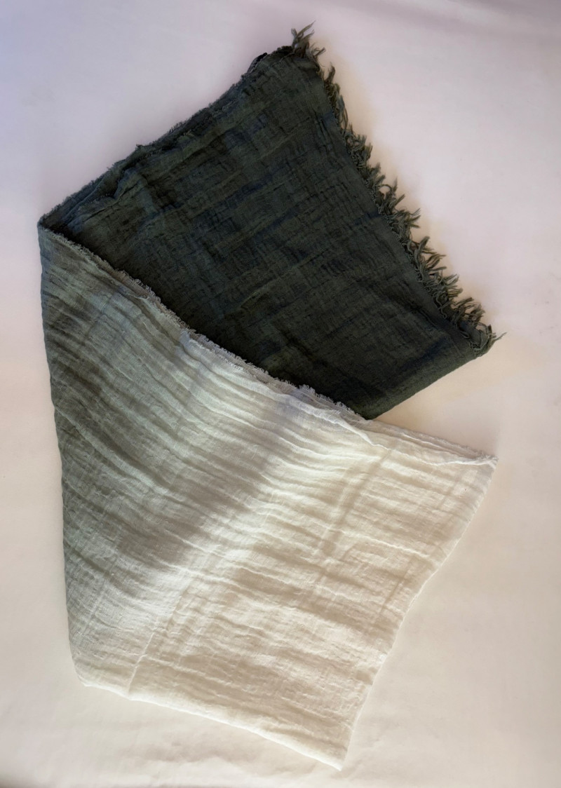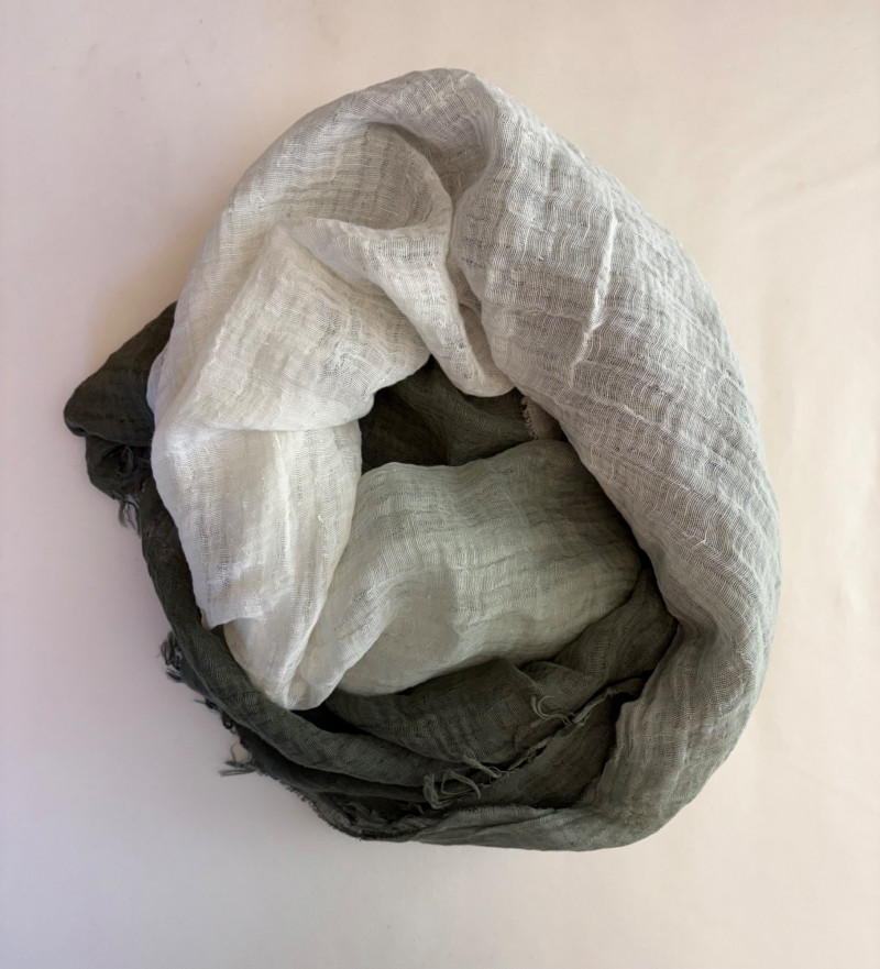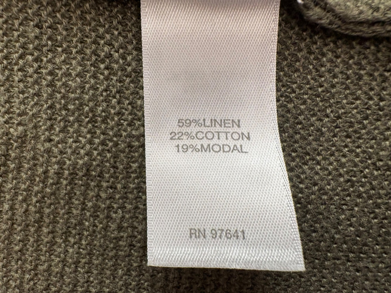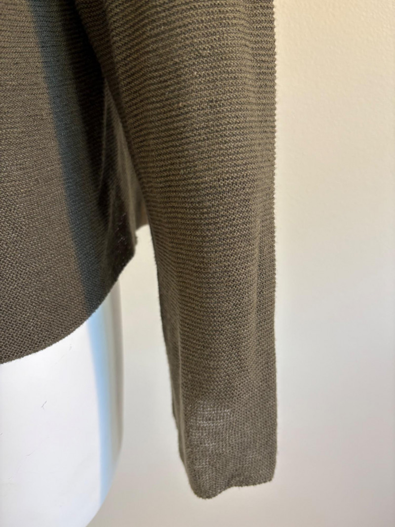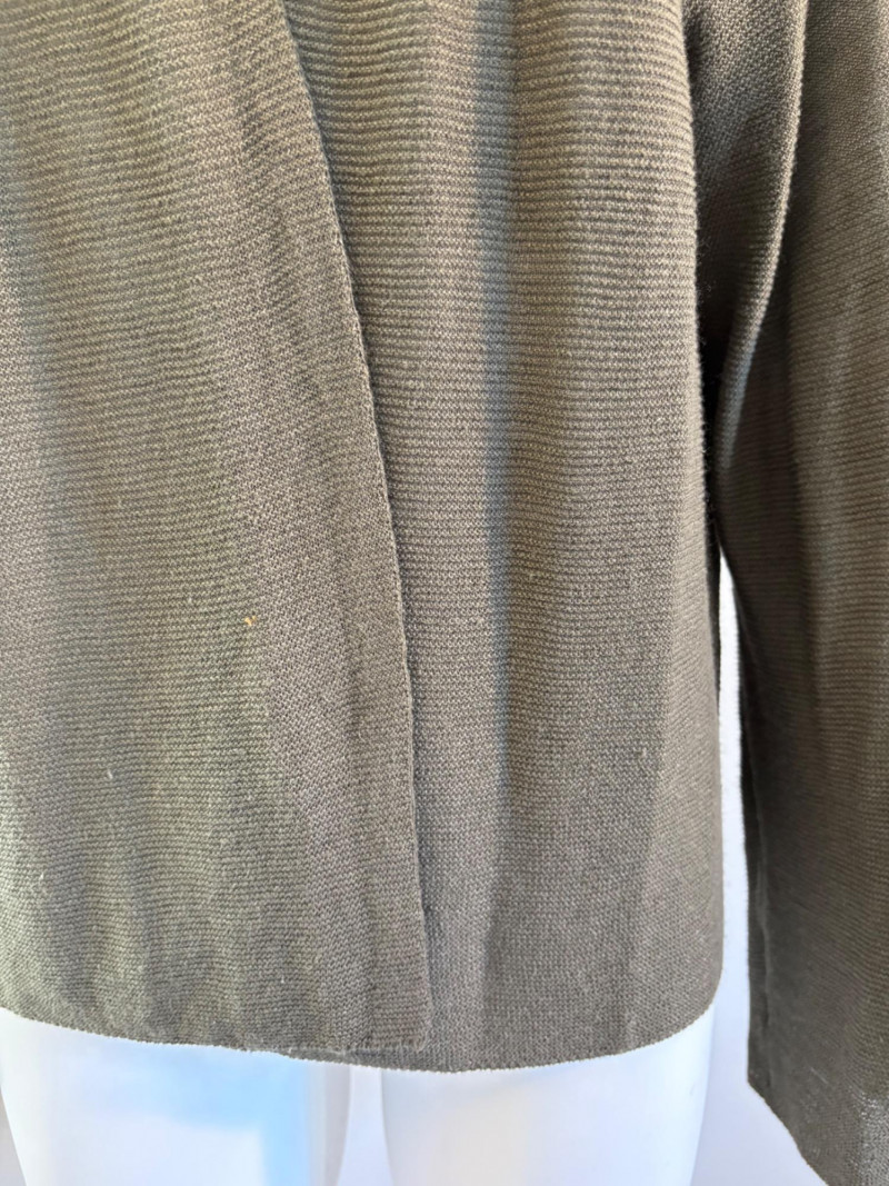 Lovely pairing of Eileen Fisher & J. Jill items. Olive green lightweight knit cardigan from J. Jill has long sleeves, open front, and simple lines. In very good used condition. 59% linen with 22% cotton and 19% model. Measures 23" pit to pit and 23" from back neckline to bottom hem. Size tag says XL. Fabulous green ombre scarf from Eileen Fisher. New with tag. 60% organic linen with 40% cotton. Moves from deep green to white back to green. Measures approx. 28” x 66”.