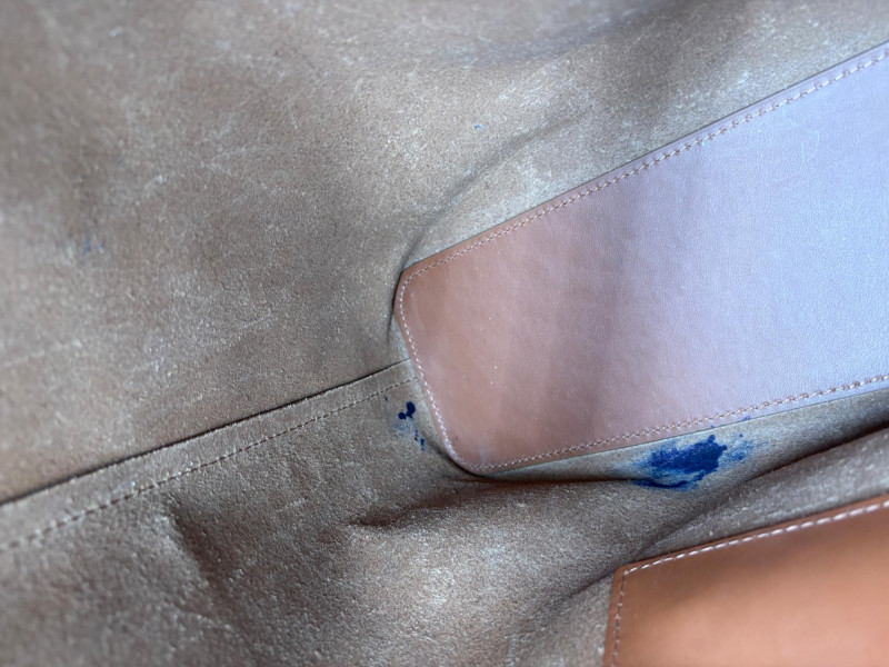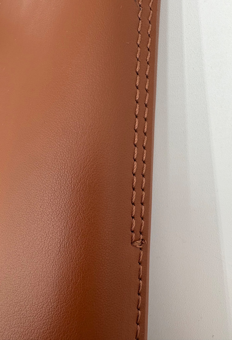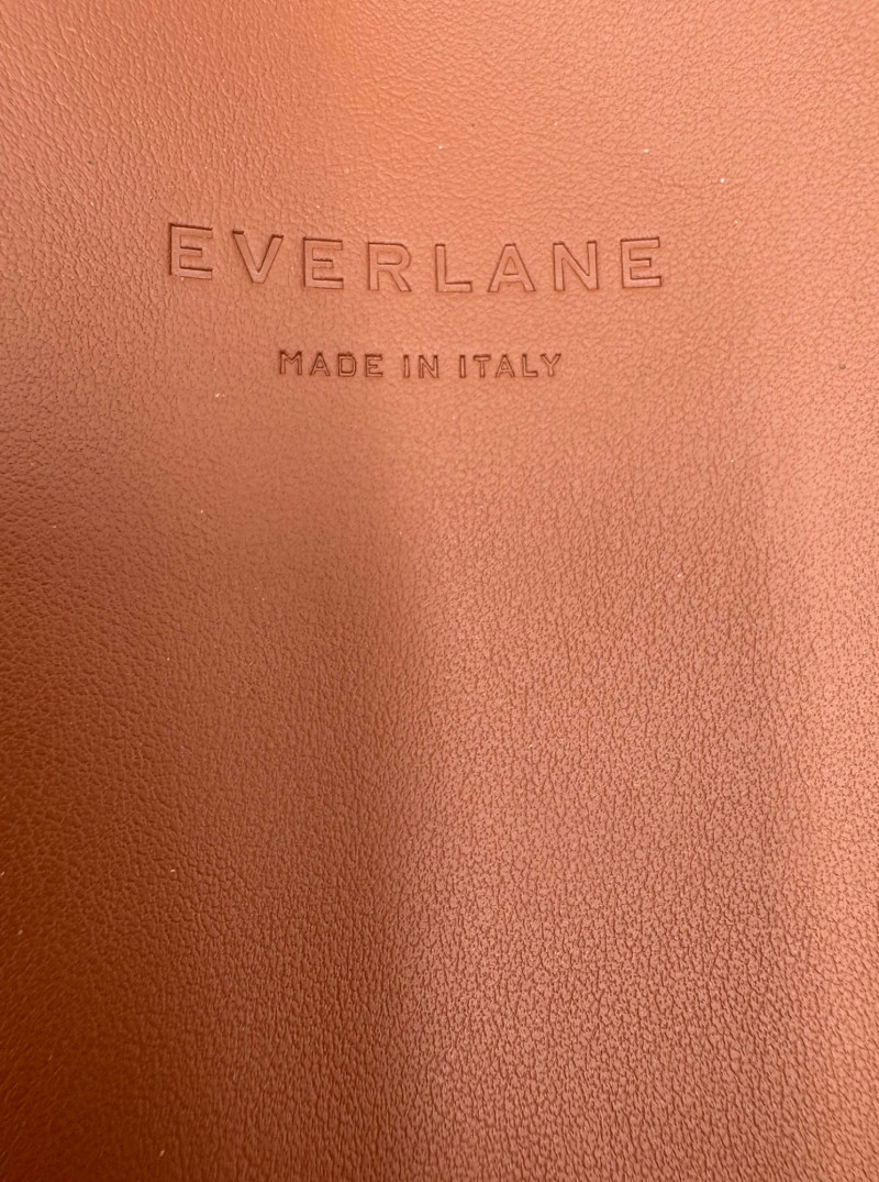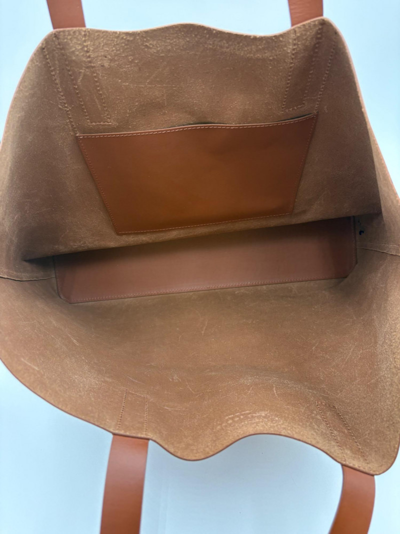 High quality minimalist styling from Everlane. Roomy brown leather tote with simple top stitching, squared off straps, reinforced bottom, and one internal leather pocket. In beautiful condition with the exception of a couple ink marks on the bottom interior - please see last photo. Measures 13" H x 16.5" W with a 10" drop from top of the straps to top of the tote.
