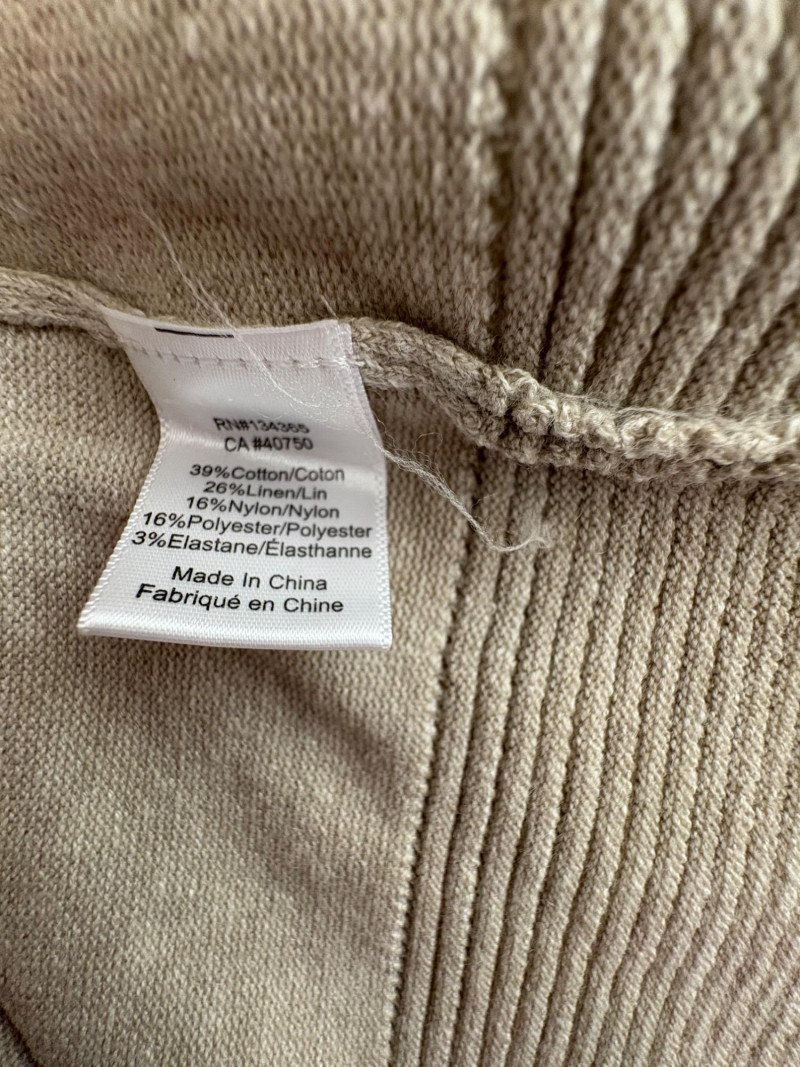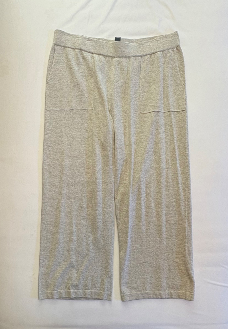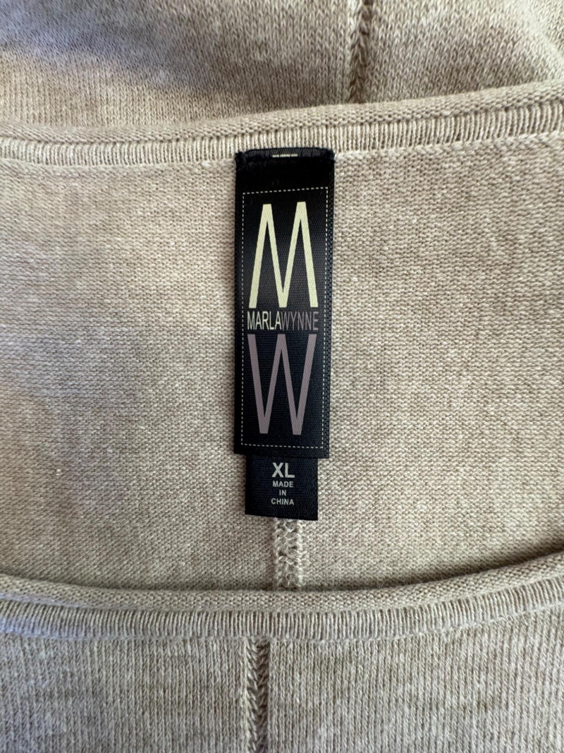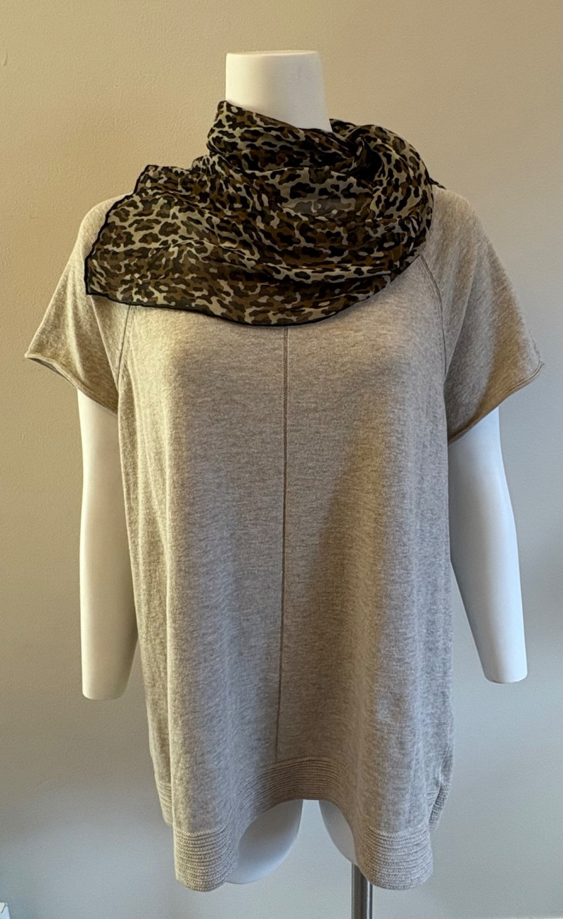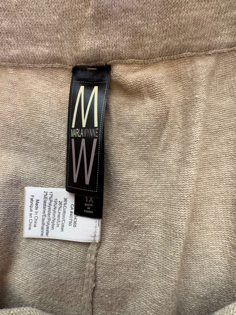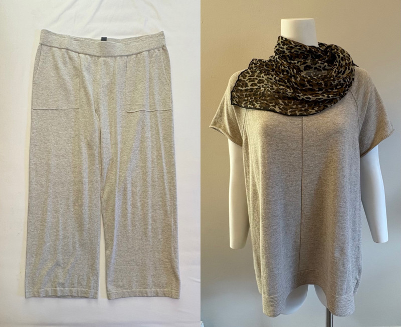 Beige-taupe knit pants and top from Marla Wynne with matching scarf from unknown maker. Top has scoop neck, raglan sleeves, decorative seam joins, and a wide decorative band at the waist. In very good used condition. 36% cotton, 28% linen, 16% nylon, 16% polyester, and 3% elastane. Measures 23.5" pit to pit and 26" from back neckline to back hemline. Size tag says XL. Knit pants have wide flat elasticated waistband, set-in/patch side front pockets, and straight legs. In very good used condition. 36% cotton, 26% linen, 18% nylon, 17% polyester, and 2% elastin. Measure 18.5" side to side at waist with 25" inseam. Size tag says 1X. Vintage animal print scarf has no maker or fabric tag but feels like synthetic blended with silk.. Measures approximately 16"x 42".