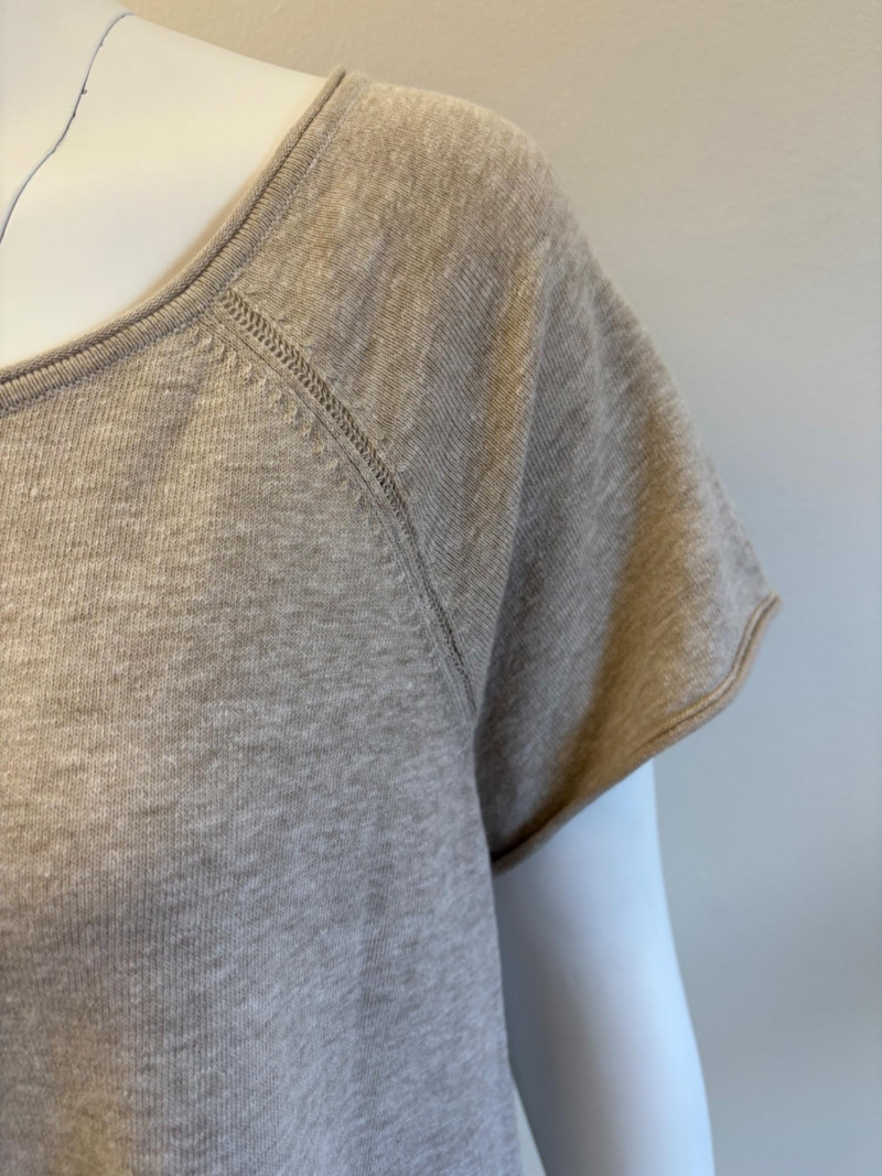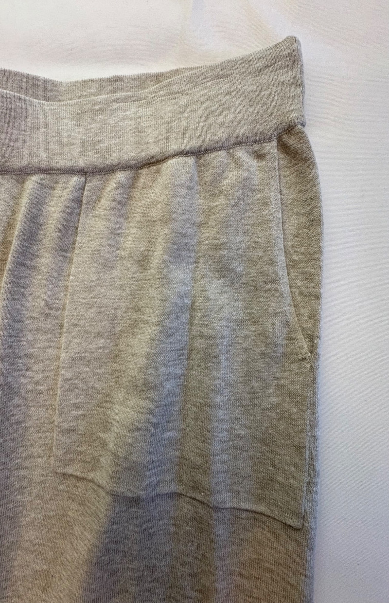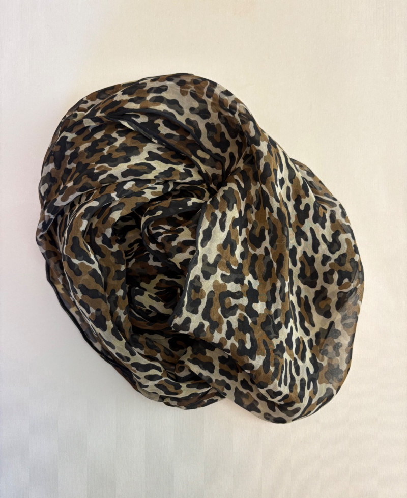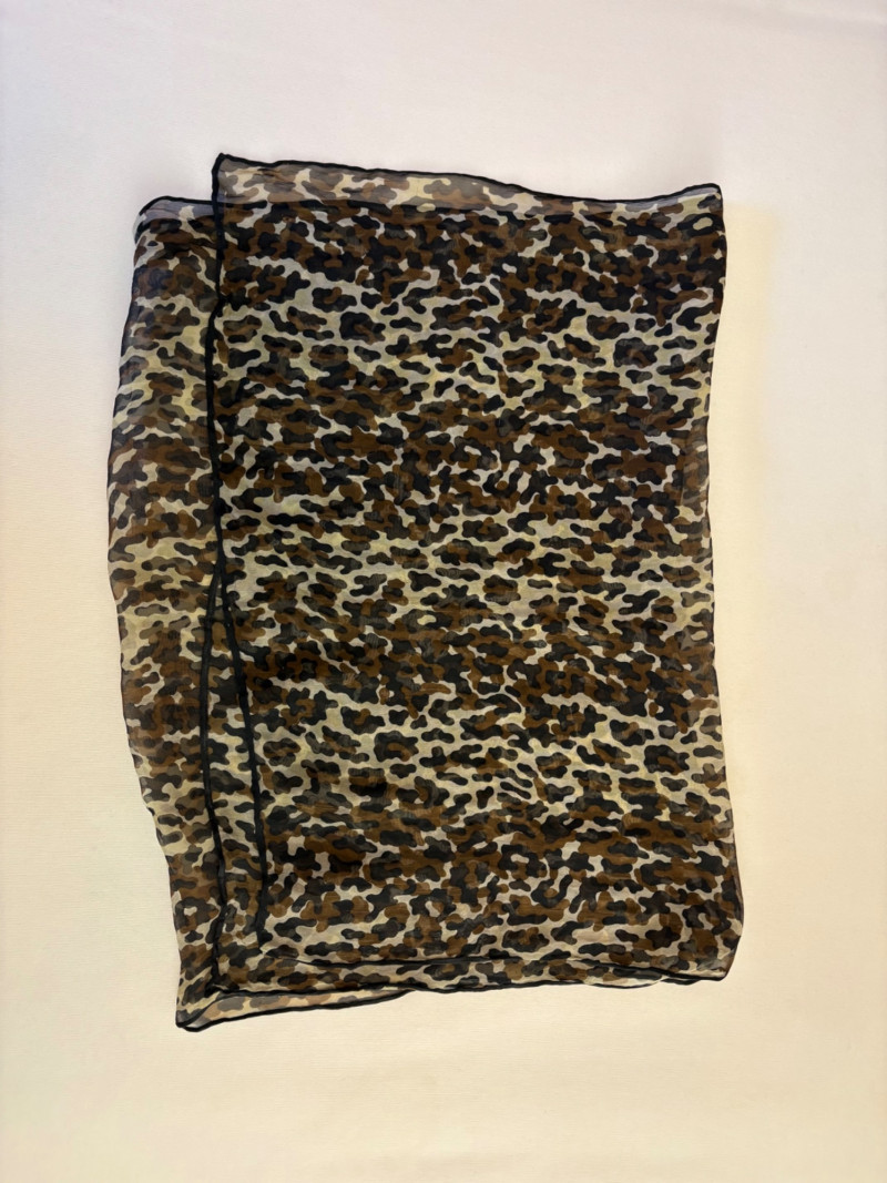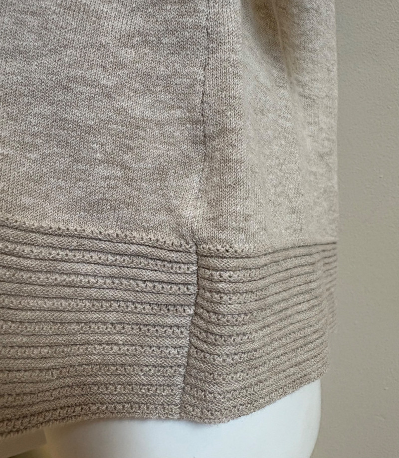 Beige-taupe knit pants and top from Marla Wynne with matching scarf from unknown maker. Top has scoop neck, raglan sleeves, decorative seam joins, and a wide decorative band at the waist. In very good used condition. 36% cotton, 28% linen, 16% nylon, 16% polyester, and 3% elastane. Measures 23.5" pit to pit and 26" from back neckline to back hemline. Size tag says XL. Knit pants have wide flat elasticated waistband, set-in/patch side front pockets, and straight legs. In very good used condition. 36% cotton, 26% linen, 18% nylon, 17% polyester, and 2% elastin. Measure 18.5" side to side at waist with 25" inseam. Size tag says 1X. Vintage animal print scarf has no maker or fabric tag but feels like synthetic blended with silk.. Measures approximately 16"x 42".