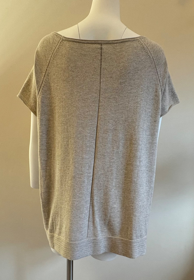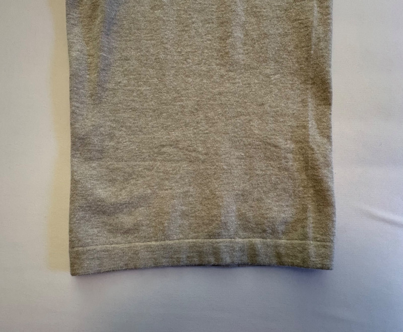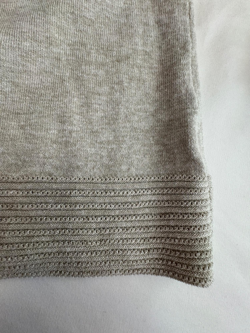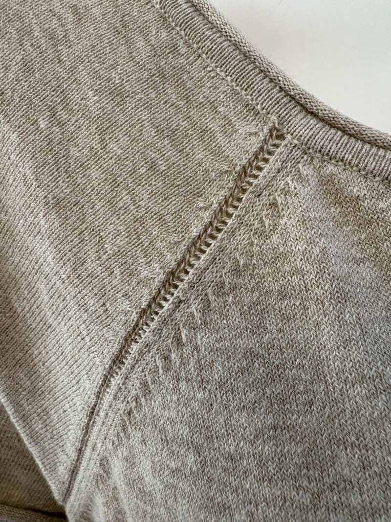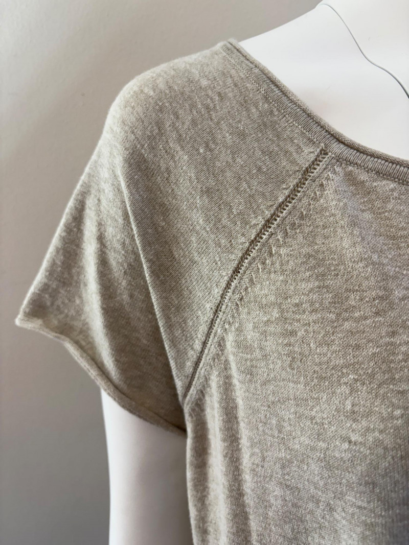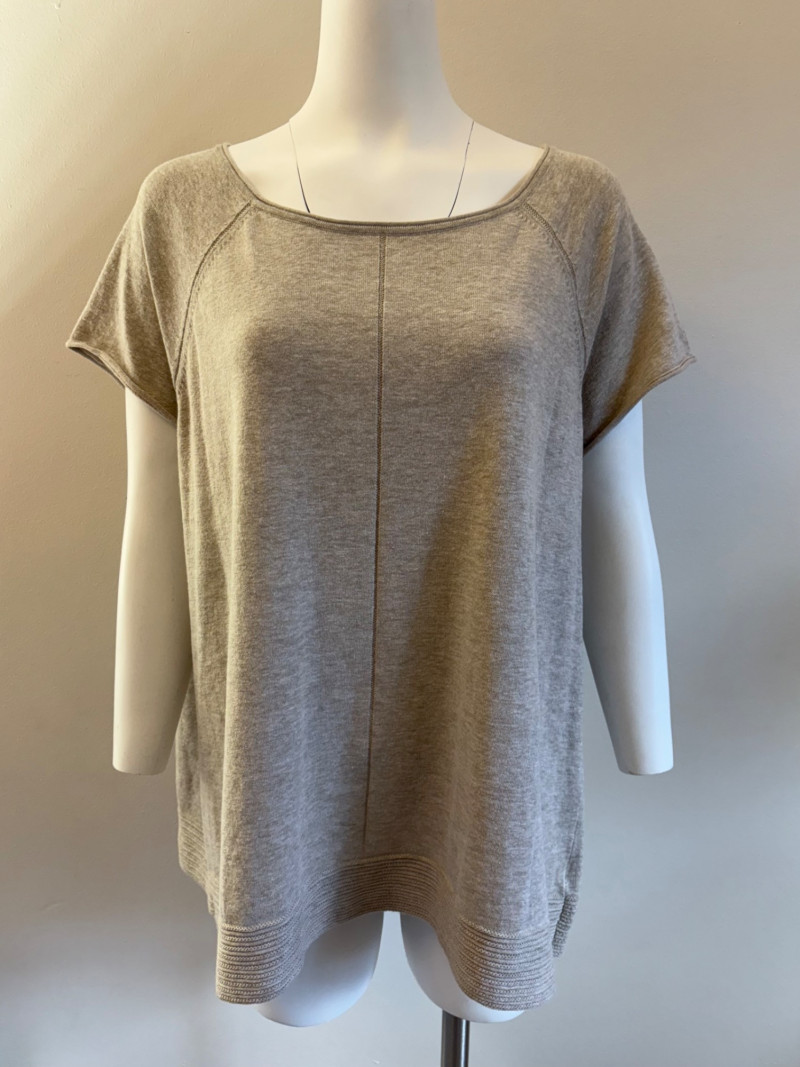 Beige-taupe knit pants and top from Marla Wynne with matching scarf from unknown maker. Top has scoop neck, raglan sleeves, decorative seam joins, and a wide decorative band at the waist. In very good used condition. 36% cotton, 28% linen, 16% nylon, 16% polyester, and 3% elastane. Measures 23.5" pit to pit and 26" from back neckline to back hemline. Size tag says XL. Knit pants have wide flat elasticated waistband, set-in/patch side front pockets, and straight legs. In very good used condition. 36% cotton, 26% linen, 18% nylon, 17% polyester, and 2% elastin. Measure 18.5" side to side at waist with 25" inseam. Size tag says 1X. Vintage animal print scarf has no maker or fabric tag but feels like synthetic blended with silk.. Measures approximately 16"x 42".