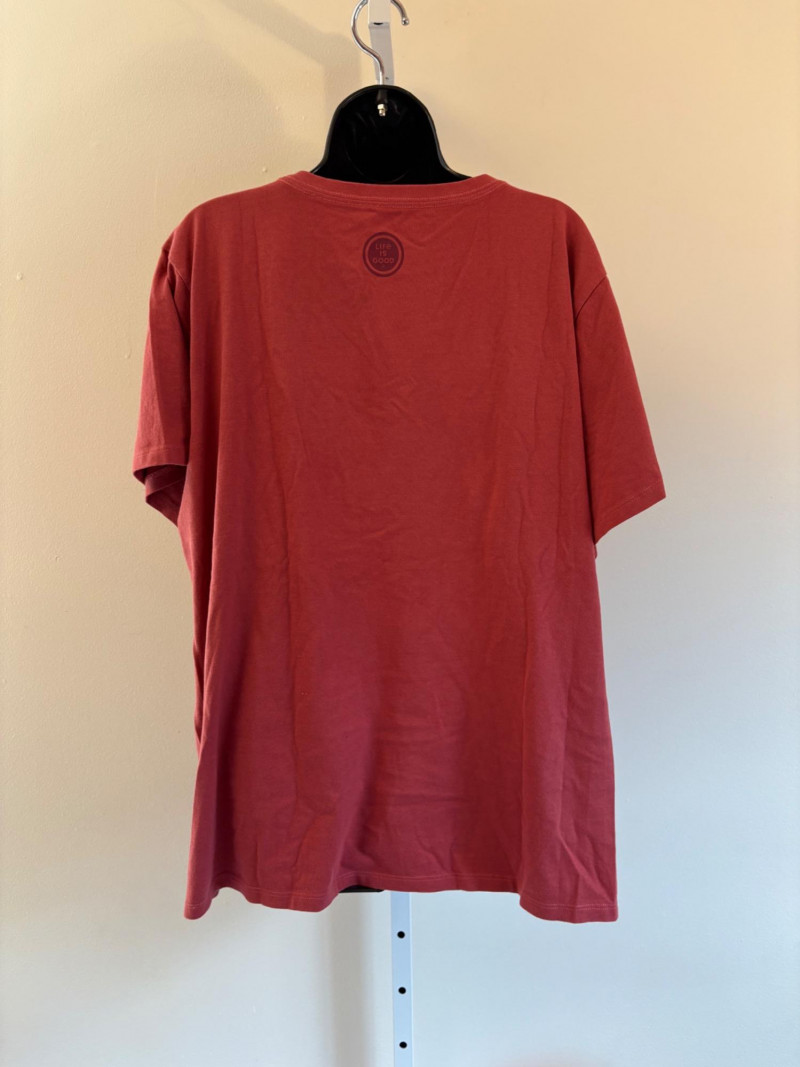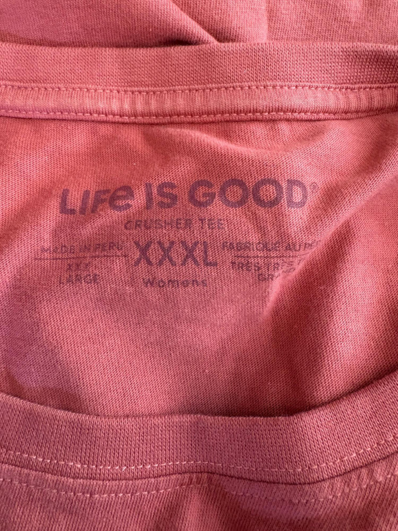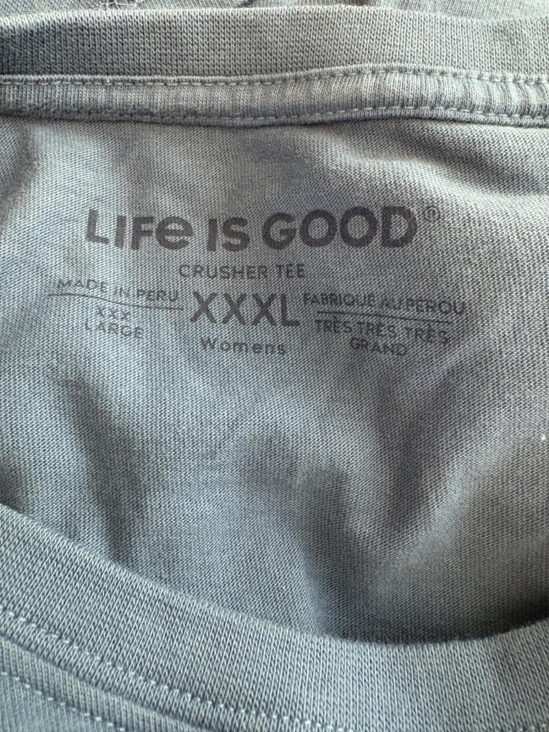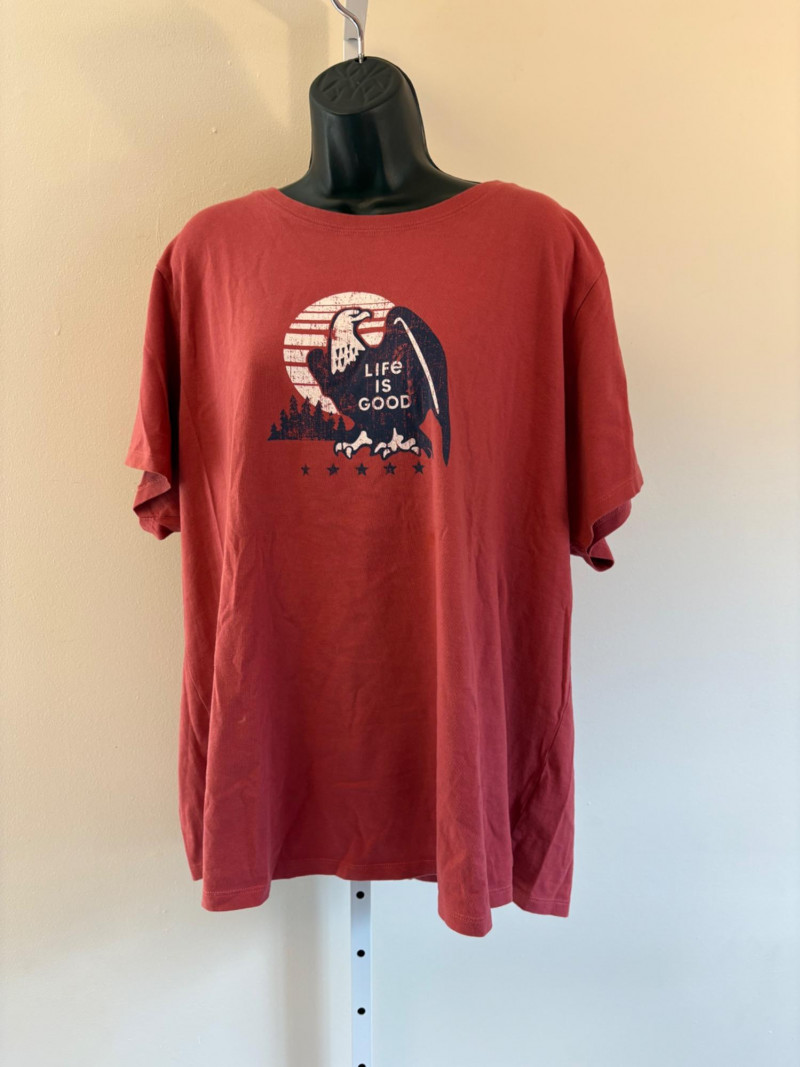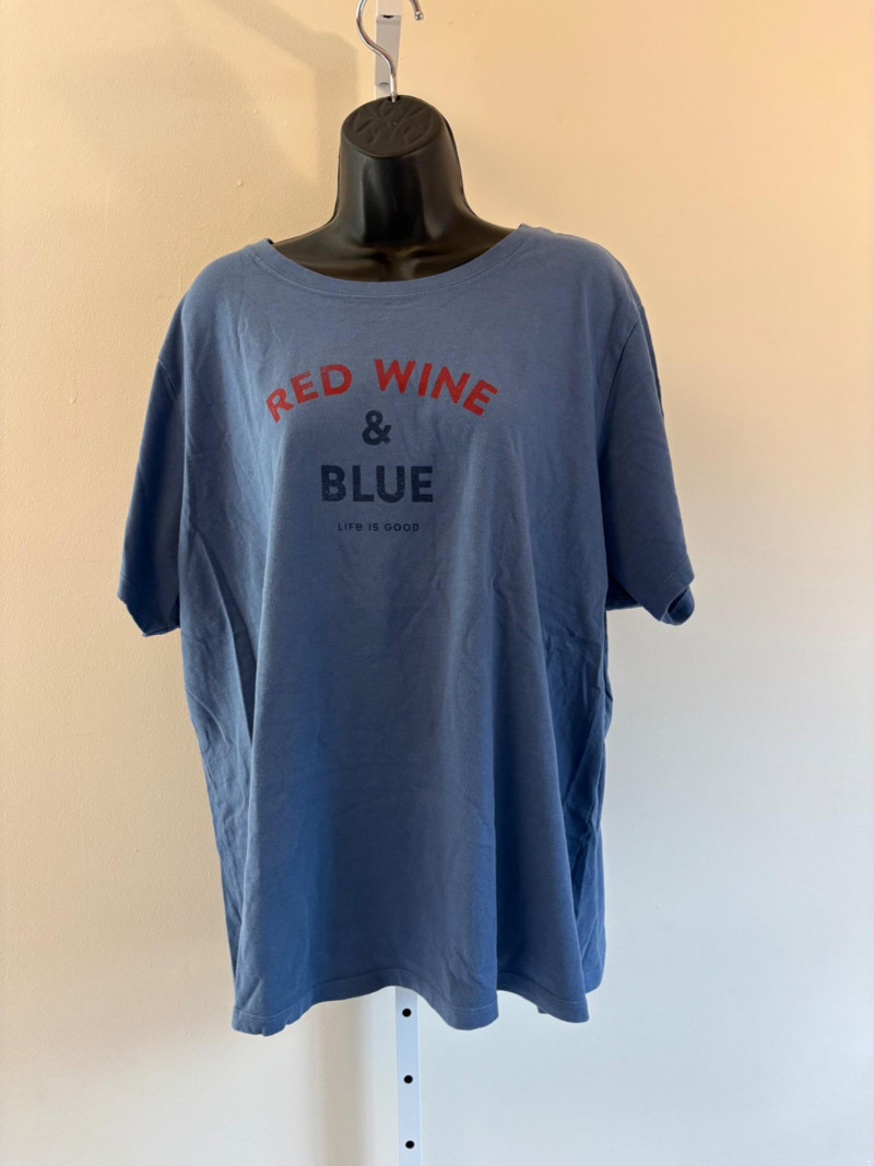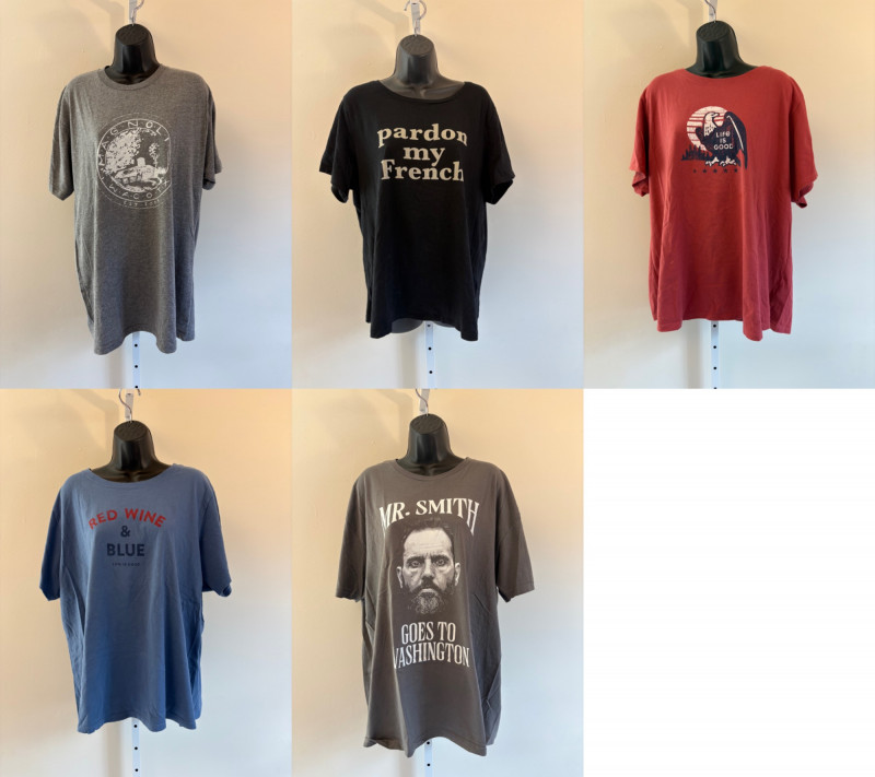 Group of 5 printed t-shirts in very good condition. All 100% cotton except for the Waco one which is a blend. "Red, Wine & Blue" from Life Is Good. Measures 26.5" pit to pit and 27" from back neckline to hem. Size tag says XXXL. "Life is Good" eagle from Life Is Good. Measures 27" pit to pit and 27.5" from back neckline to hem. Size tag says XXXL. We noticed a small discoloration while doing photos, but it was so faint we could barely get it to show up - see photo in this section. "Pardon My French" from Old Navy. Measures 22.5" pit to pit and 25.5" from back neckline to bottom hem. Size tag says XL. "Mr. Smith Goes To Washington" from maker unknown. Measures 24" pit to pit and 29.5" from back neckline to bottom hem. Size tag says 2XL. "Magnolia - Waco, Texas" from Next Level Apparel. Measures 22.5" pit to pit and 30" from back neckline to bottom hem. Size tag says XL.