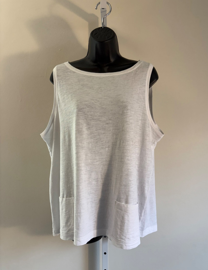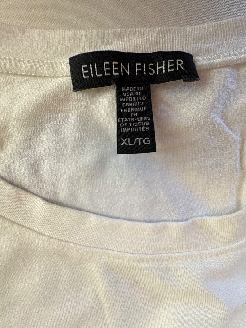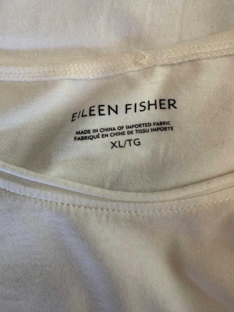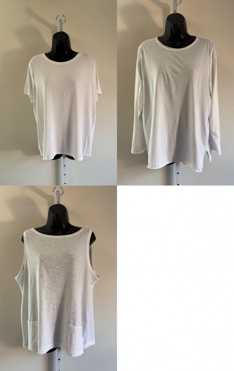 Basic white t-shirts are always a great building block - here are 3 from Eileen Fisher in slightly different styles. All are in excellent condition & measure approx. 22.5" pit to pit and 24" from back neckline to hem. Long sleeve shirt is 100% cotton. Size tag says XL. Tank is 100% cotton. Size tag says L/G. Short sleeve shirt is 95% viscose with 5% spandex. Size tag says XL.