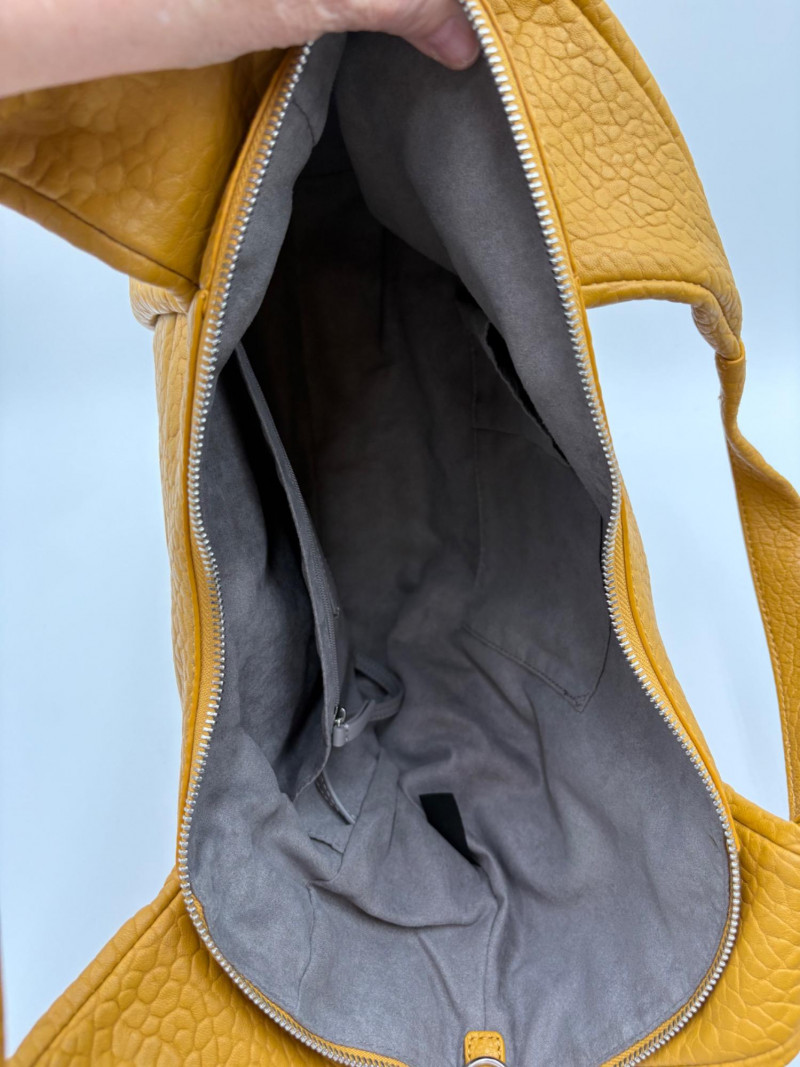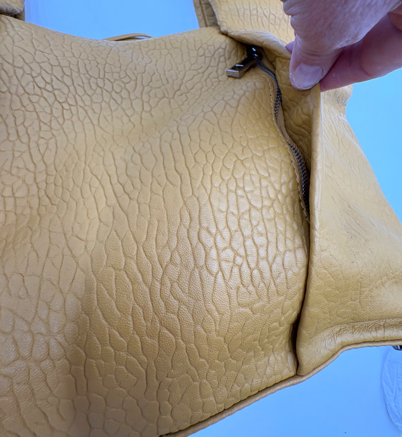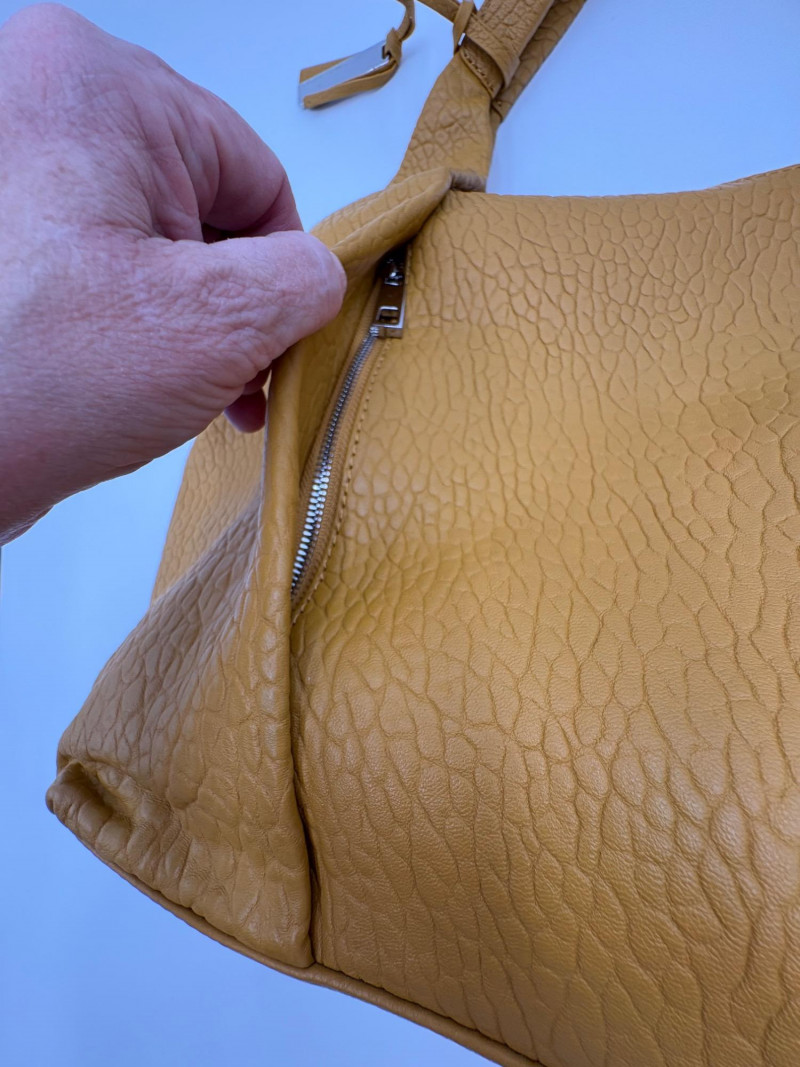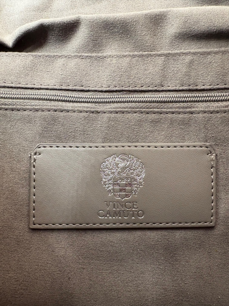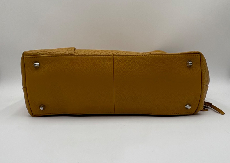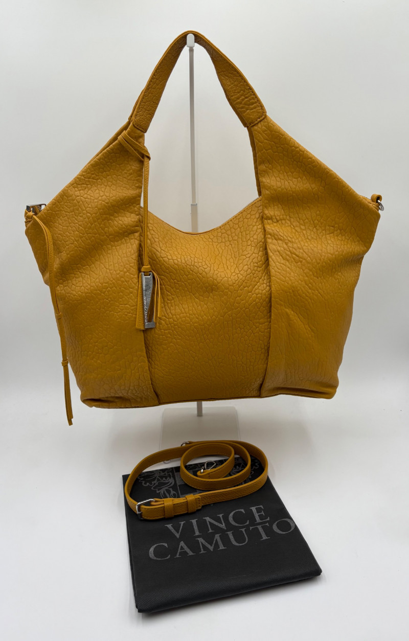 Larger size purse from Vince Camuto in soft mustard-colored leather. Silver hardware with curved zip closure top, thick exterior straps that wrap to the bottom of the bag, and back slide pocket with magnetic closure. Front has two hidden zippered pockets underneath the edges of the straps. Interior lining in gray fabric with large side slide pocket, zipper pocket; and multiple small slide pockets. Small protective feet on base and leather zipper pull. Also included is a dust bag and adjustable shoulder strap. Appears to be new and unused. Measures 10" H x 13" W with a 9" drop from the top of the handle straps to the top of the purse.