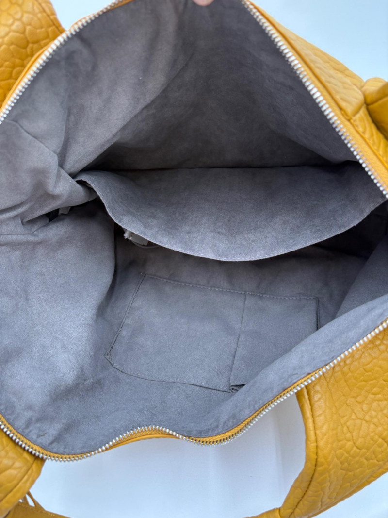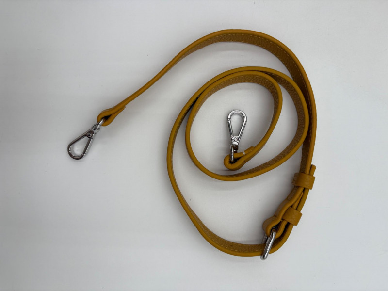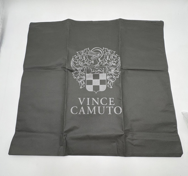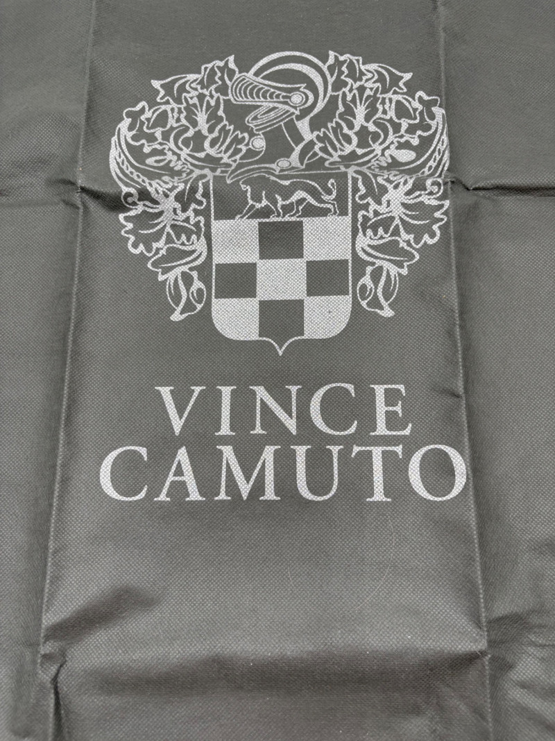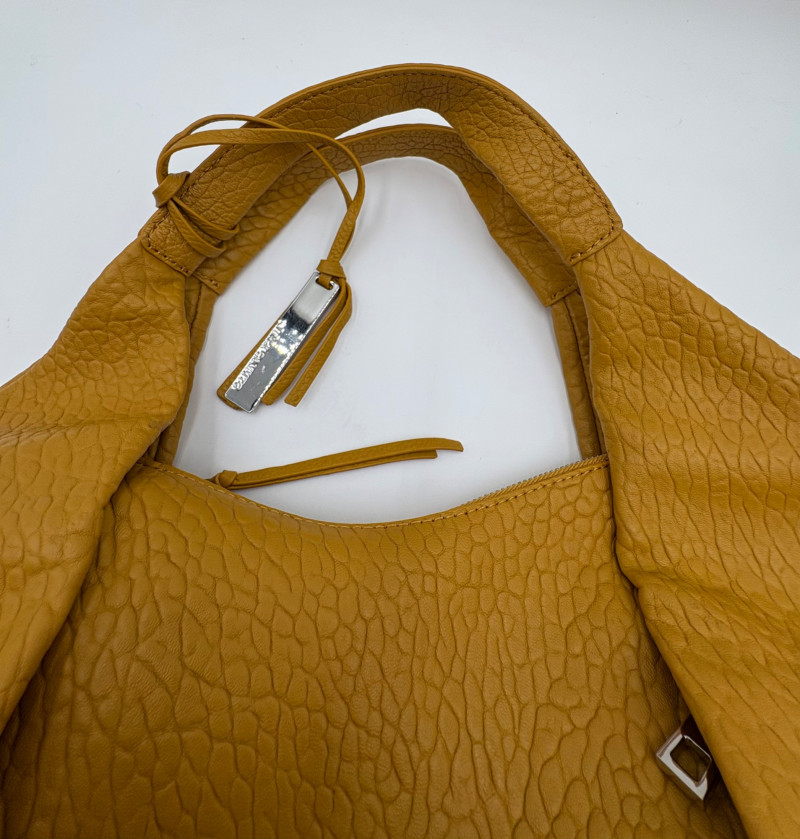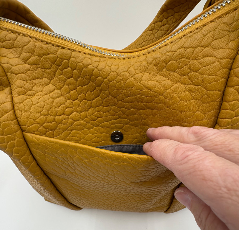 Larger size purse from Vince Camuto in soft mustard-colored leather. Silver hardware with curved zip closure top, thick exterior straps that wrap to the bottom of the bag, and back slide pocket with magnetic closure. Front has two hidden zippered pockets underneath the edges of the straps. Interior lining in gray fabric with large side slide pocket, zipper pocket; and multiple small slide pockets. Small protective feet on base and leather zipper pull. Also included is a dust bag and adjustable shoulder strap. Appears to be new and unused. Measures 10" H x 13" W with a 9" drop from the top of the handle straps to the top of the purse.