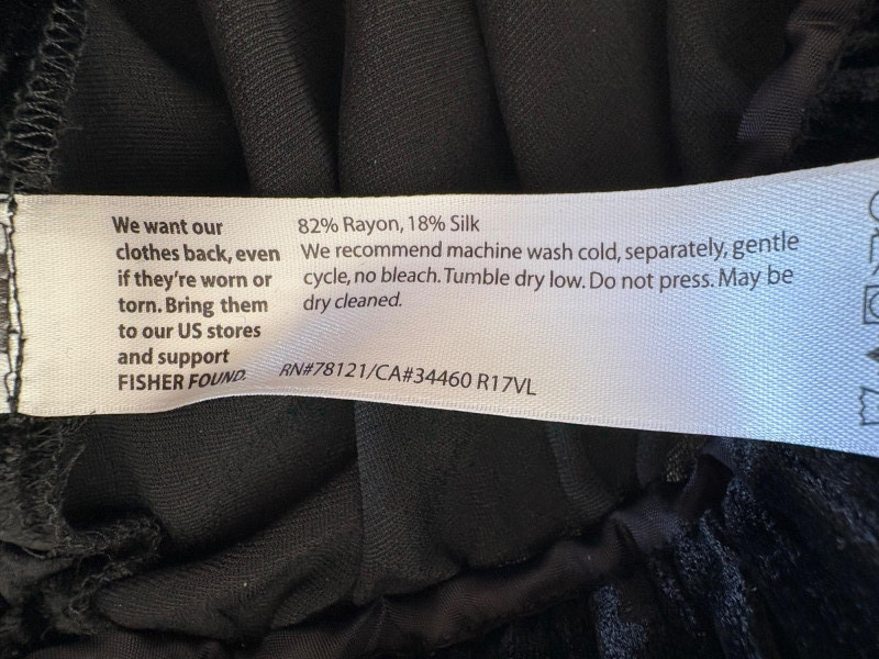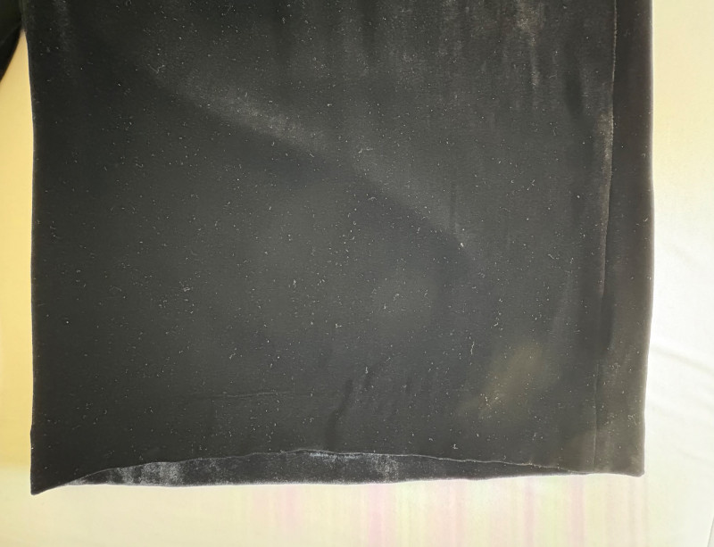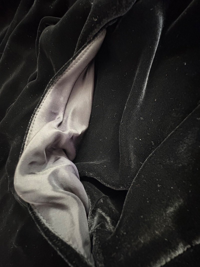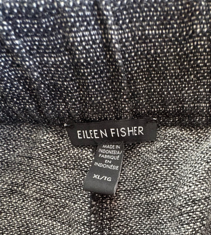 2 pairs of wide leg dress pants from Eileen Fisher. Black & white woven pair has wide elasticated waistband, wide legs with side panels, in-seam pockets toward the front, and zip fly front closure with button. In excellent condition. 55% hemp with 45% cotton. Measure 19" side to side at waist with 26.5" inseam. Size tag says XL. Black velvet pair have flat elasticated waistband, front waistline pleats, set-in side front pockets lined with satin, and wide legs. In very good condition. 82% rayon with 18% silk. Measure 19" side to side at waist with 28.5" inseam. Size tag says XL.