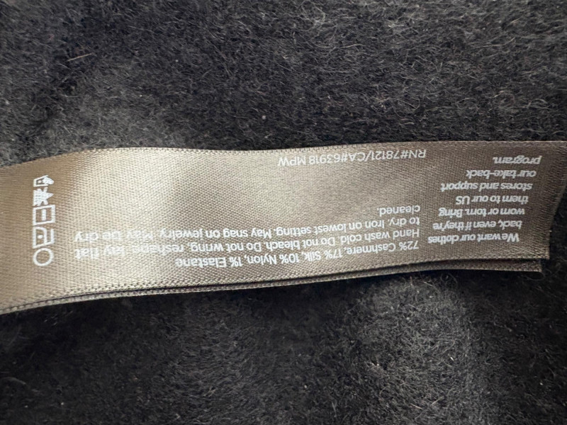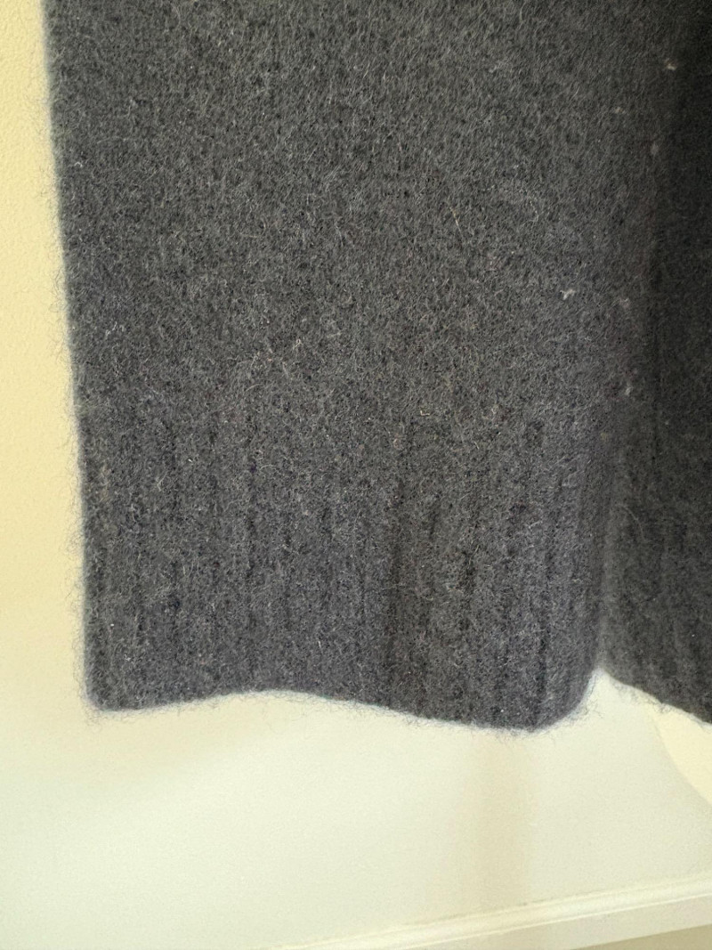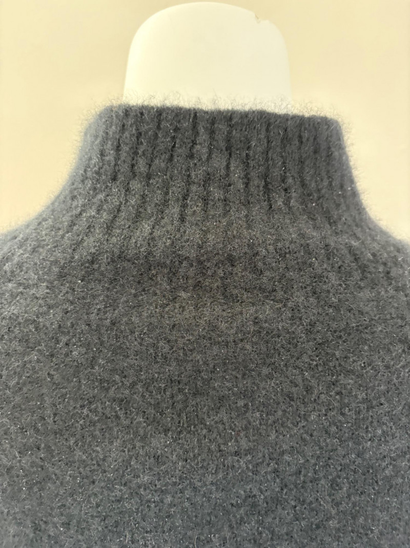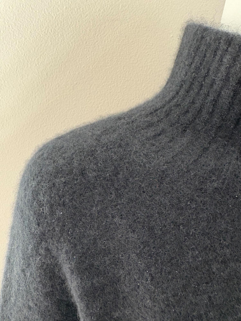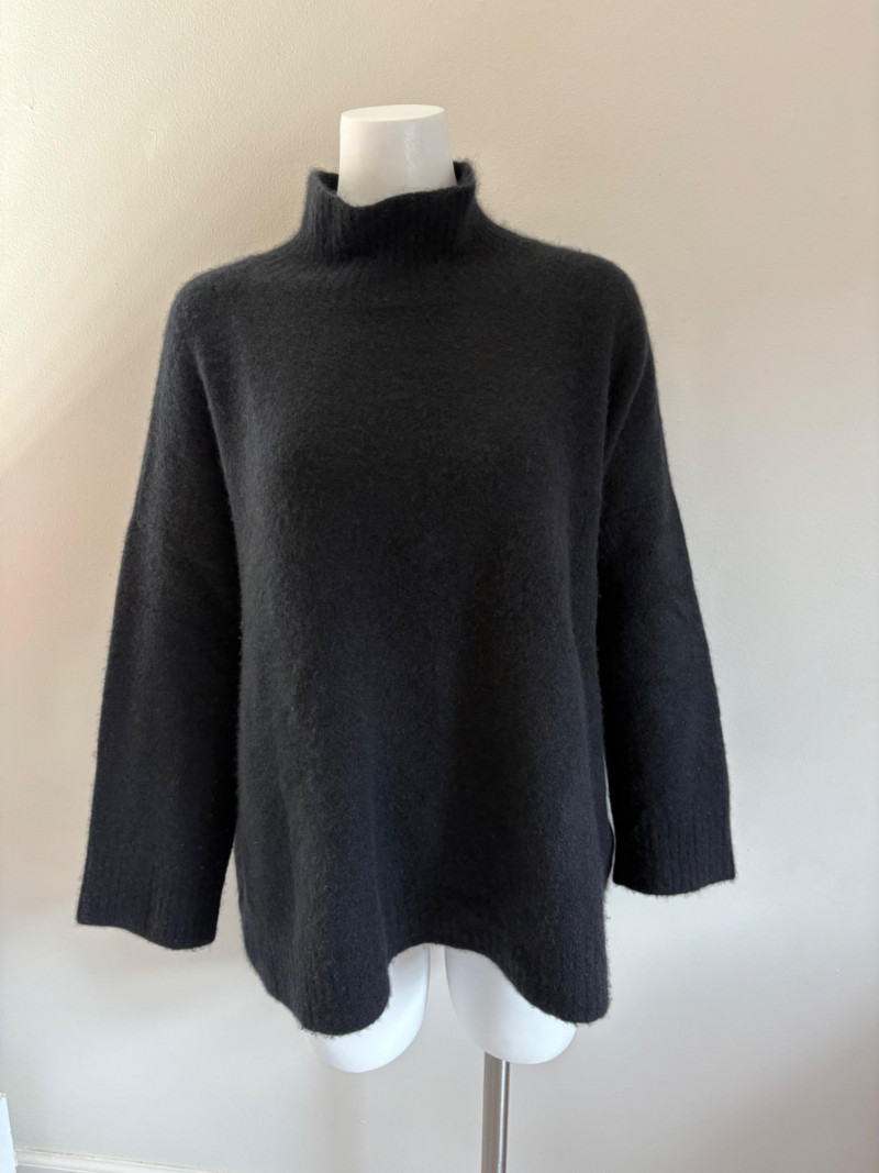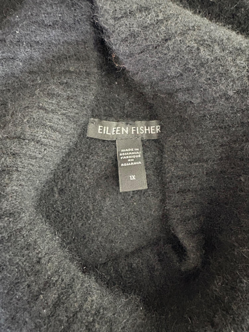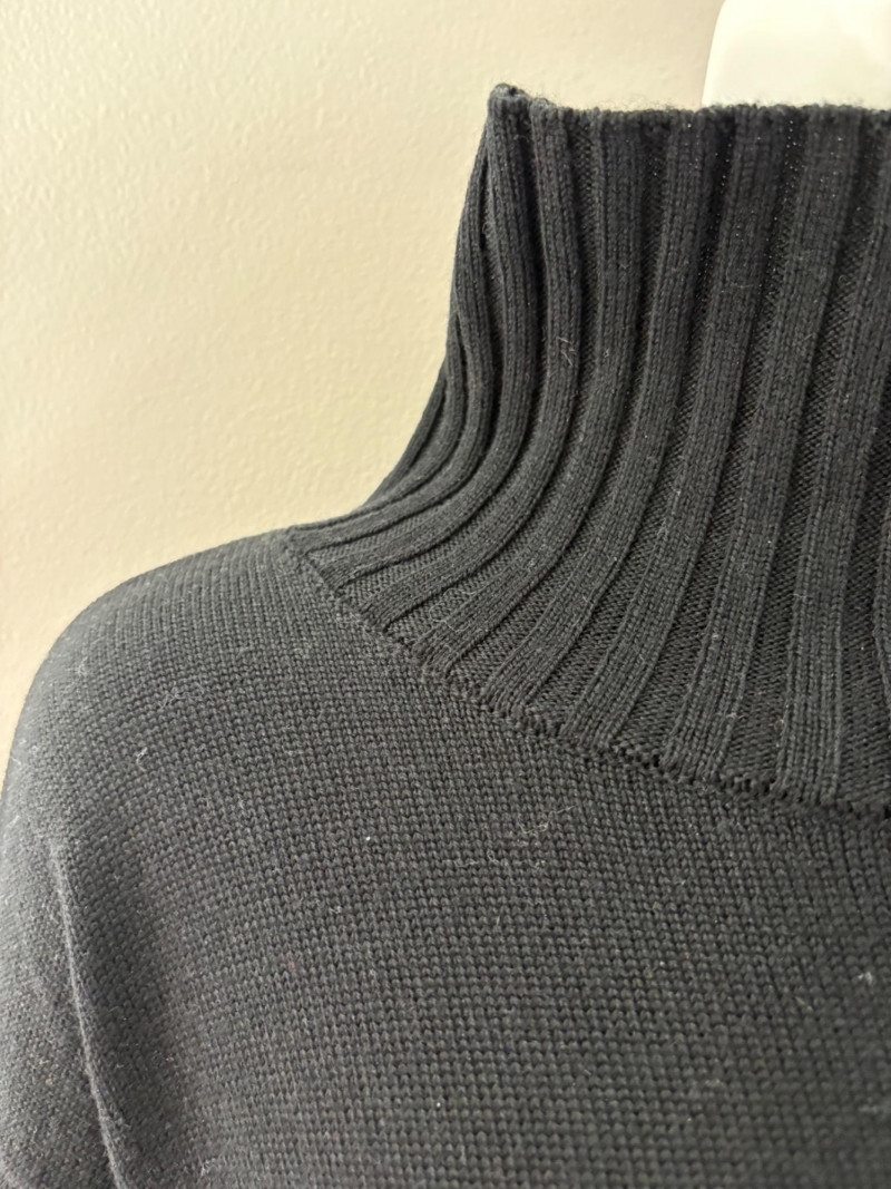 Heavyweight black cashmere sweater from Eileen Fisher has ribbed turtleneck, dropped shoulder seams, and straight-cut body. In excellent condition. 72% cashmere, 17% silk, 10% nylon, and 1% elastane. (Blending silk with with cashmere reduces cashmere’s tendency stretch out of shape without affecting its soft hand or significantly reducing its insulating properties.) Measures 28" pit to pit and 25" from center back neck seam to back hemline. Size tag says 1X.