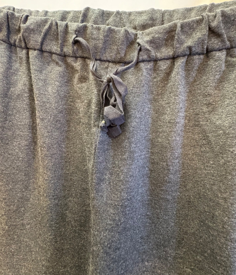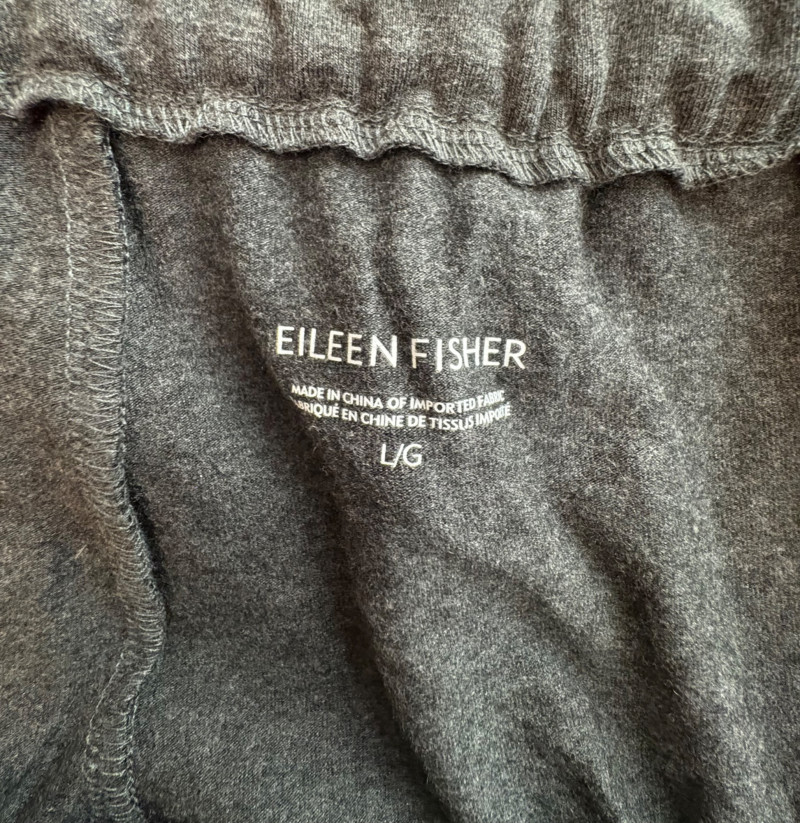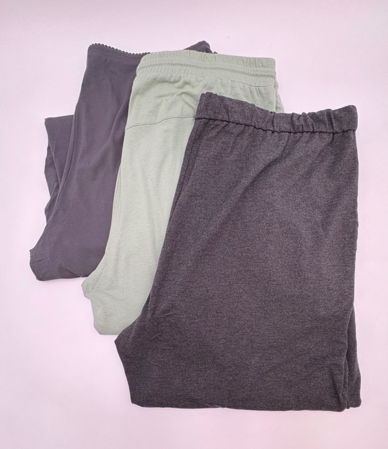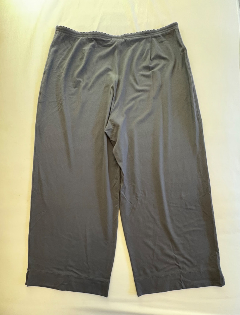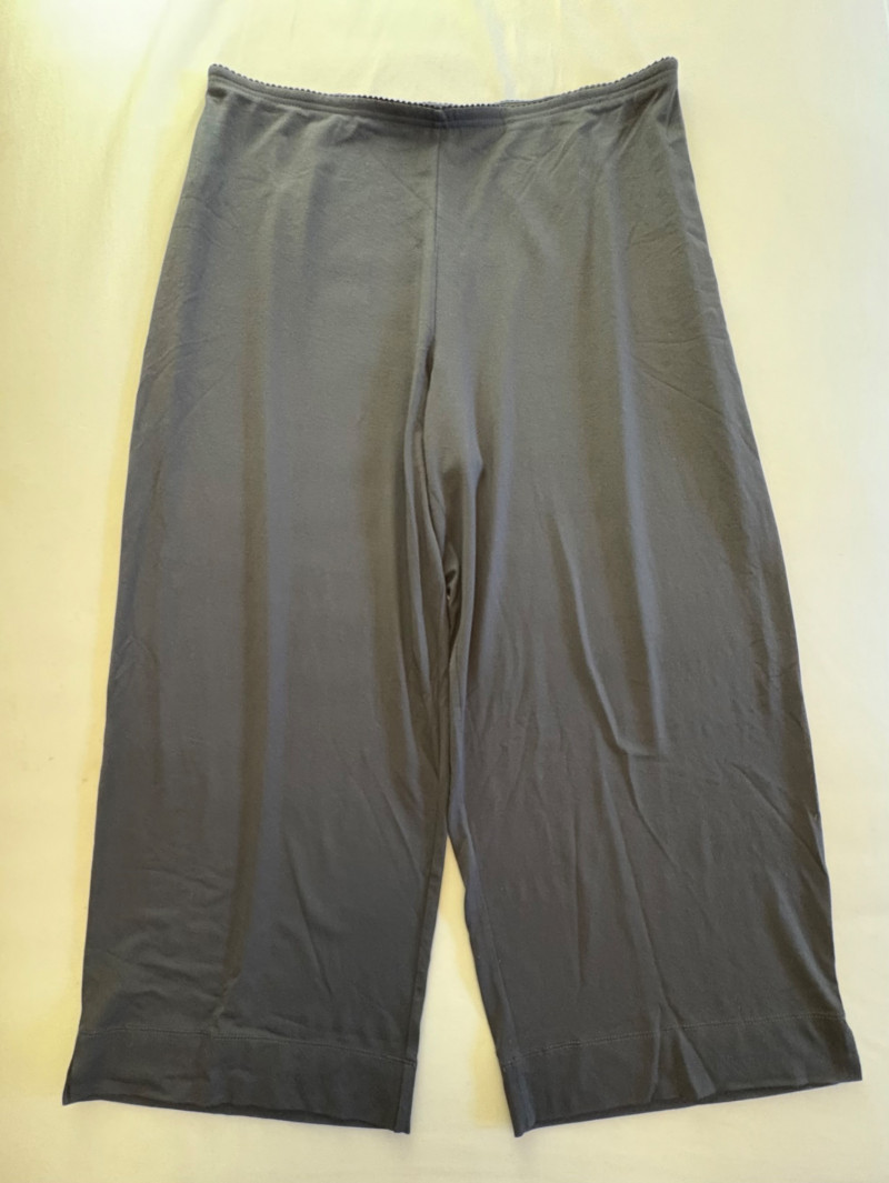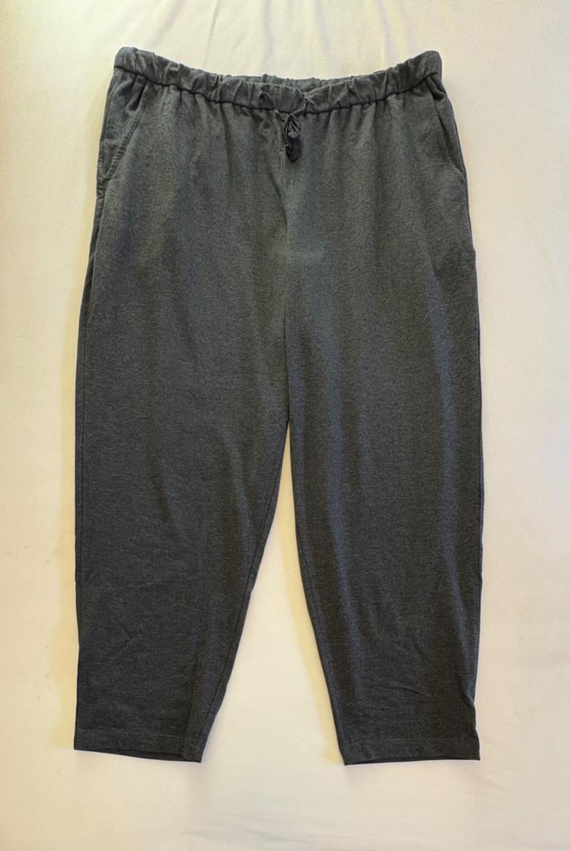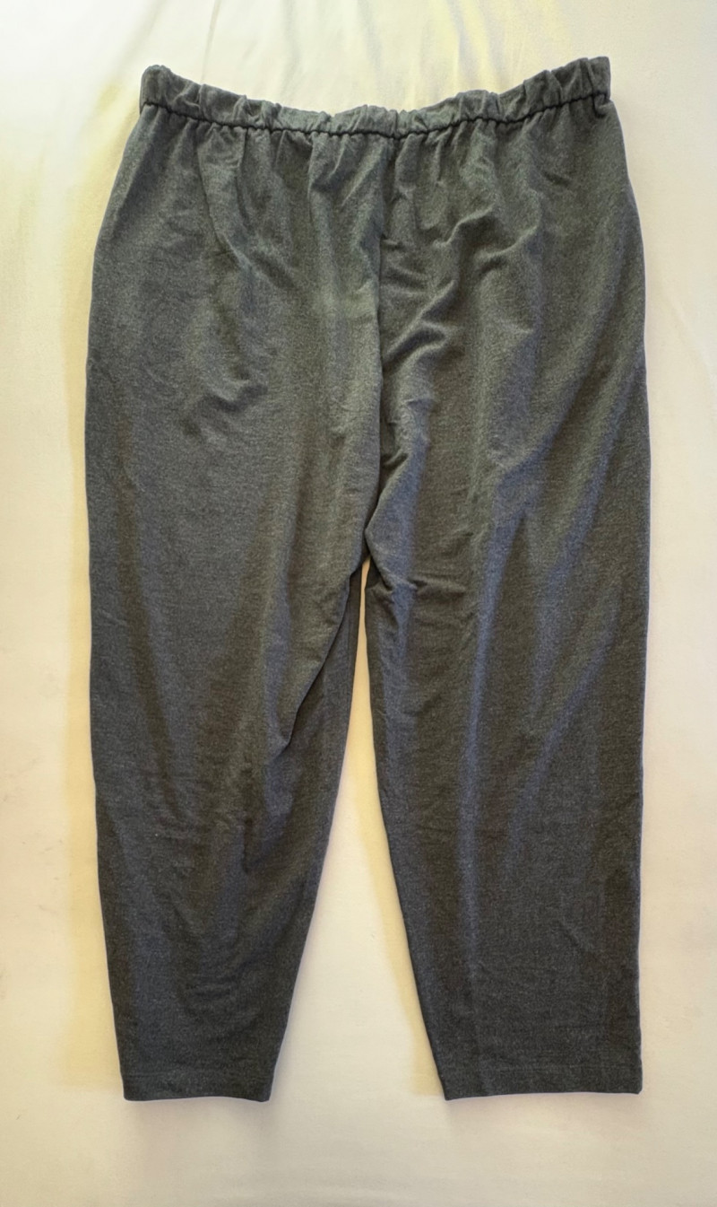 3 pairs of extremely comfortable knit pants - they could work inside and out depending upon what you pair with them. Charcoal grey pair from Eileen Fisher has elasticated waistband with drawstring, set-in front pockets, and tapered legs. In excellent condition. 95% Tencel with 5% polyurethane. Measure 18.5" side to side at waist with 26" inseam. Size tag says XL. Soft light green pair from Any Body have elasticated waist with drawstring, faux fly, front set-in pockets and elasticated hems. In excellent condition. 58% cotton with 38% modal and 4% spandex. Measure 18.5" side to side at waist with 29" inseam. Size tag says LT. Sleek grey wide leg pair from J. Jill have "heft" to the knit and fall gracefully. Narrow elasticated waistband, back waistline darts, and small split hem. In excellent condition. 95% rayon with 5% spandex. Measure 18" side to side at waist with 25" inseam. Size tag says XL