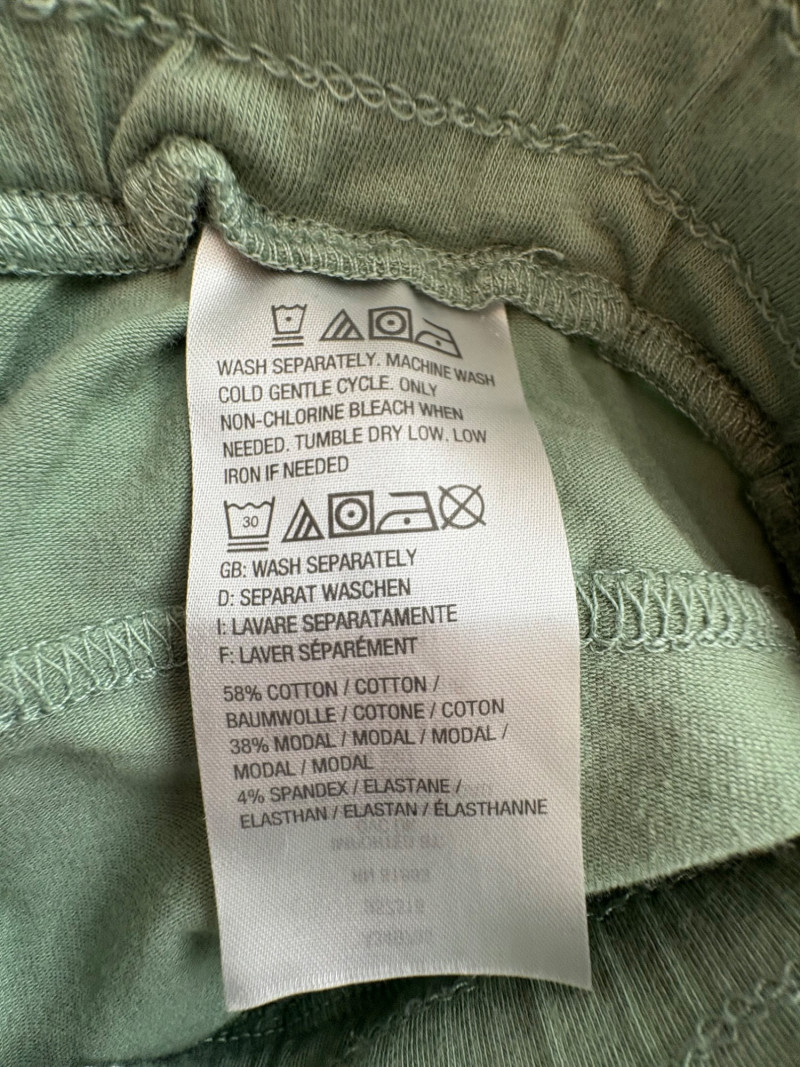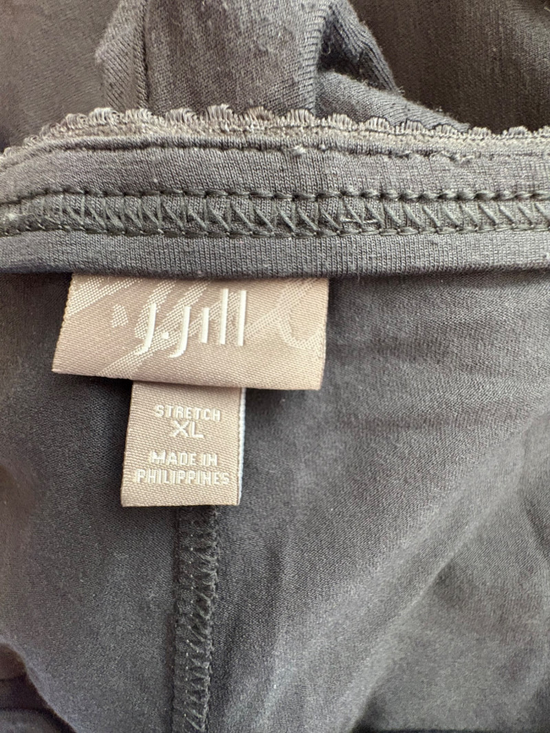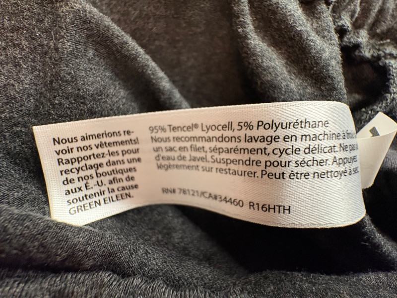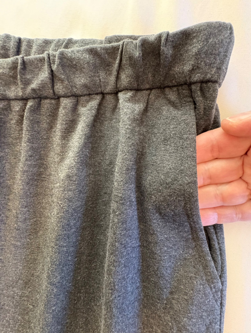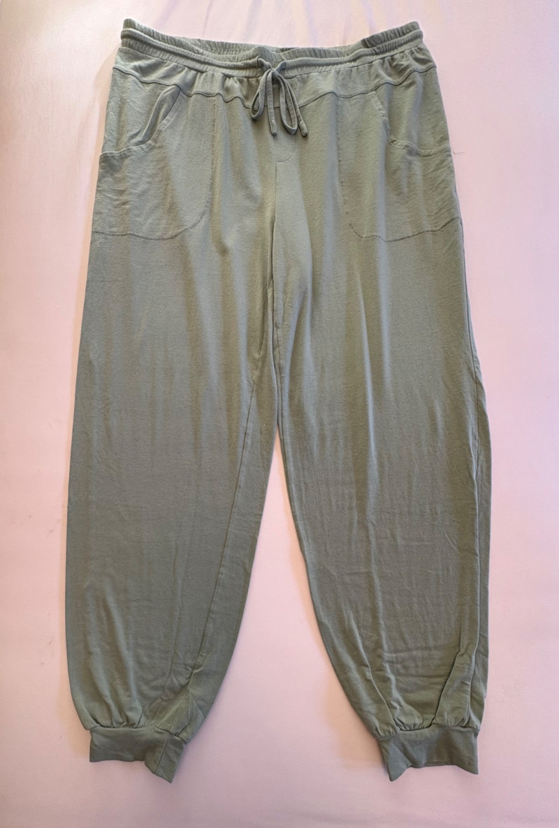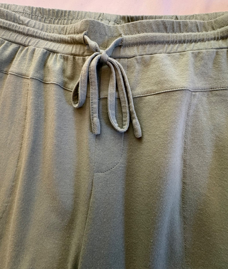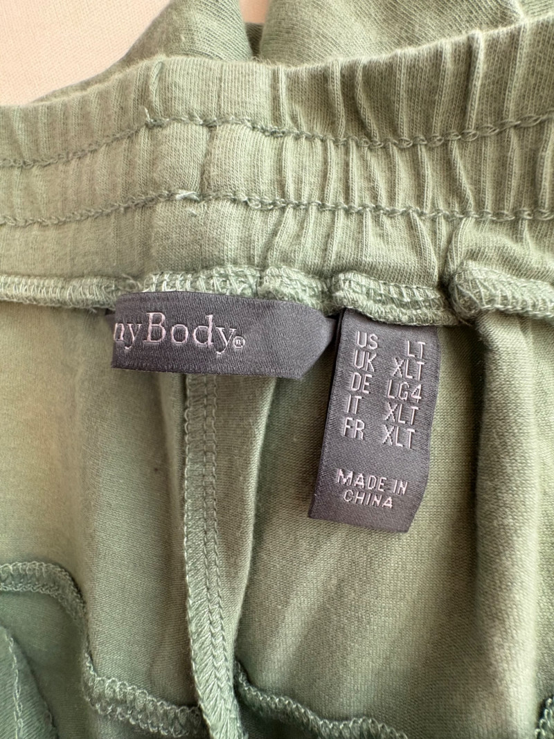 3 pairs of extremely comfortable knit pants - they could work inside and out depending upon what you pair with them. Charcoal grey pair from Eileen Fisher has elasticated waistband with drawstring, set-in front pockets, and tapered legs. In excellent condition. 95% Tencel with 5% polyurethane. Measure 18.5" side to side at waist with 26" inseam. Size tag says XL. Soft light green pair from Any Body have elasticated waist with drawstring, faux fly, front set-in pockets and elasticated hems. In excellent condition. 58% cotton with 38% modal and 4% spandex. Measure 18.5" side to side at waist with 29" inseam. Size tag says LT. Sleek grey wide leg pair from J. Jill have "heft" to the knit and fall gracefully. Narrow elasticated waistband, back waistline darts, and small split hem. In excellent condition. 95% rayon with 5% spandex. Measure 18" side to side at waist with 25" inseam. Size tag says XL