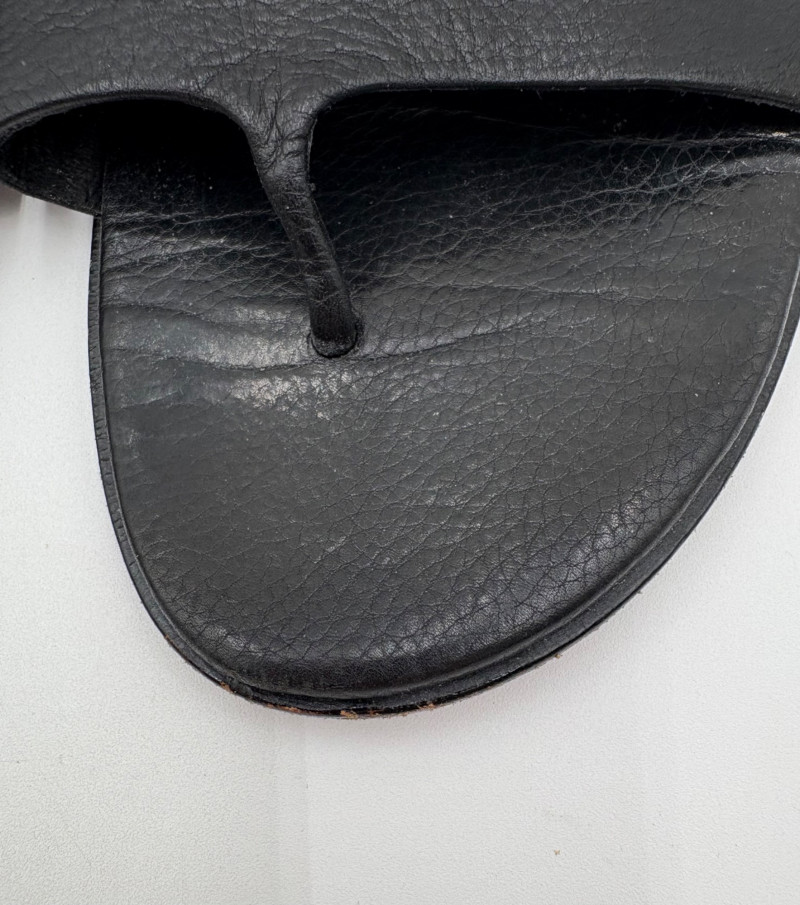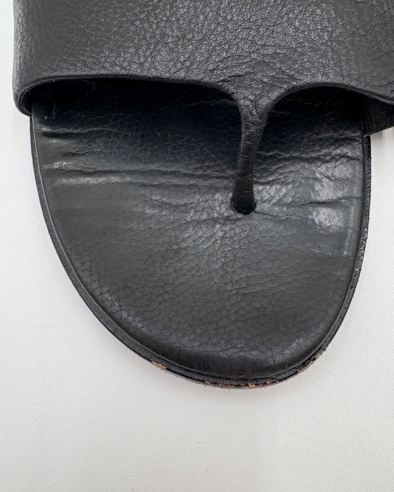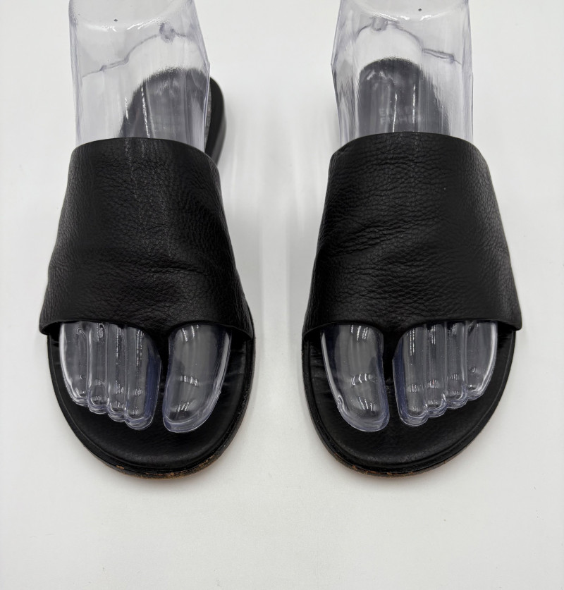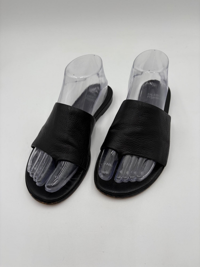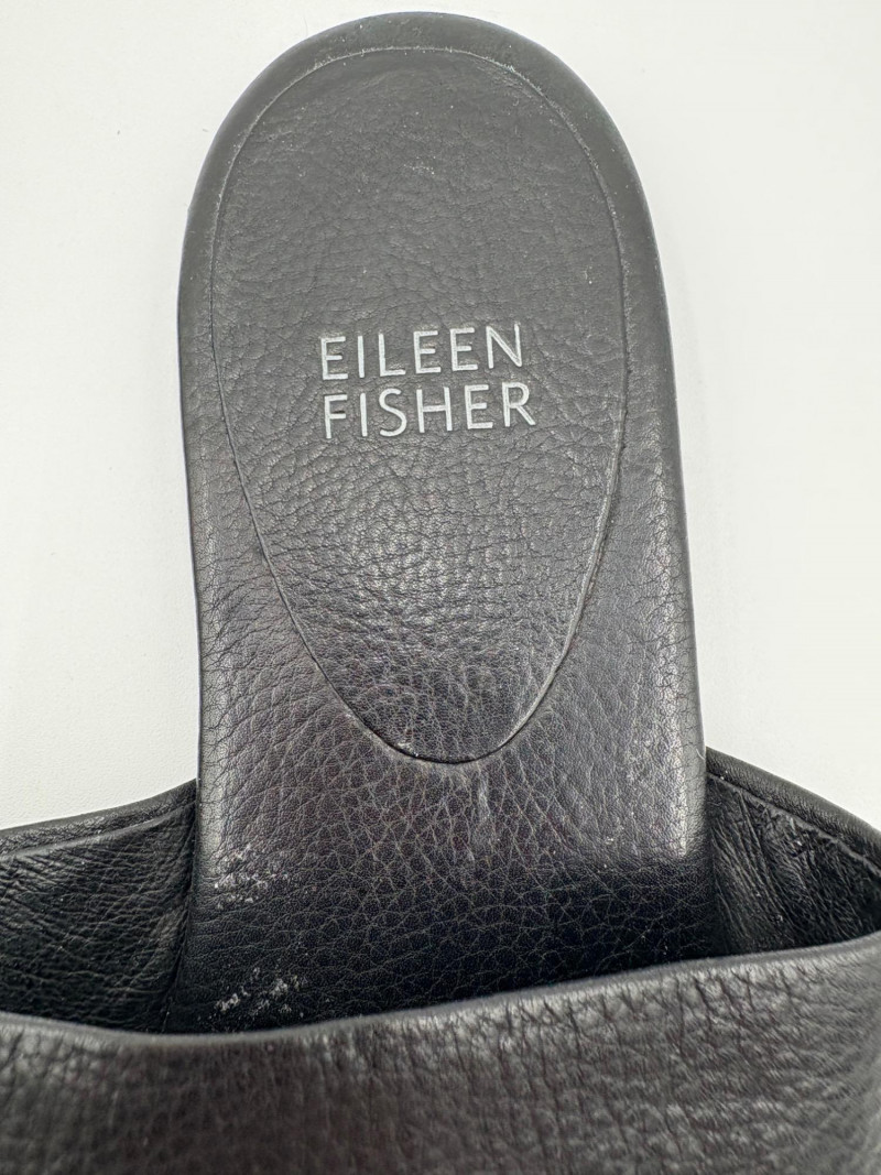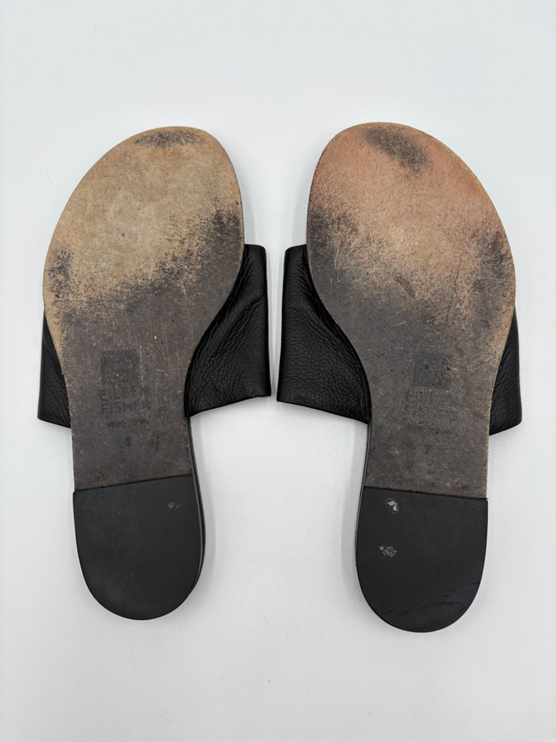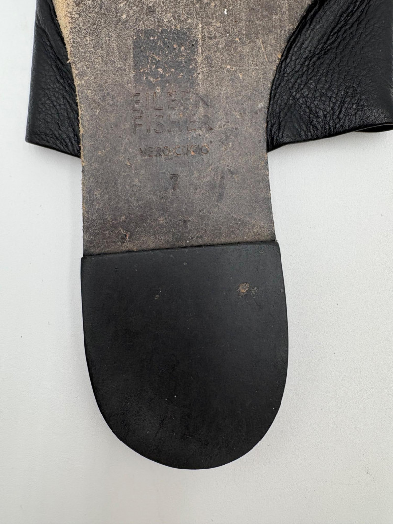 Black flip-flop style sandals from Eileen Fisher. Black leather soles, insole, and upper. In good used condition with wear on soles, but lots of life left in them. Size 7