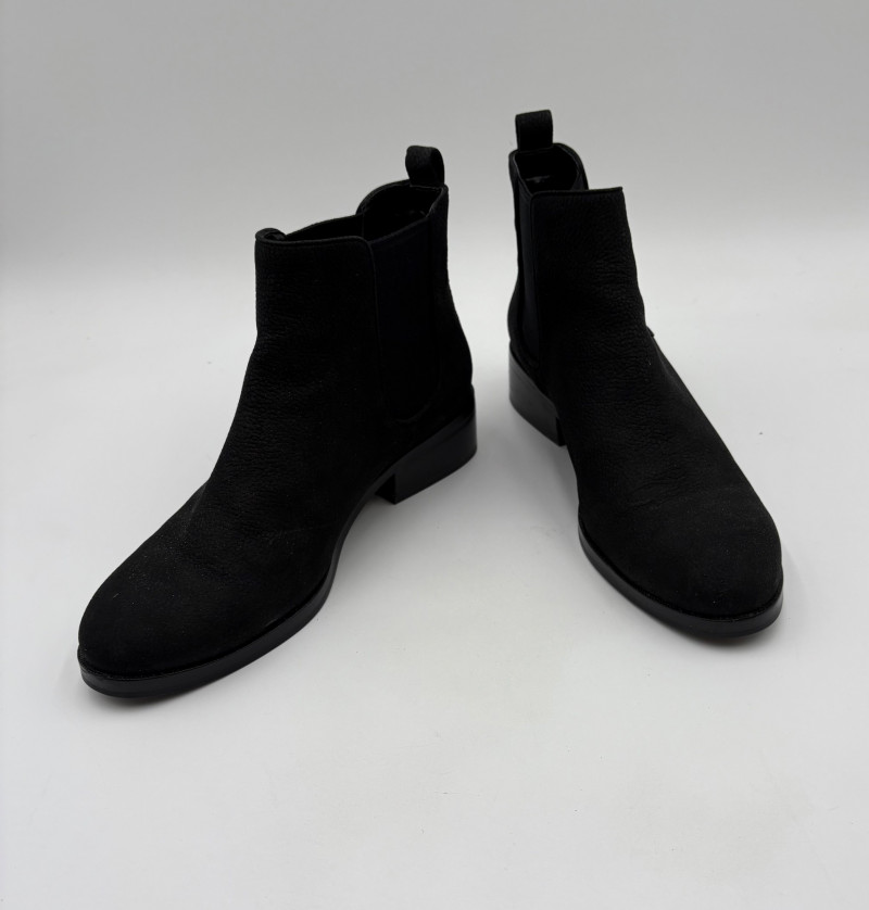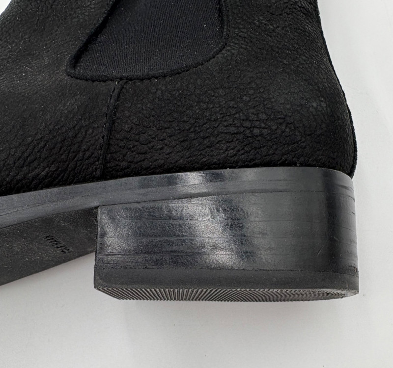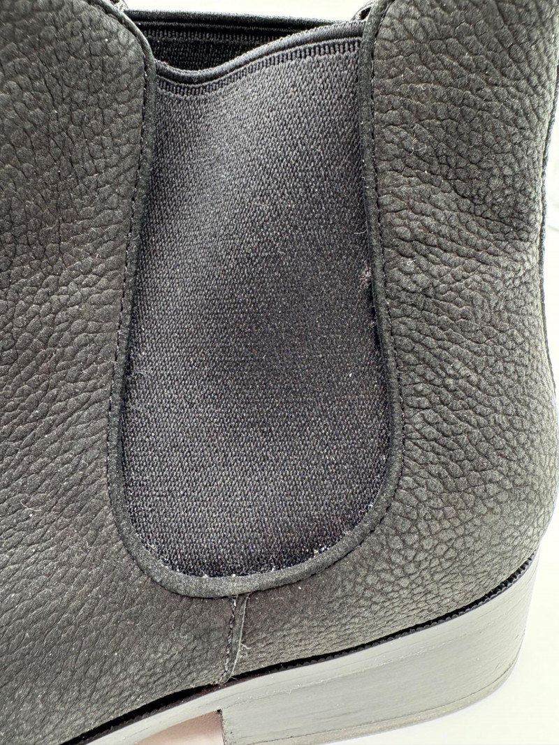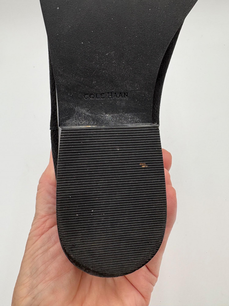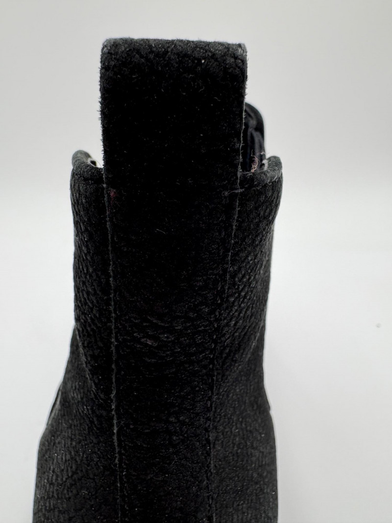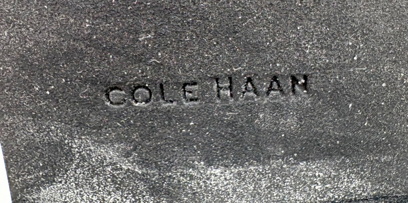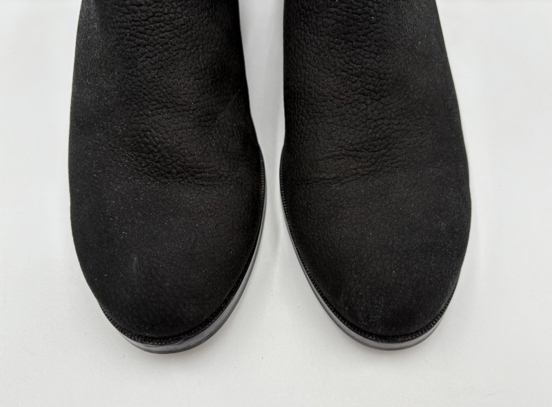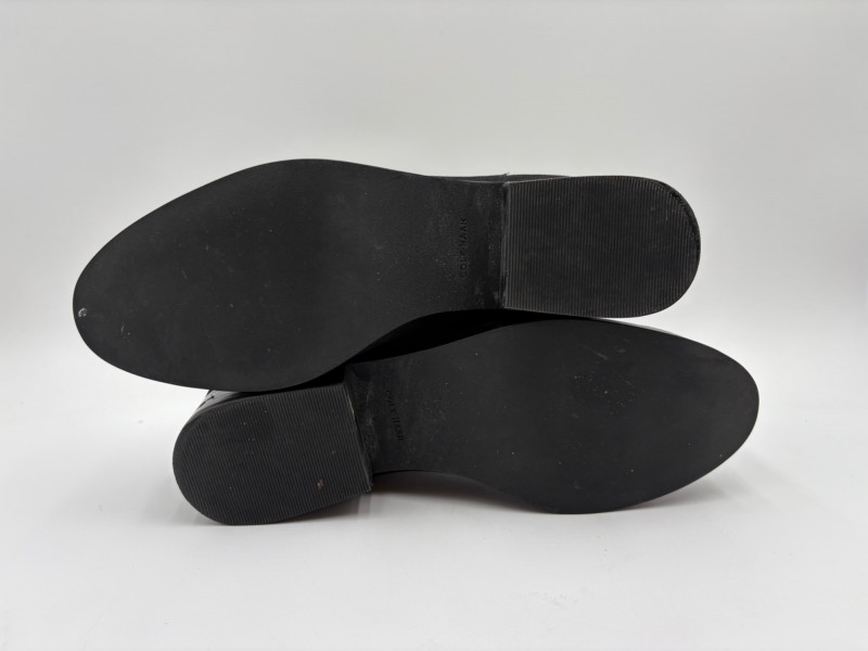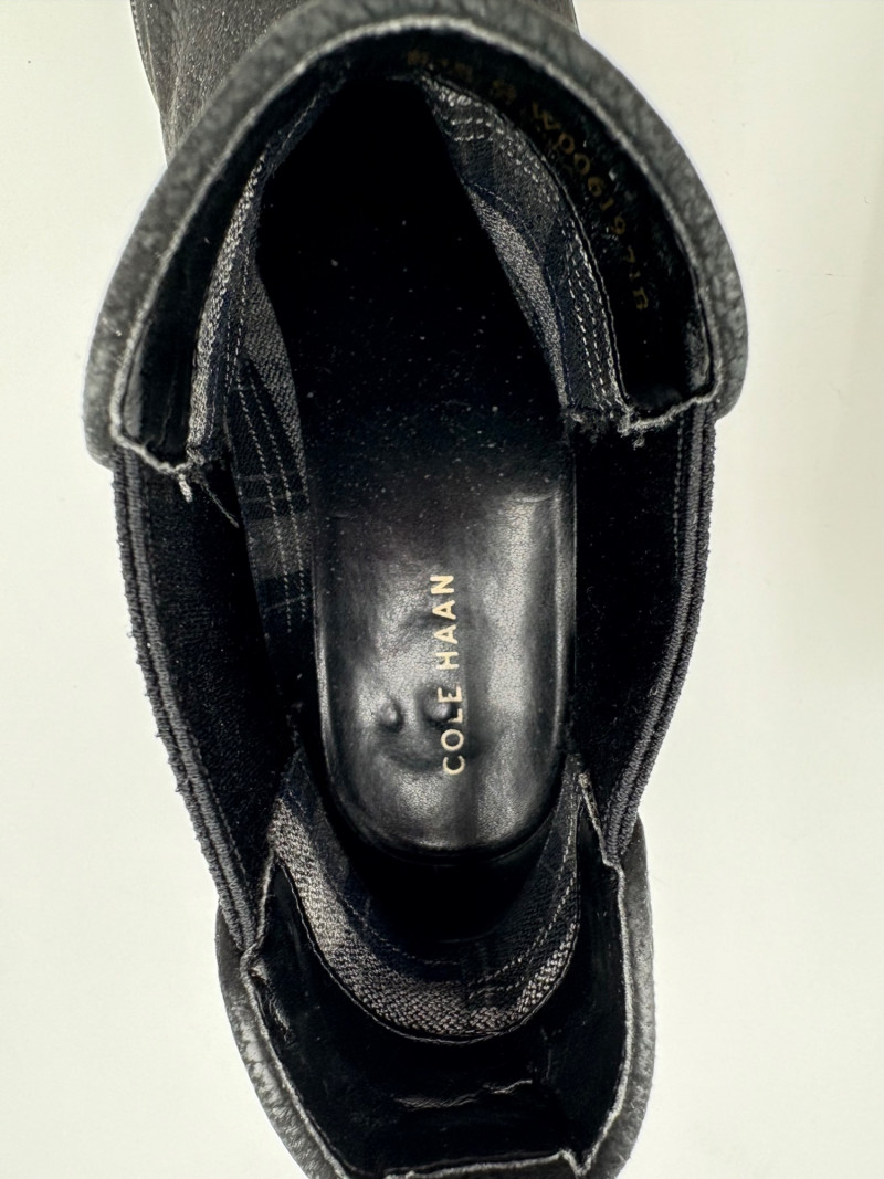 Great set of black textured leather ankle boots from Cole Haan (we say leather because of the feel - no material info on boots) Boots have a heavyweight sole and gussets on either side of the ankle for easy entry along with a back pull tab. Stacked black heel is 1.25".In excellent condition - no wear on soles or uppers; only flaw immediately noticeable is a scrape on the right back heel - see last photo. Size 7.5