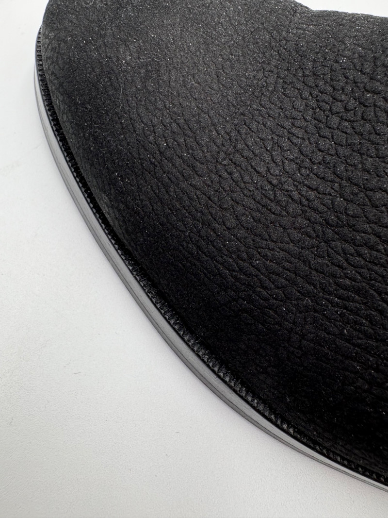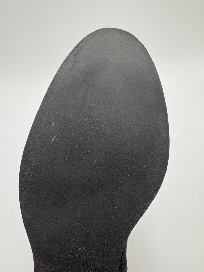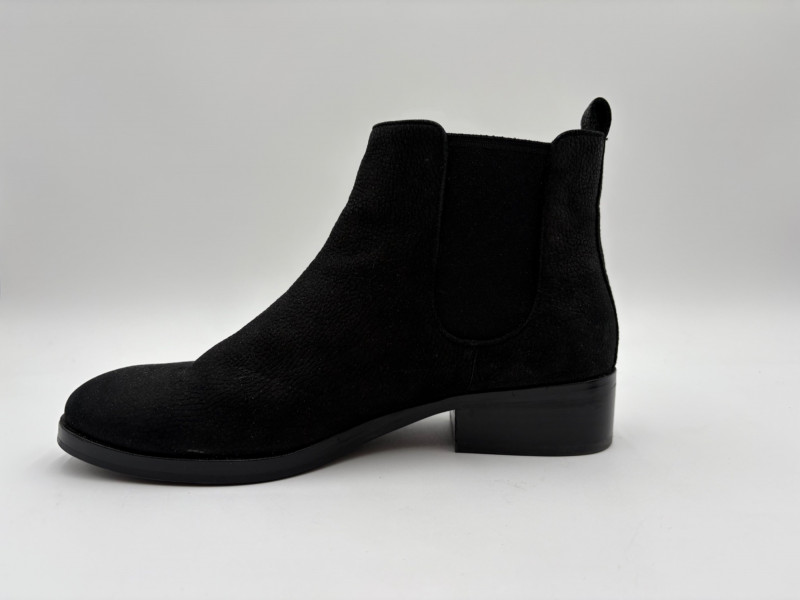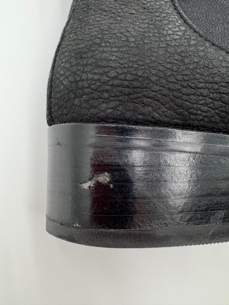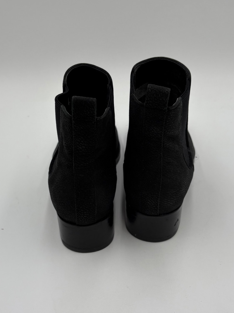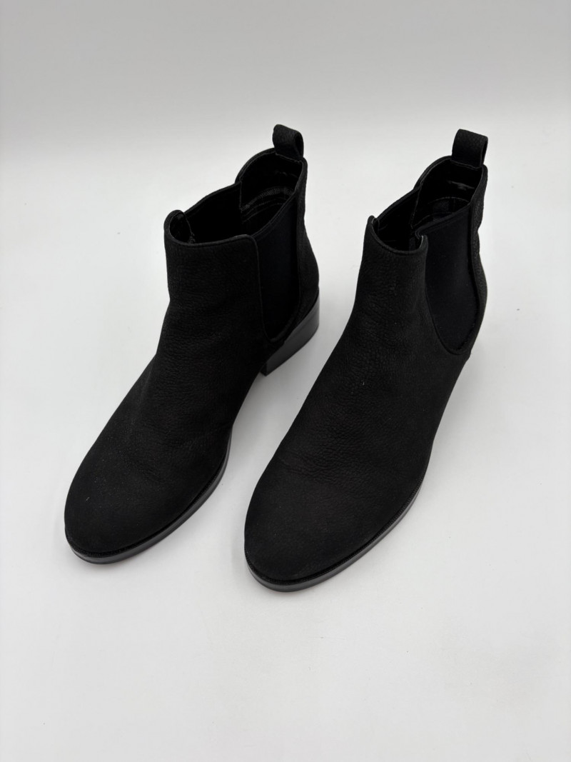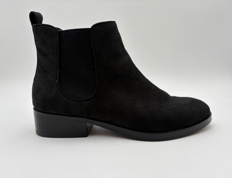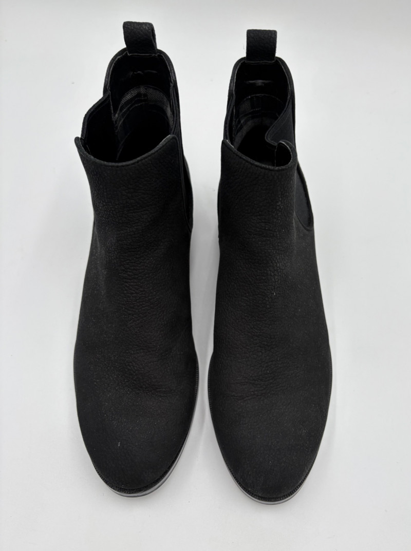 Great set of black textured leather ankle boots from Cole Haan (we say leather because of the feel - no material info on boots) Boots have a heavyweight sole and gussets on either side of the ankle for easy entry along with a back pull tab. Stacked black heel is 1.25".In excellent condition - no wear on soles or uppers; only flaw immediately noticeable is a scrape on the right back heel - see last photo. Size 7.5