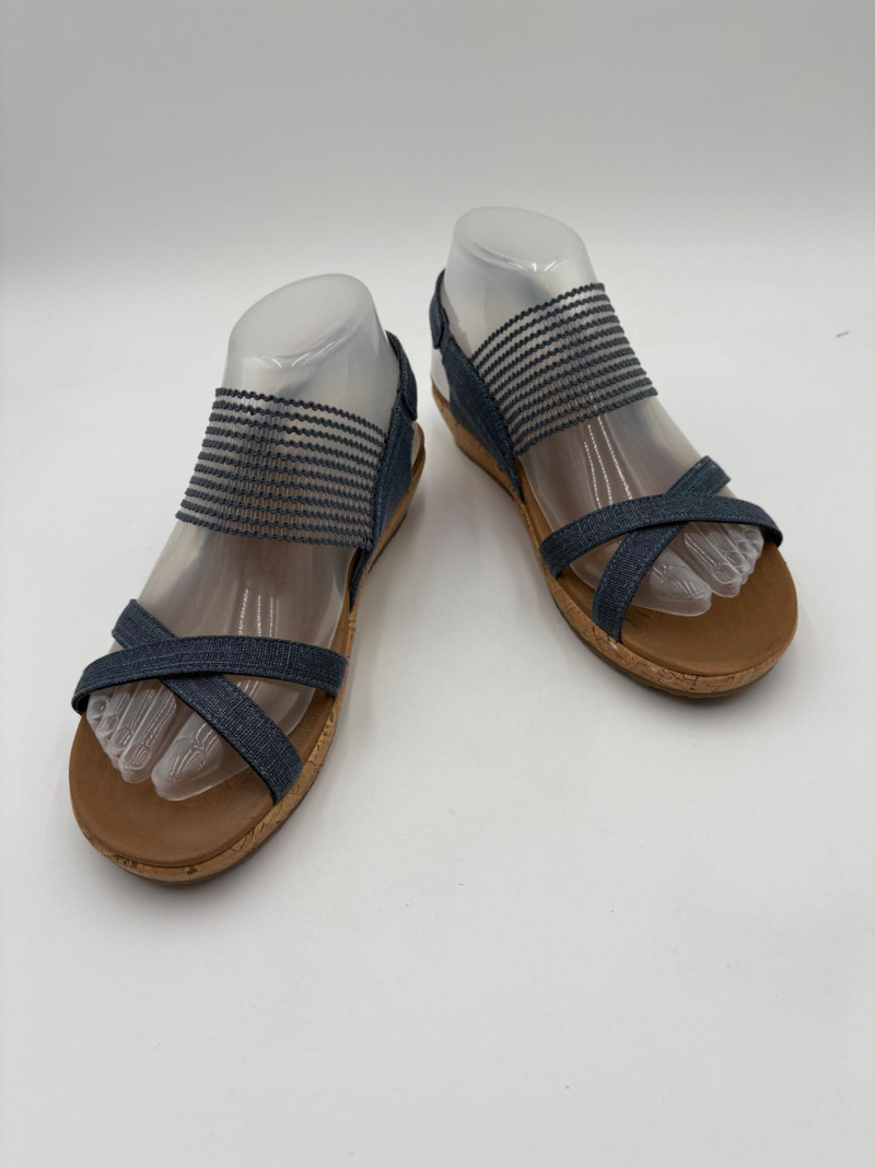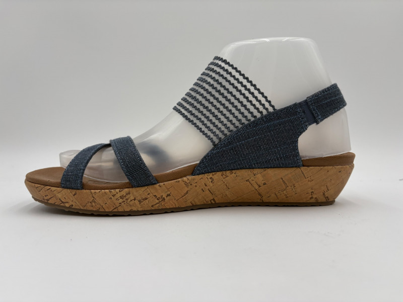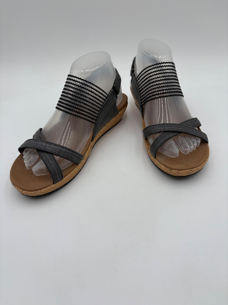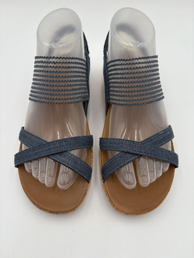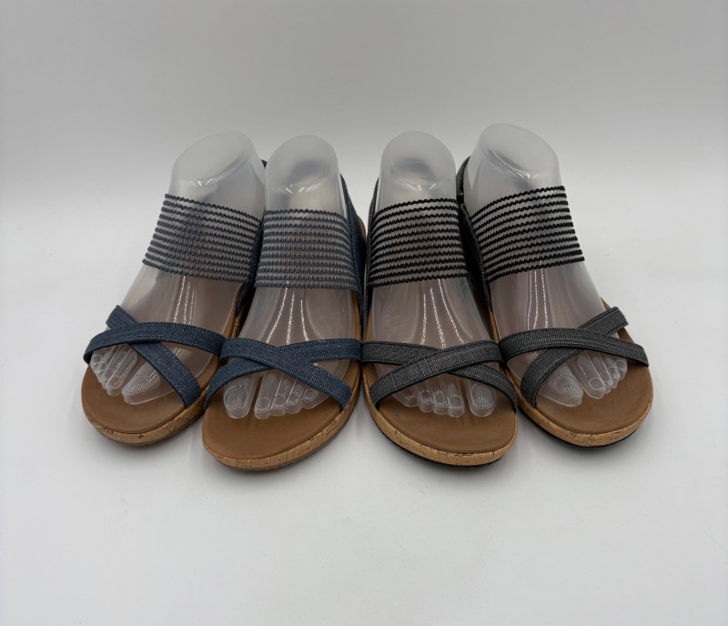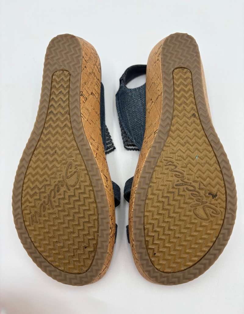 2 pairs of identical Sketchers comfort sandals in blue and black. Both have cork-like wedge sole that is 1.5" at heel with .75" platform, crisscross straps across vamp, strap to rear of heel with elastic inset, and and over the instep elastic netting. Both are in excellent shape showing very little use on either uppers or soles with the exception of some white on the cork of one blue shoe - see last photo. Size 7 on both.
