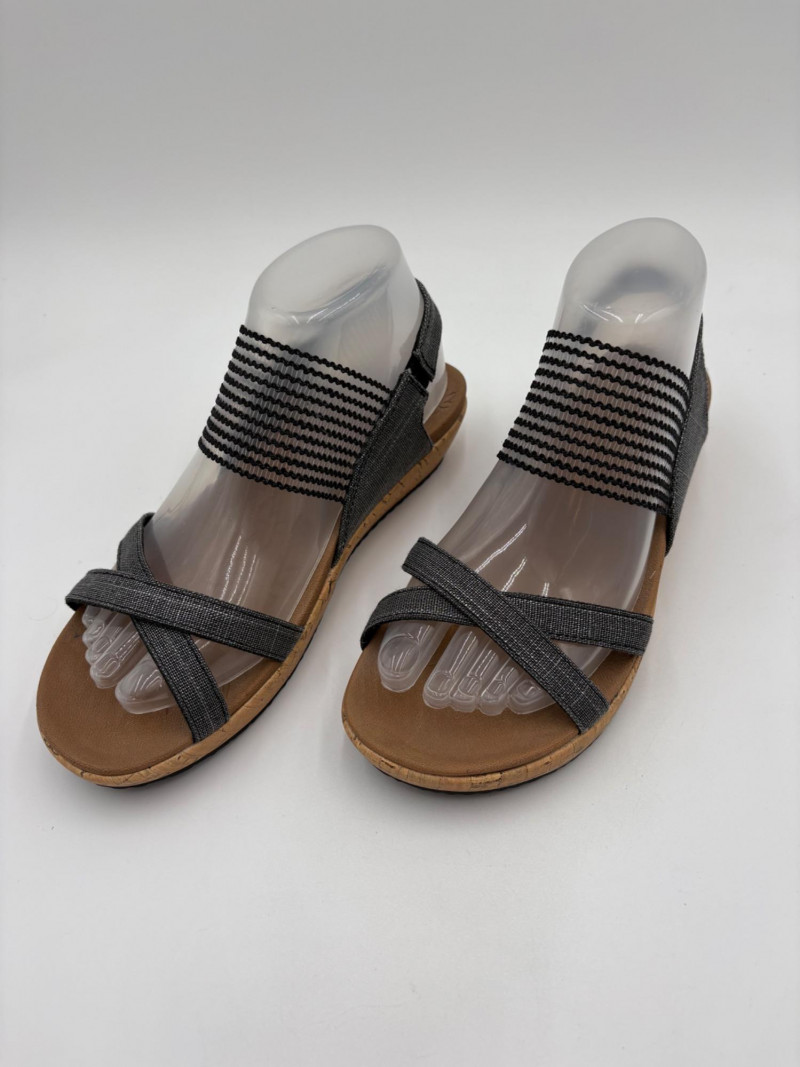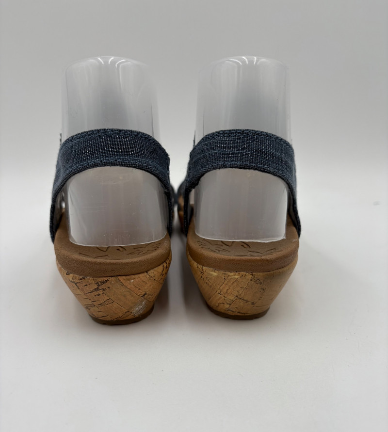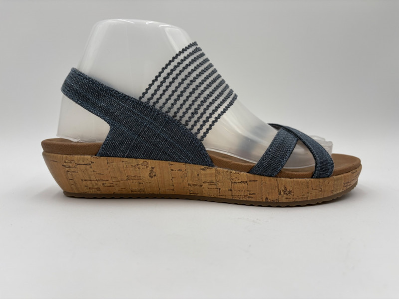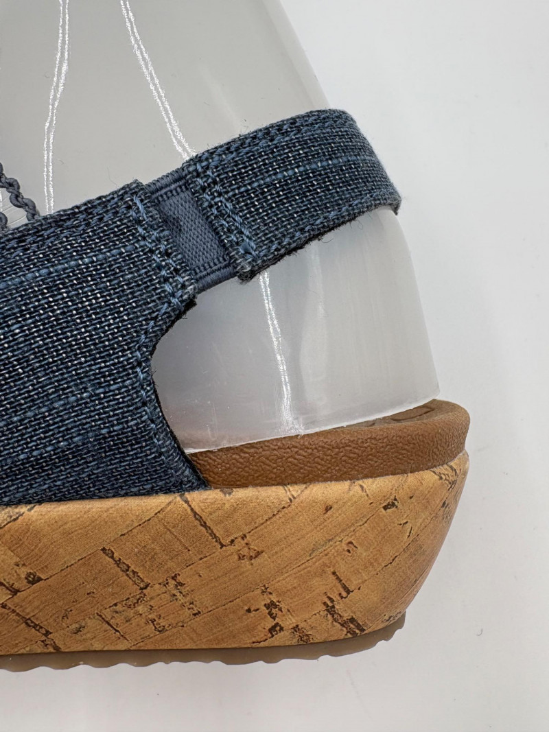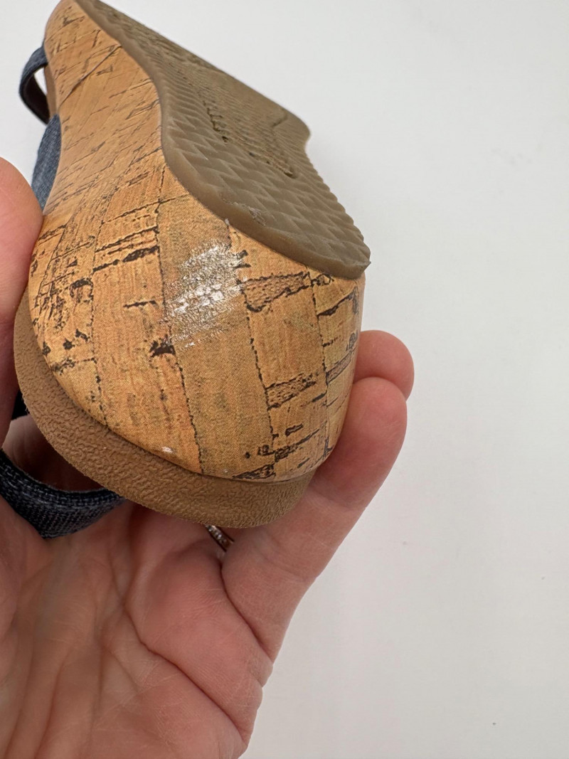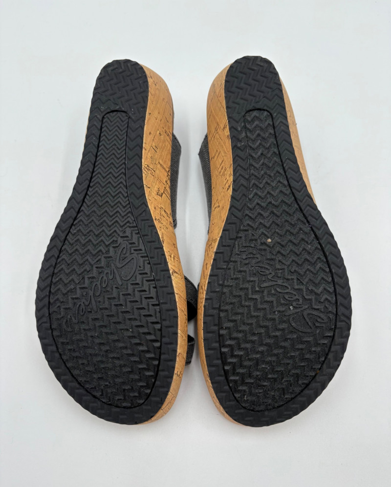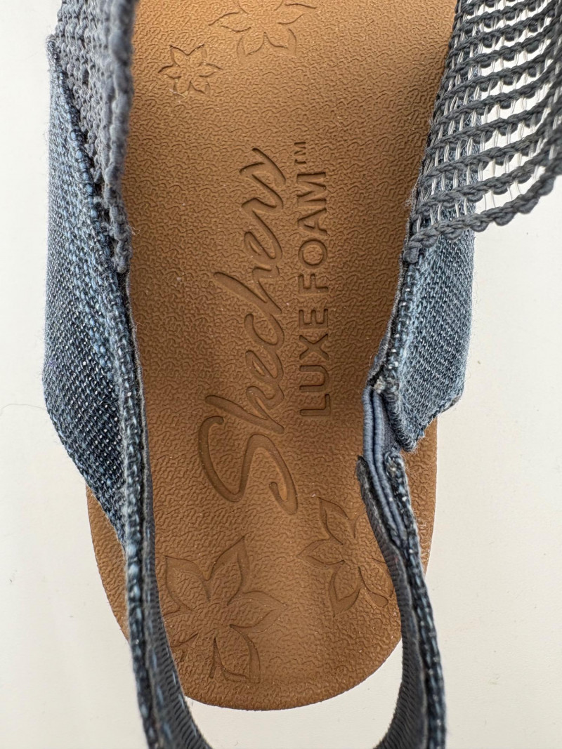 2 pairs of identical Sketchers comfort sandals in blue and black. Both have cork-like wedge sole that is 1.5" at heel with .75" platform, crisscross straps across vamp, strap to rear of heel with elastic inset, and and over the instep elastic netting. Both are in excellent shape showing very little use on either uppers or soles with the exception of some white on the cork of one blue shoe - see last photo. Size 7 on both.
