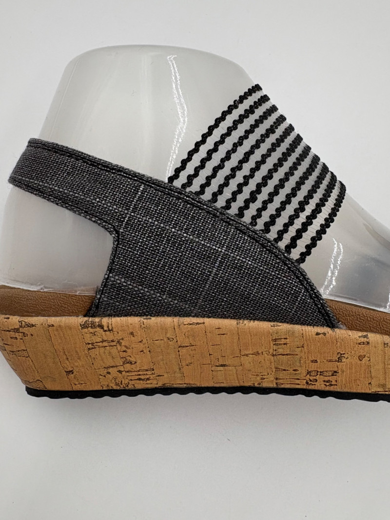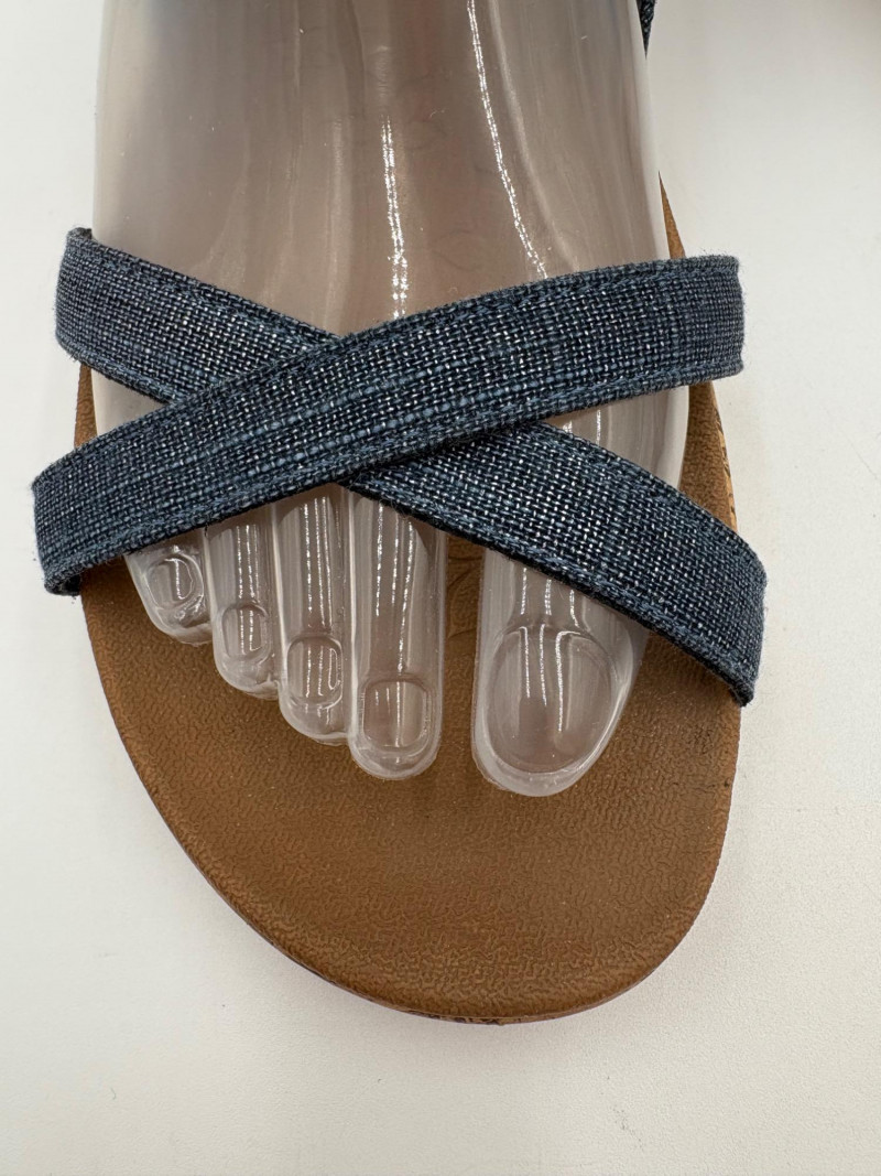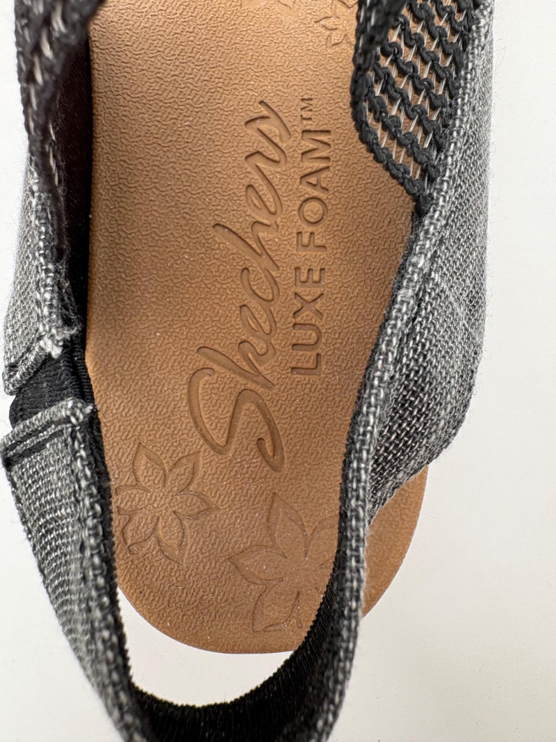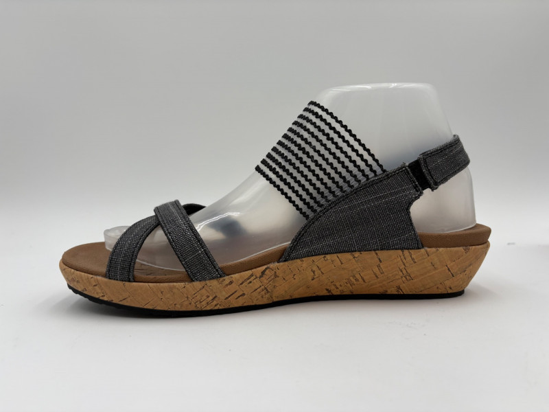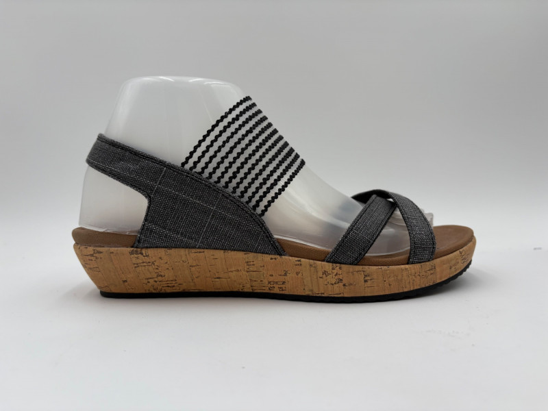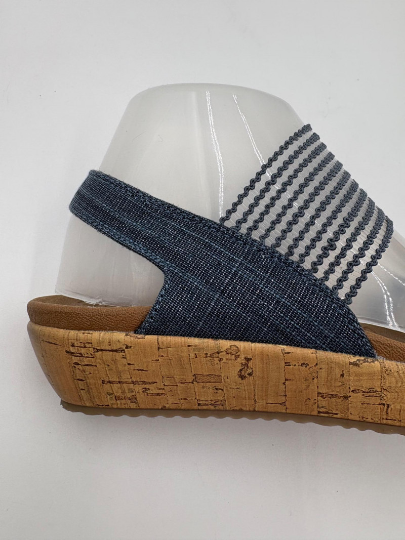 2 pairs of identical Sketchers comfort sandals in blue and black. Both have cork-like wedge sole that is 1.5" at heel with .75" platform, crisscross straps across vamp, strap to rear of heel with elastic inset, and and over the instep elastic netting. Both are in excellent shape showing very little use on either uppers or soles with the exception of some white on the cork of one blue shoe - see last photo. Size 7 on both.