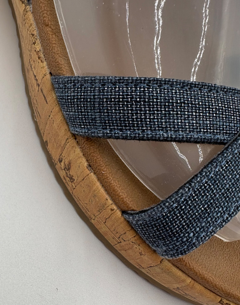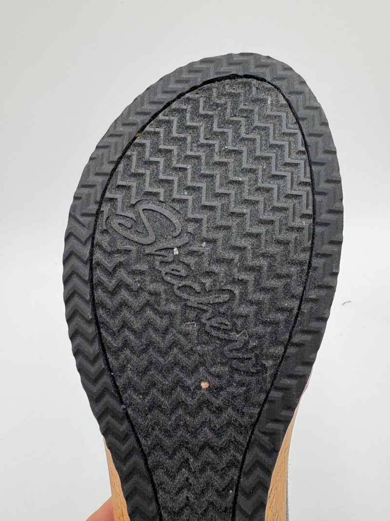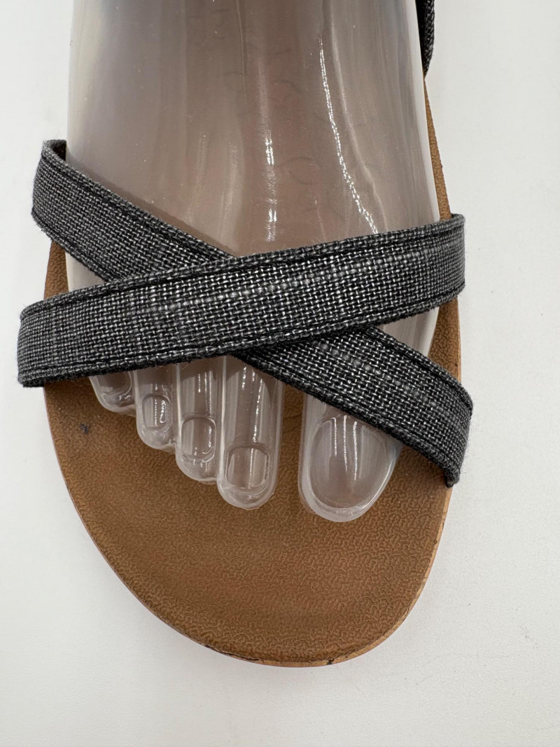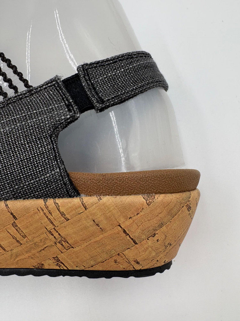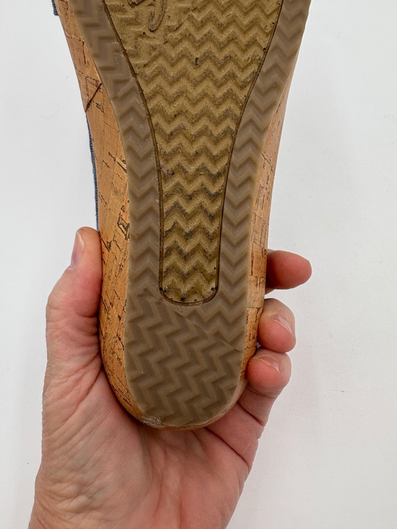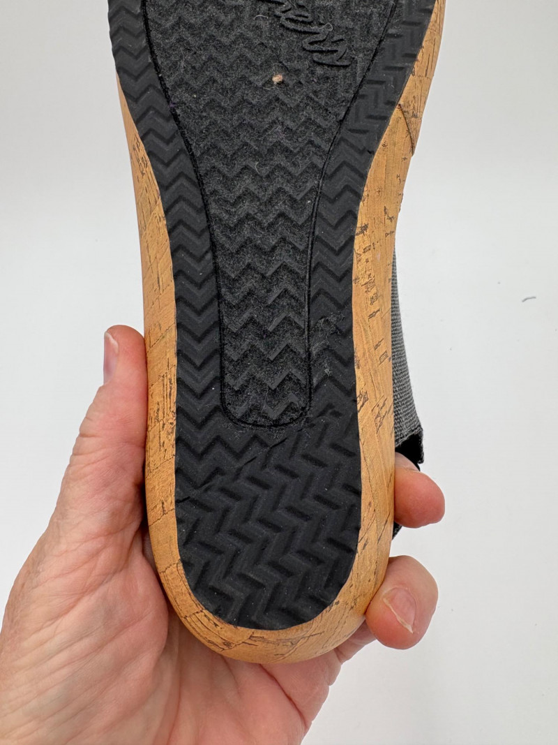 2 pairs of identical Sketchers comfort sandals in blue and black. Both have cork-like wedge sole that is 1.5" at heel with .75" platform, crisscross straps across vamp, strap to rear of heel with elastic inset, and and over the instep elastic netting. Both are in excellent shape showing very little use on either uppers or soles with the exception of some white on the cork of one blue shoe - see last photo. Size 7 on both.