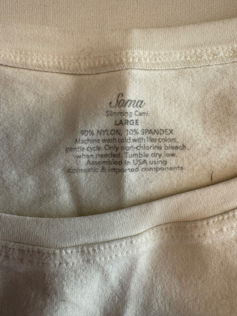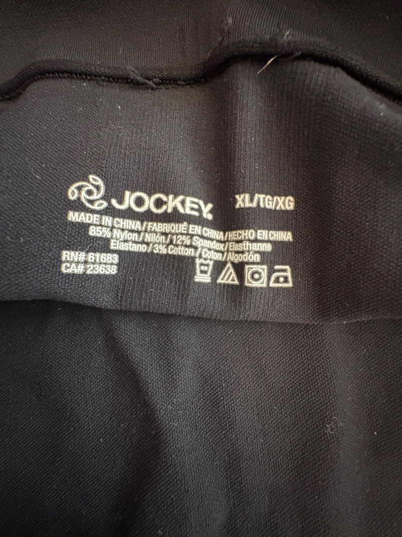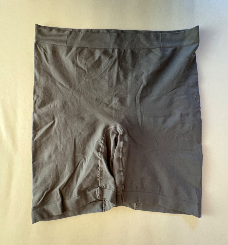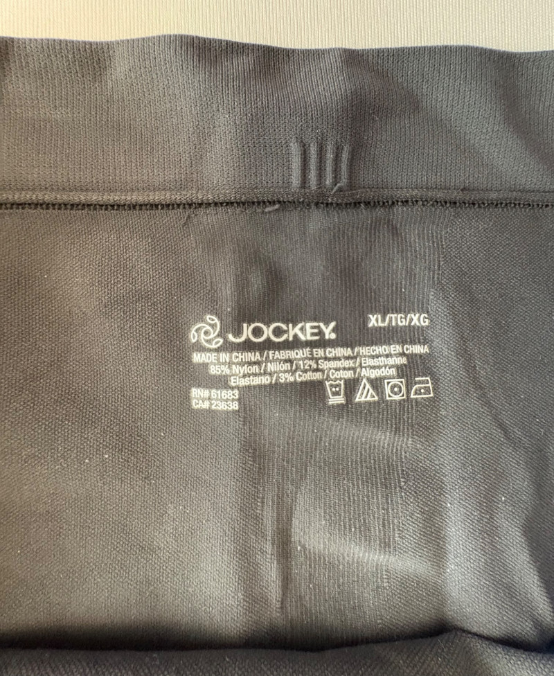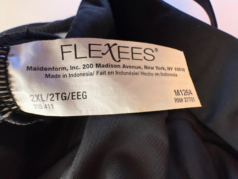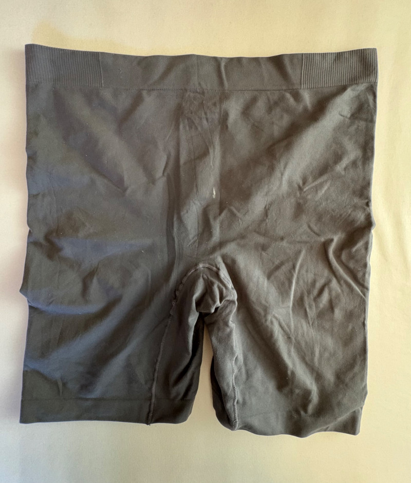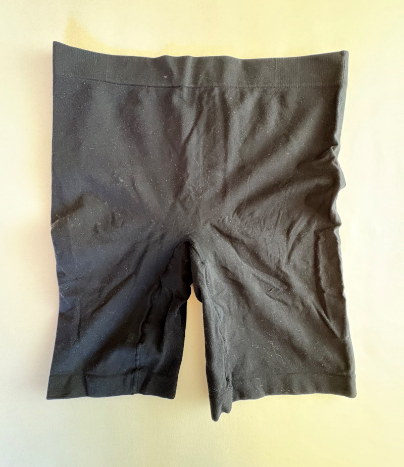 Group of undergarment shapers from various makers to keep everything in place and comfortable. Please note that the measurements given (like all in this auction) are unstretched; the fabrics are super-stretchy & fit our 1X client. White tank from Soma has under bustline ribbing and bottom hem ribbing. In used condition. 90% nylon with 10% spandex. Measures 14" pit to pit. Size tag says L. Beige tank top exactly like the previous one from Soma measures 15.5" pit to pit. In very good used condition (used much less than the white one). Size tag says XL. Two pairs of Jockey anti-chafe super lightweight shorts for under skirts & dresses. One in gray and one in black - both tags say size XL The grey is in good used condition while the black one is less used and in very good used condition. 85% nylon with 12% spandex and 3% cotton. Both measure 14" side to side at the waist. Two pairs of anti-chafe thigh-length super-thin shorts/hose; no maker tag. Approx. 9" inseam. Shaper underdress/slip from Maidenform line Flexeez in black with adjustable elasticated straps, built-in support seaming under the bust, and built-in thigh-length "girdle" section with hook & eye crotch closure under skirt. In good used shape. 70% nylon 30% elastane. Size tag says 2XL but it appears slightly smaller than that to our eyes.