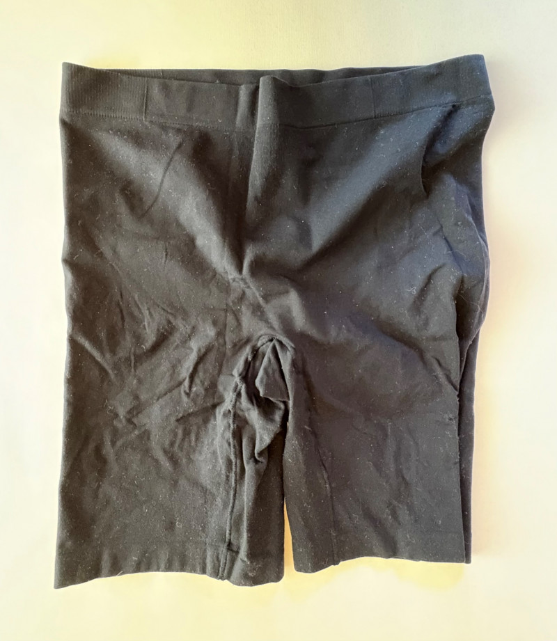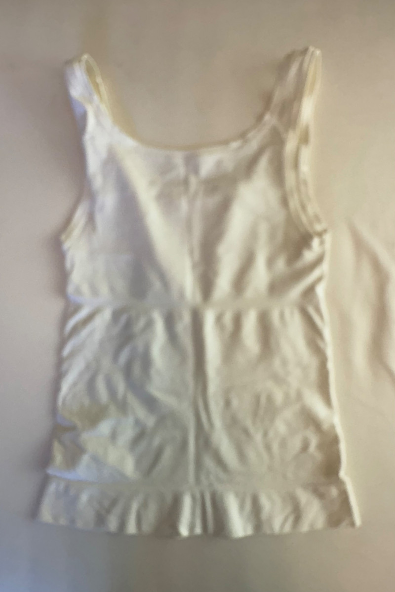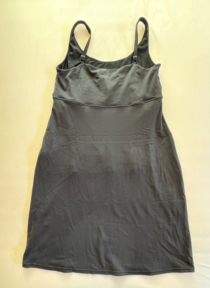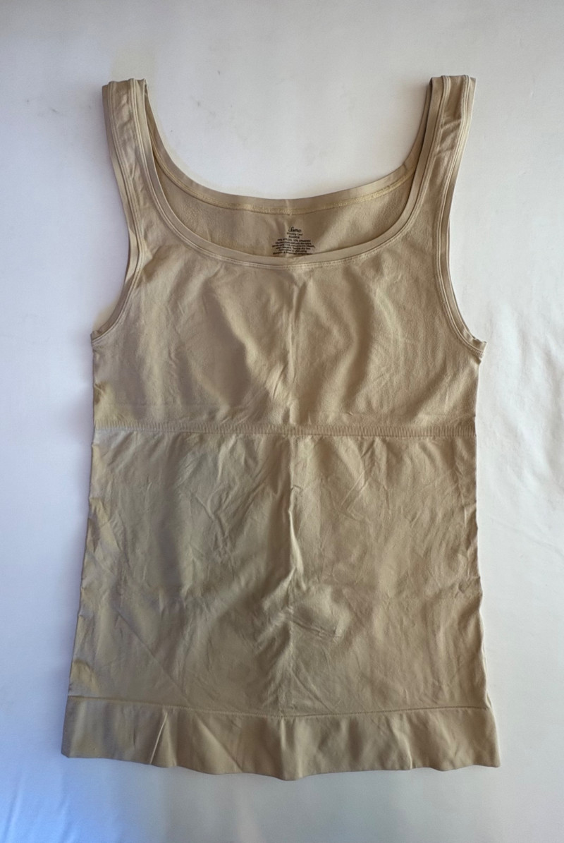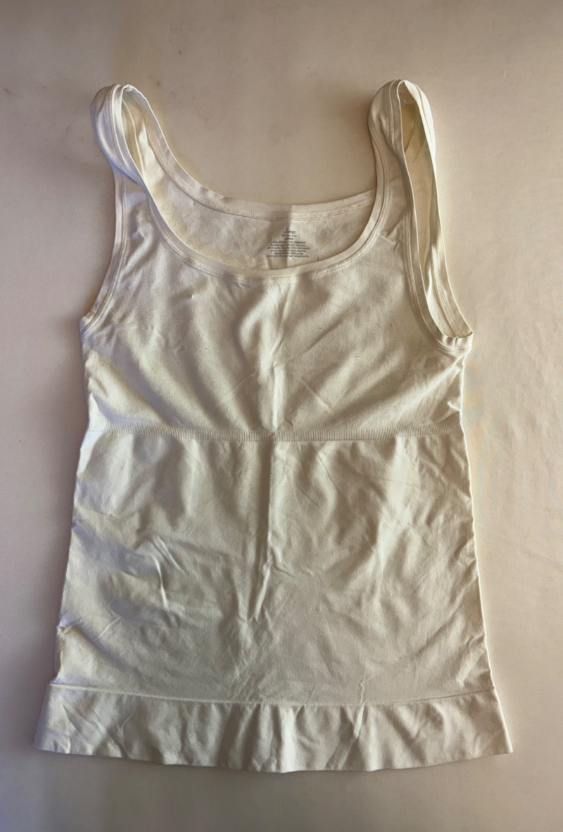 Group of undergarment shapers from various makers to keep everything in place and comfortable. Please note that the measurements given (like all in this auction) are unstretched; the fabrics are super-stretchy & fit our 1X client. White tank from Soma has under bustline ribbing and bottom hem ribbing. In used condition. 90% nylon with 10% spandex. Measures 14" pit to pit. Size tag says L. Beige tank top exactly like the previous one from Soma measures 15.5" pit to pit. In very good used condition (used much less than the white one). Size tag says XL. Two pairs of Jockey anti-chafe super lightweight shorts for under skirts & dresses. One in gray and one in black - both tags say size XL The grey is in good used condition while the black one is less used and in very good used condition. 85% nylon with 12% spandex and 3% cotton. Both measure 14" side to side at the waist. Two pairs of anti-chafe thigh-length super-thin shorts/hose; no maker tag. Approx. 9" inseam. Shaper underdress/slip from Maidenform line Flexeez in black with adjustable elasticated straps, built-in support seaming under the bust, and built-in thigh-length "girdle" section with hook & eye crotch closure under skirt. In good used shape. 70% nylon 30% elastane. Size tag says 2XL but it appears slightly smaller than that to our eyes.