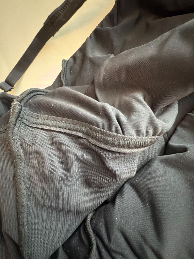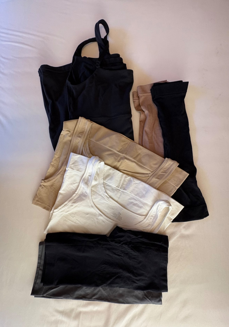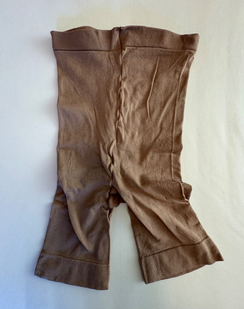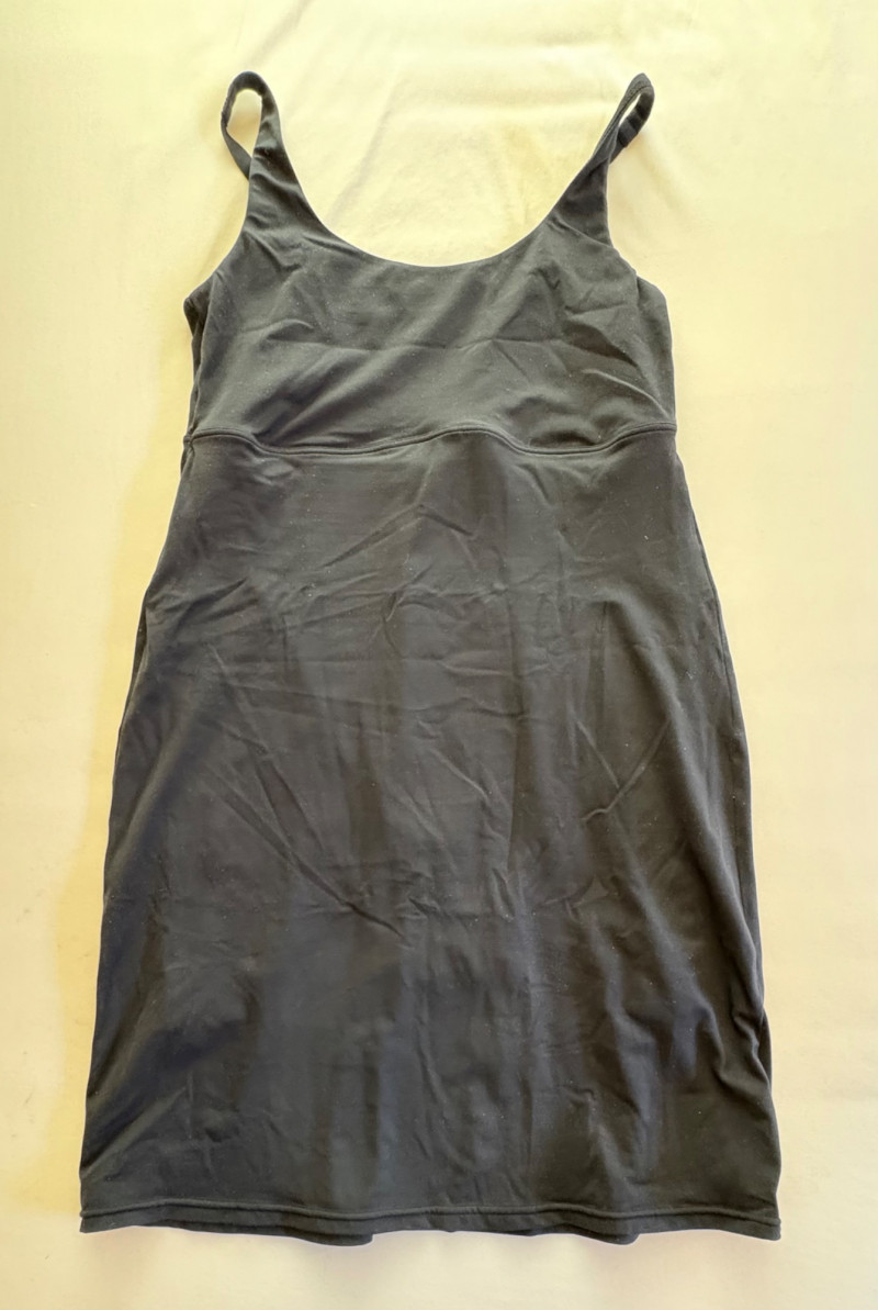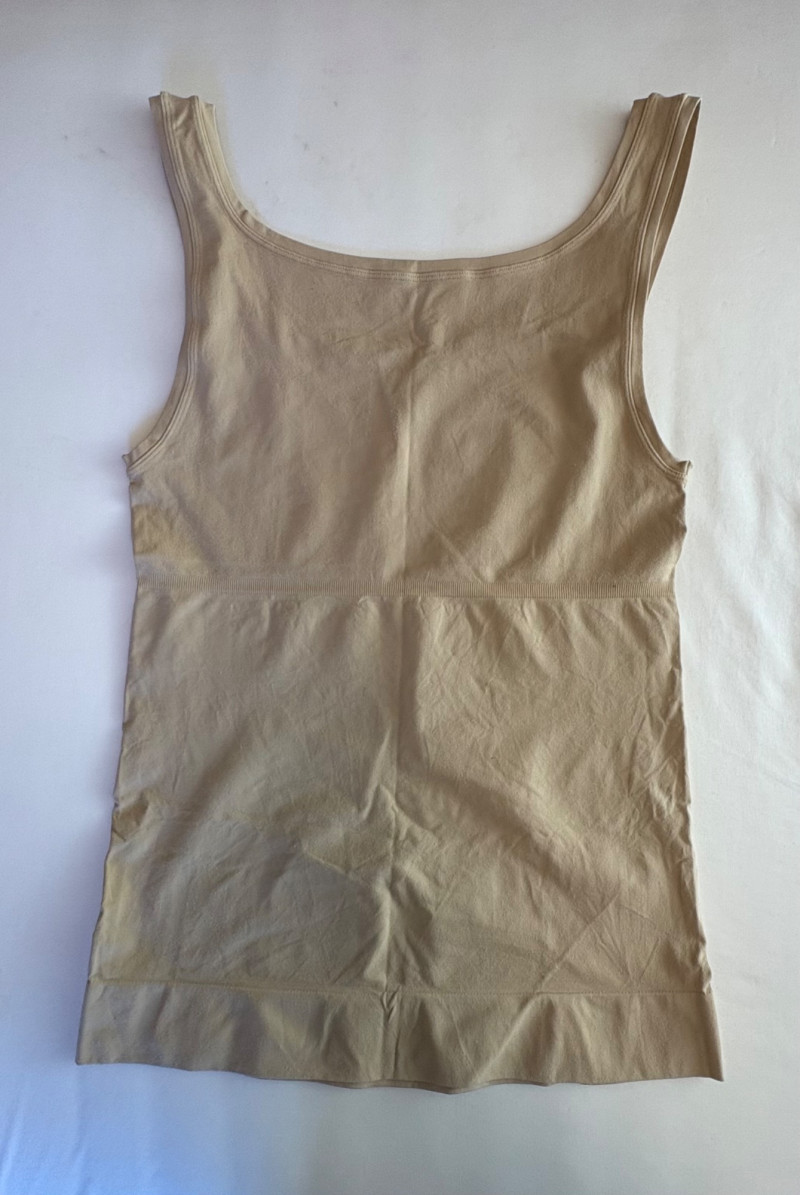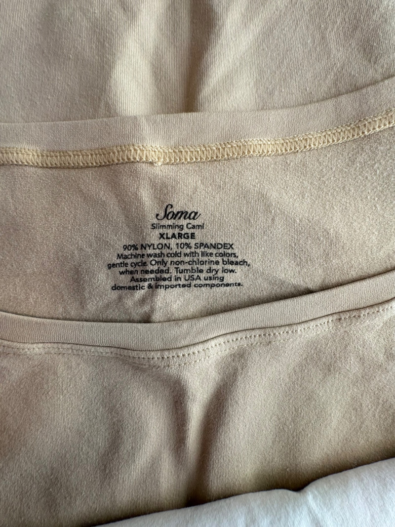 Group of undergarment shapers from various makers to keep everything in place and comfortable. Please note that the measurements given (like all in this auction) are unstretched; the fabrics are super-stretchy & fit our 1X client. White tank from Soma has under bustline ribbing and bottom hem ribbing. In used condition. 90% nylon with 10% spandex. Measures 14" pit to pit. Size tag says L. Beige tank top exactly like the previous one from Soma measures 15.5" pit to pit. In very good used condition (used much less than the white one). Size tag says XL. Two pairs of Jockey anti-chafe super lightweight shorts for under skirts & dresses. One in gray and one in black - both tags say size XL The grey is in good used condition while the black one is less used and in very good used condition. 85% nylon with 12% spandex and 3% cotton. Both measure 14" side to side at the waist. Two pairs of anti-chafe thigh-length super-thin shorts/hose; no maker tag. Approx. 9" inseam. Shaper underdress/slip from Maidenform line Flexeez in black with adjustable elasticated straps, built-in support seaming under the bust, and built-in thigh-length "girdle" section with hook & eye crotch closure under skirt. In good used shape. 70% nylon 30% elastane. Size tag says 2XL but it appears slightly smaller than that to our eyes.