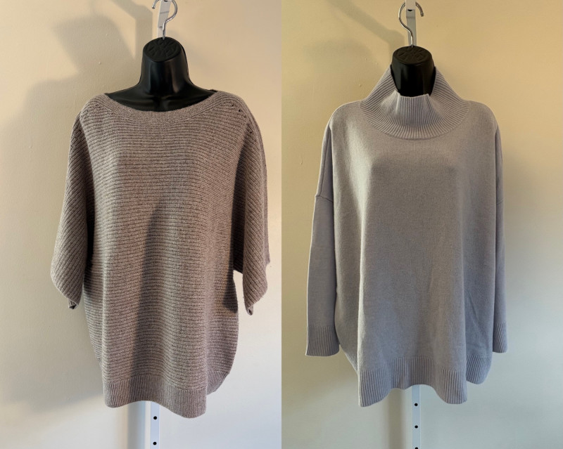 Pair of sweaters from Eileen Fisher & Martha Stewart. Pale blue sweater from Eileen Fisher has ribbed turtleneck, cuffs, and hemline. In excellent condition, 100% cashmere. Measures 30" pit to pit and 26" from back of neckline seam to bottom hem. Size tag says 1X. Taupe horizontal ribbed sweater from Martha Stewart has dolman sleeves and bottom hem ribbing. In excellent condition. 90% wool with 10% cashmere. Measures 26" pit to pit by 28" from back neckline to bottom hem. Size tag says 1X.
