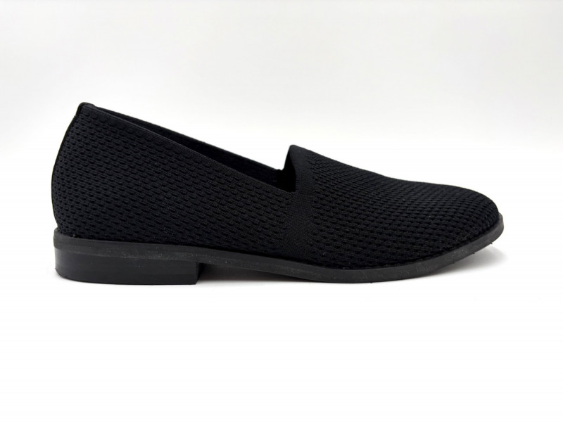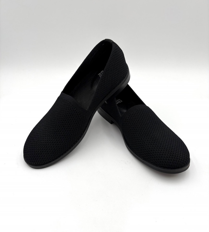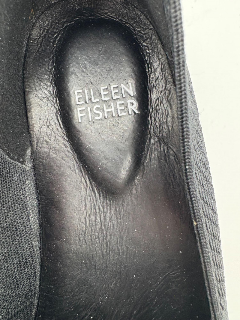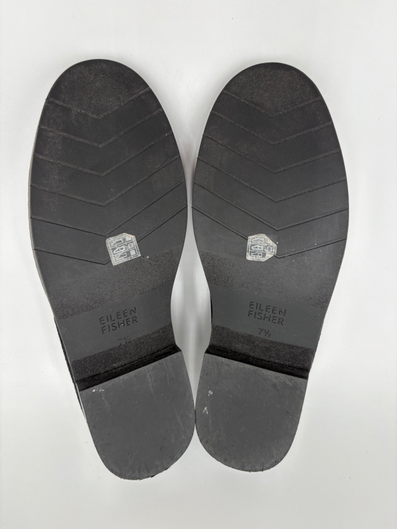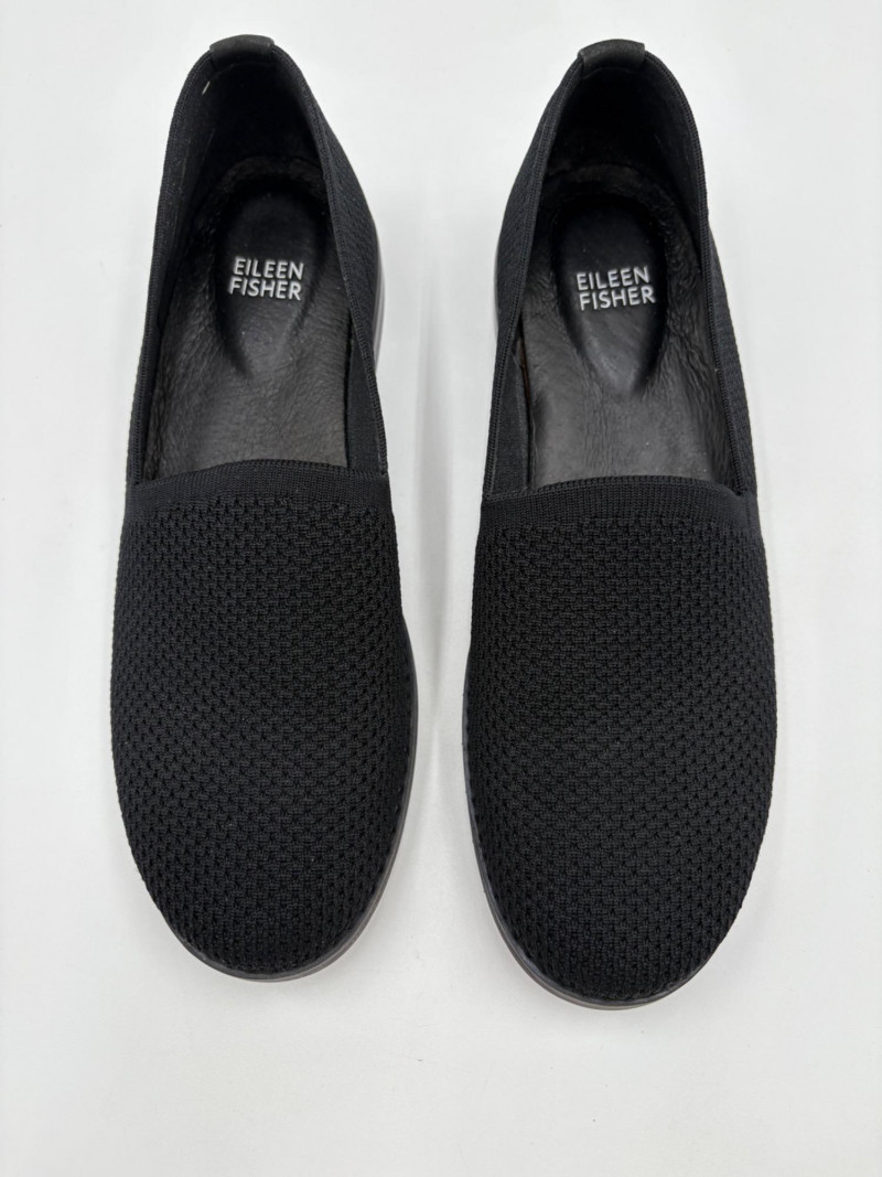 Nice pair of black casual slip-on loafers from Eileen Fisher. Black rubber sole, stacked heel, and black woven fabric on uppers with square-cut vamp. In excellent condition with barely any wear shown on the soles. Size 7