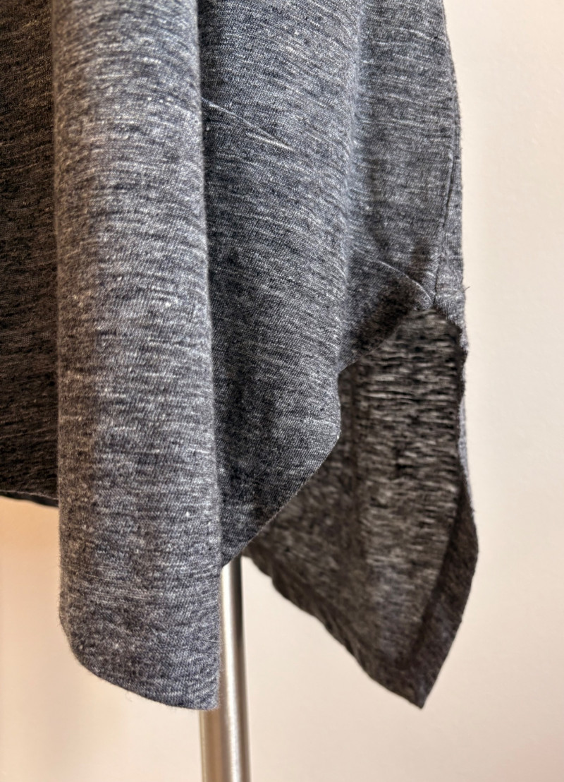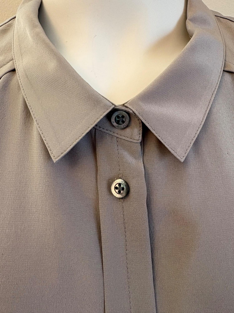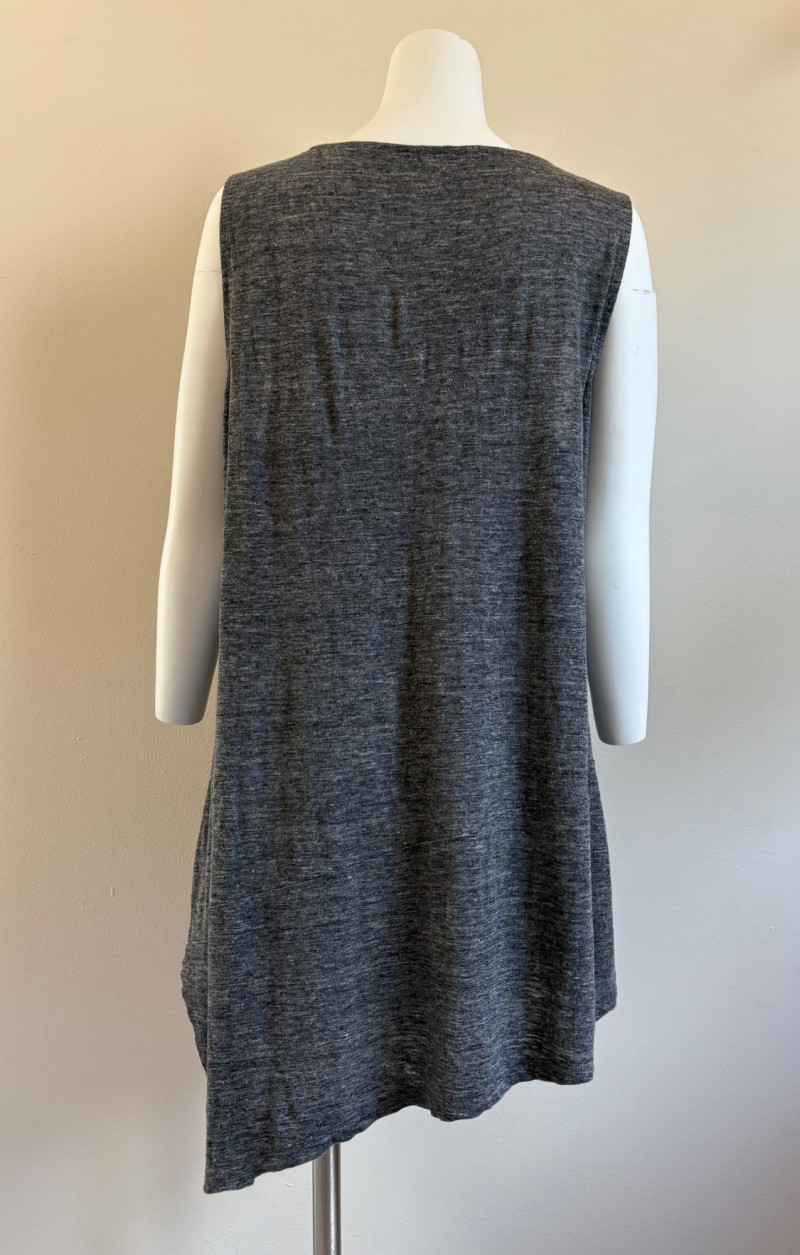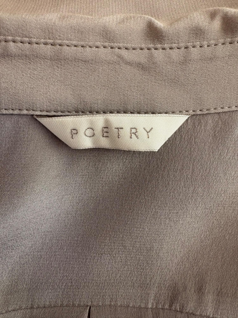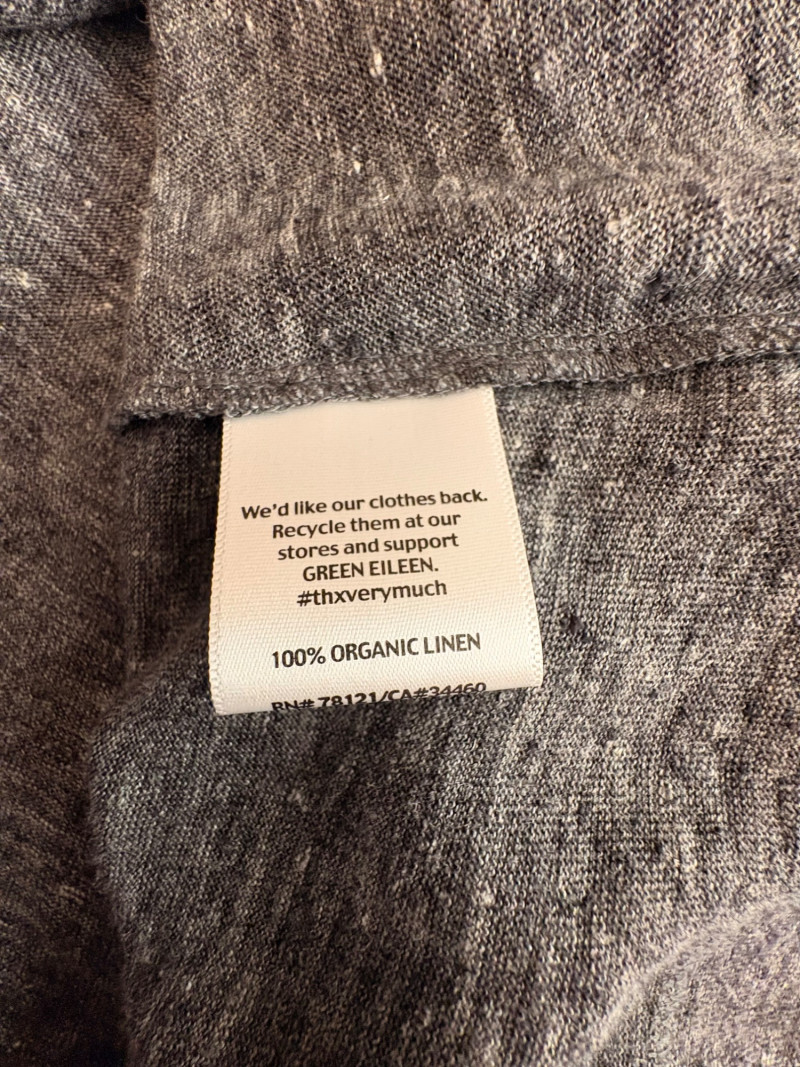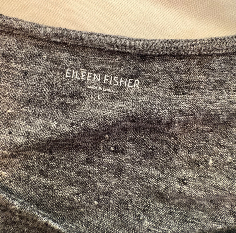 Shades of grey from Poetry and Eileen Fisher. Marled grey knit tunic from Eileen Fisher has scoop neck and single split asymmetrical hemline. In excellent condition. 100% linen. Measures 21" pit to pit and 33" from center back neck to center back hem (longer as it goes to the split).Size tag says L. Grey-brown silk shirt from Poetry has button front closure with placket, double button closure at cuffs with top stitching & pleats, angled front yoke, curved back yoke, and double-layered hem. In good used condition with one discoloration we think is a watermark and should launder out - see last photo. 100% silk. Measures 24" pit to pit and 27" from back neckline to bottom back hem. Size tag says 18.