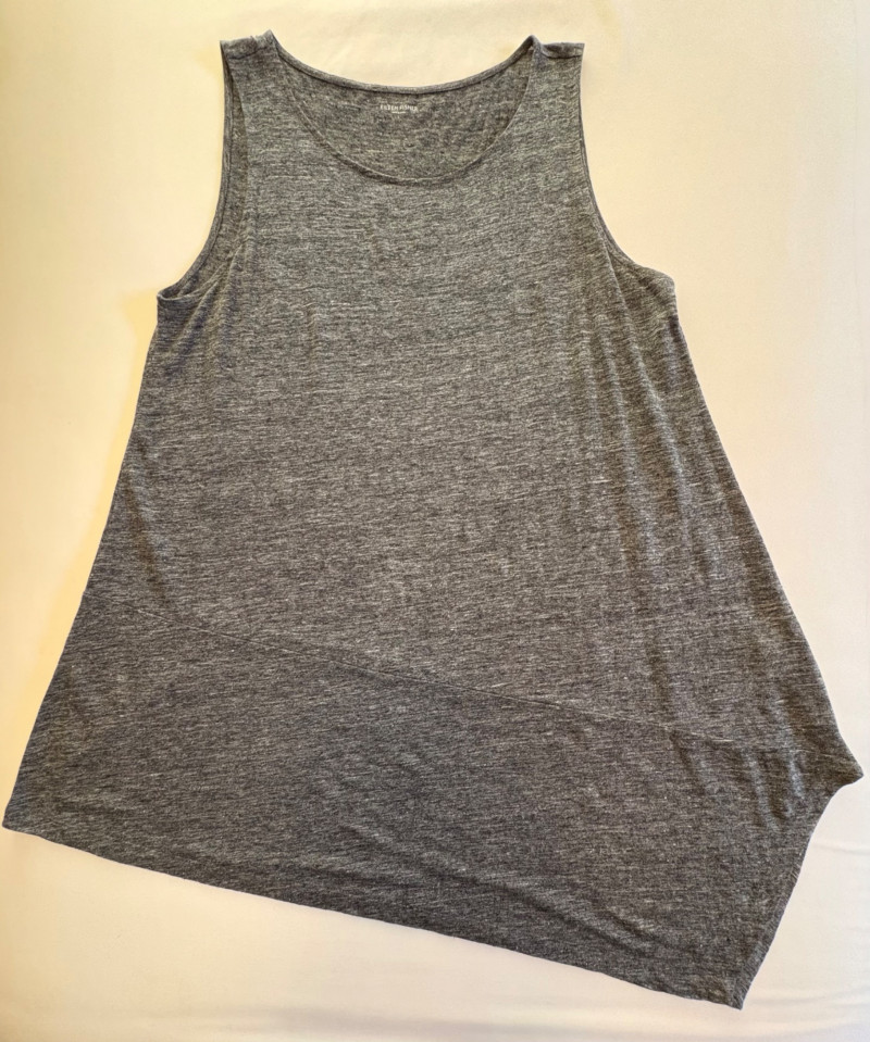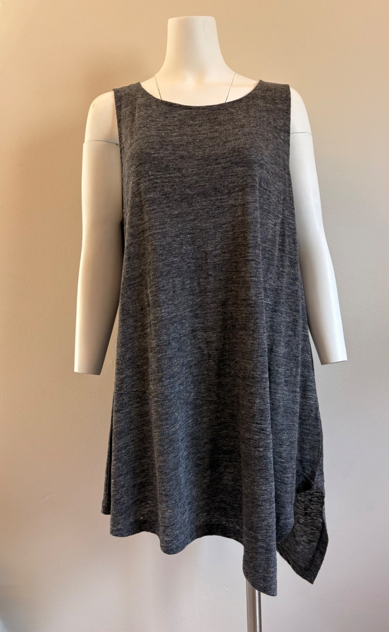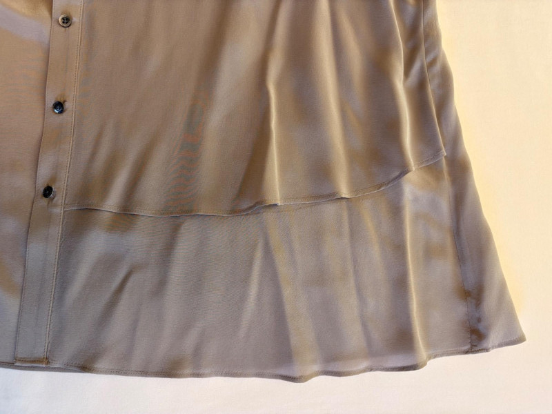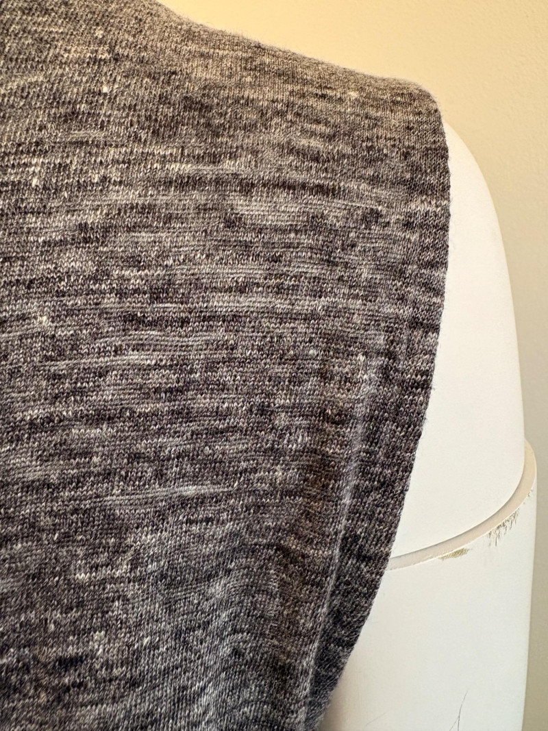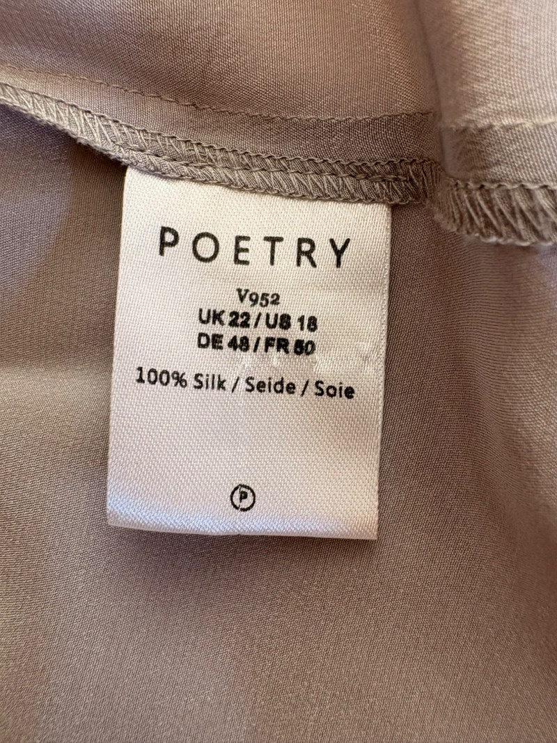 Shades of grey from Poetry and Eileen Fisher. Marled grey knit tunic from Eileen Fisher has scoop neck and single split asymmetrical hemline. In excellent condition. 100% linen. Measures 21" pit to pit and 33" from center back neck to center back hem (longer as it goes to the split).Size tag says L. Grey-brown silk shirt from Poetry has button front closure with placket, double button closure at cuffs with top stitching & pleats, angled front yoke, curved back yoke, and double-layered hem. In good used condition with one discoloration we think is a watermark and should launder out - see last photo. 100% silk. Measures 24" pit to pit and 27" from back neckline to bottom back hem. Size tag says 18.