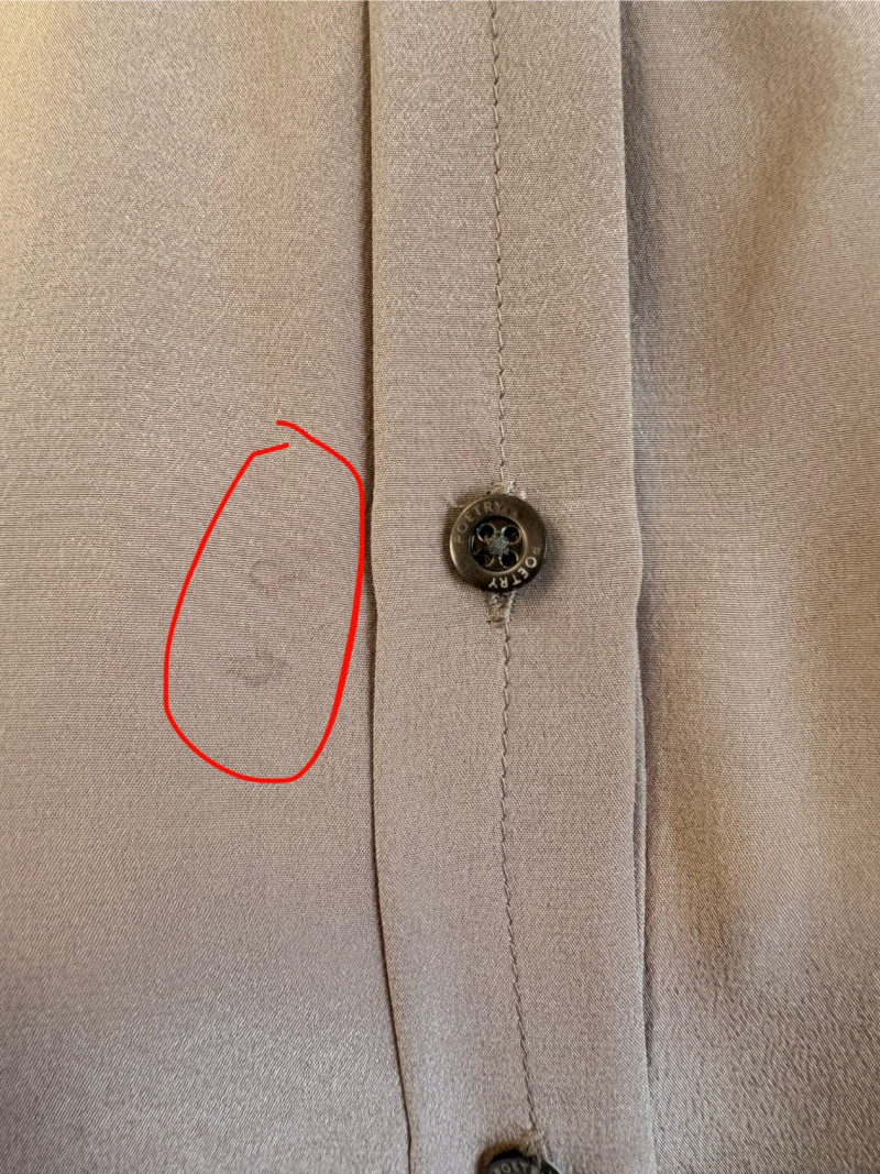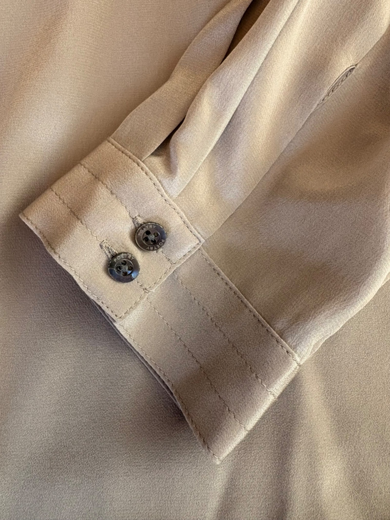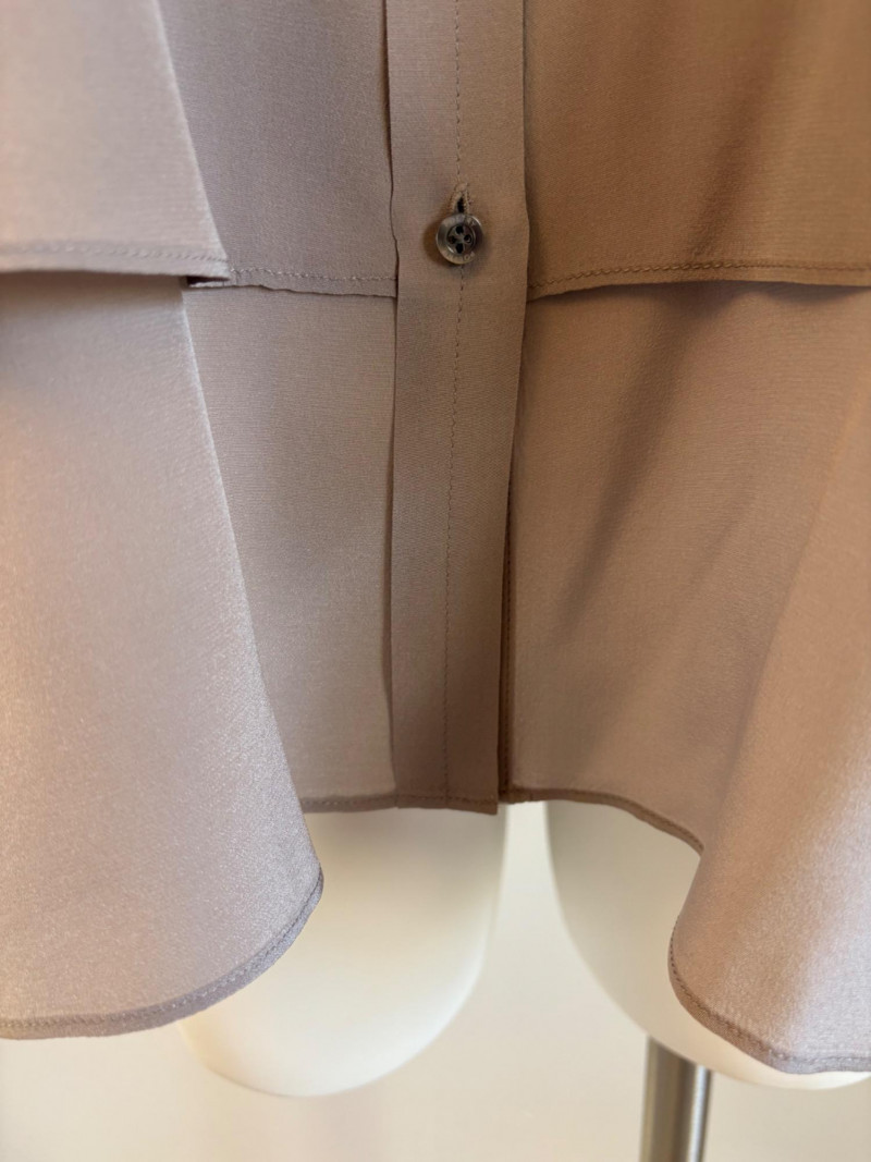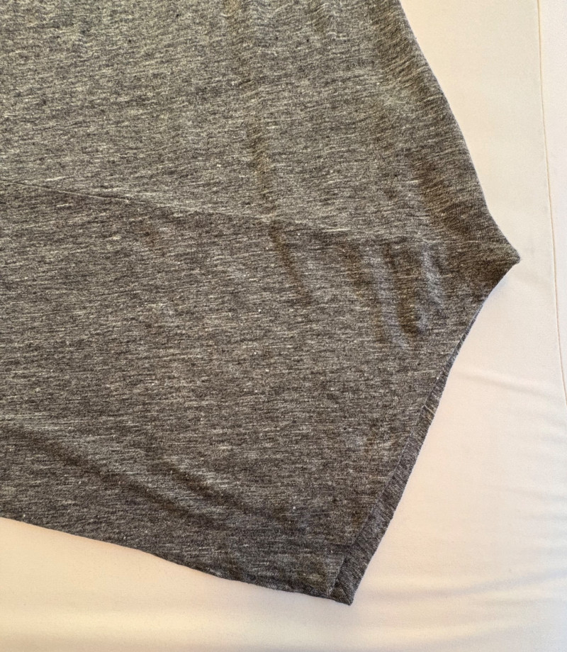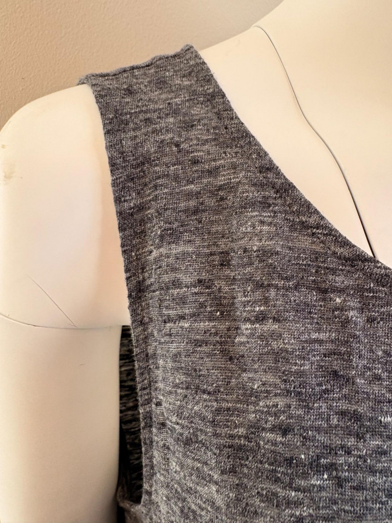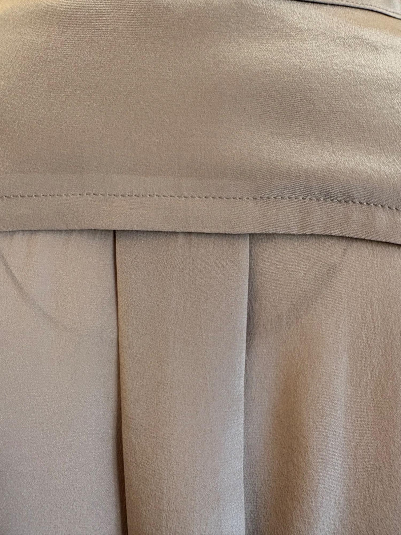 Shades of grey from Poetry and Eileen Fisher. Marled grey knit tunic from Eileen Fisher has scoop neck and single split asymmetrical hemline. In excellent condition. 100% linen. Measures 21" pit to pit and 33" from center back neck to center back hem (longer as it goes to the split).Size tag says L. Grey-brown silk shirt from Poetry has button front closure with placket, double button closure at cuffs with top stitching & pleats, angled front yoke, curved back yoke, and double-layered hem. In good used condition with one discoloration we think is a watermark and should launder out - see last photo. 100% silk. Measures 24" pit to pit and 27" from back neckline to bottom back hem. Size tag says 18.