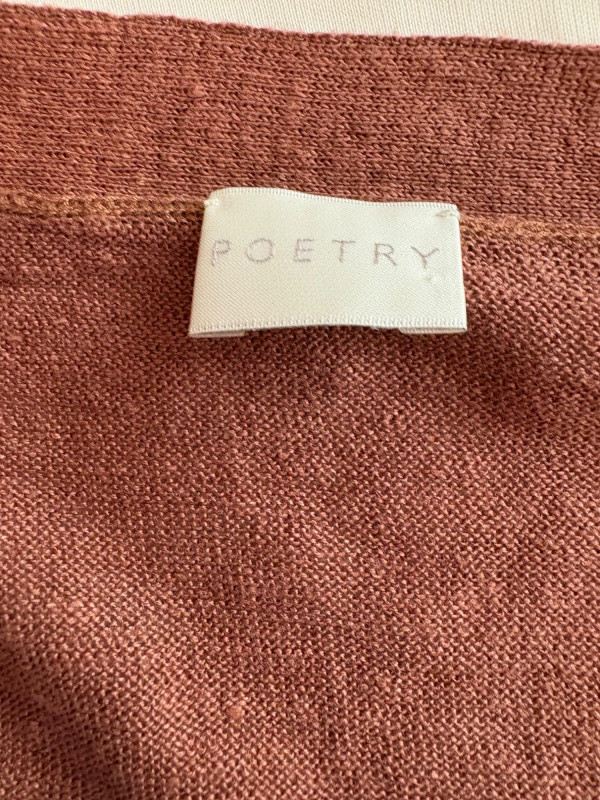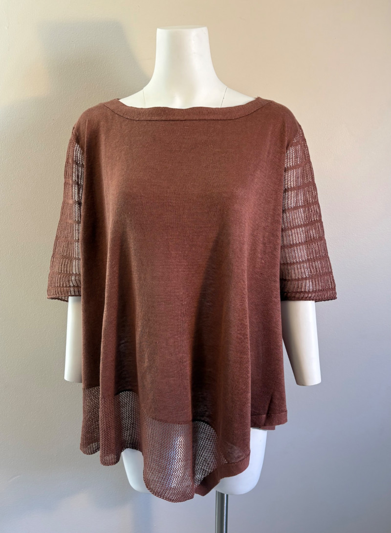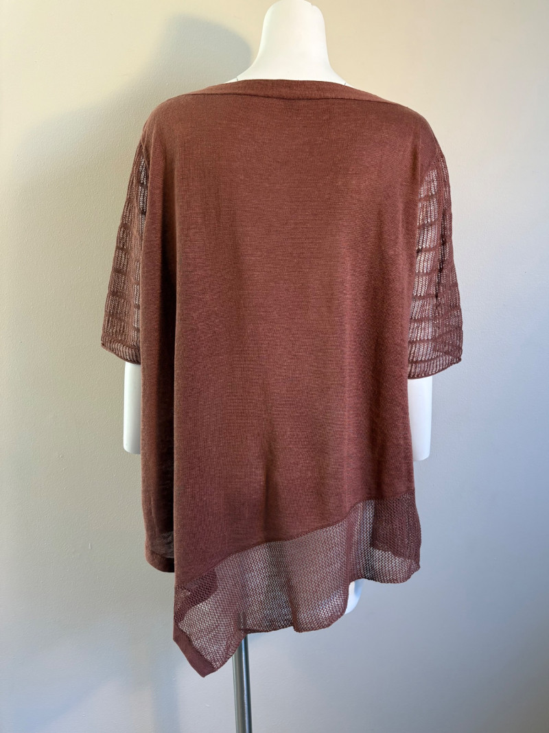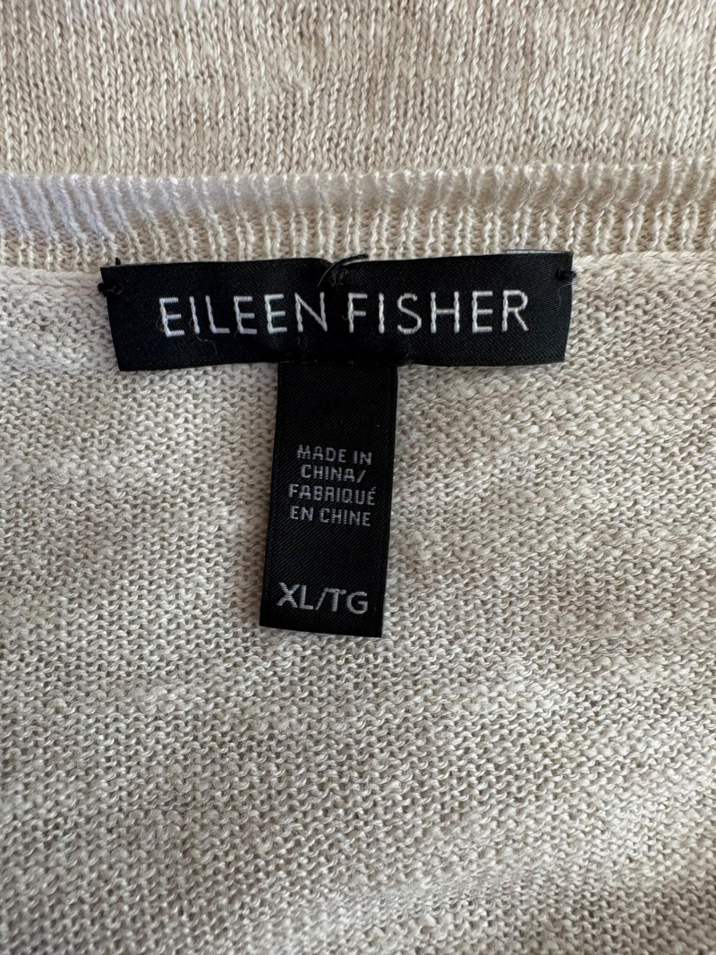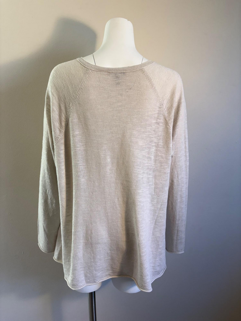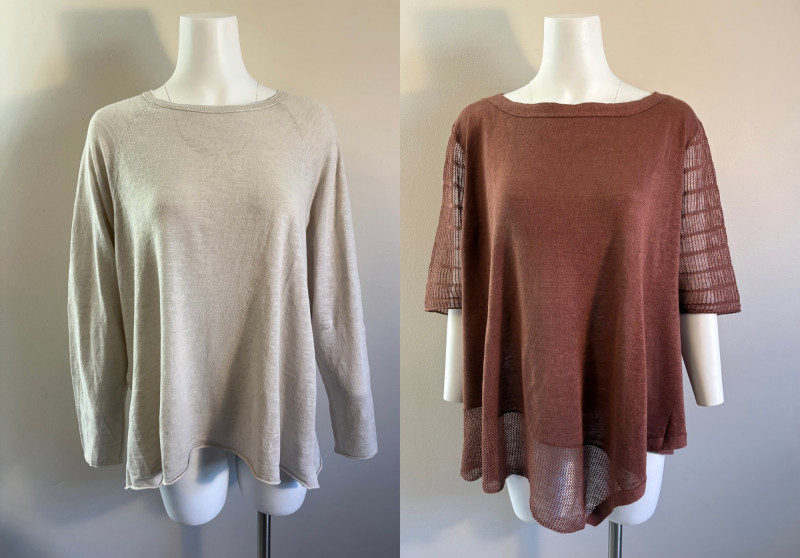 Two lightweight sweaters from Poetry and Eileen Fisher - perfect for seasonal transitions. Brown sweater from Poetry has open weave arms, round neck, and asymmetrical open weave hemline that comes to a point. In excellent condition. 100% linen. Measures 24" pit to pit and 31" from back neckline seam to asymmetric point of back hem. Size tag says 18. Super light creamy white sweater has ribbed neckline, rolled split hem, and raglan sleeves. 56% linen with 44% cotton. In excellent condition. Measures 23.5" to pit and 25" from back neck seam to bottom hem. Size tag says XL.