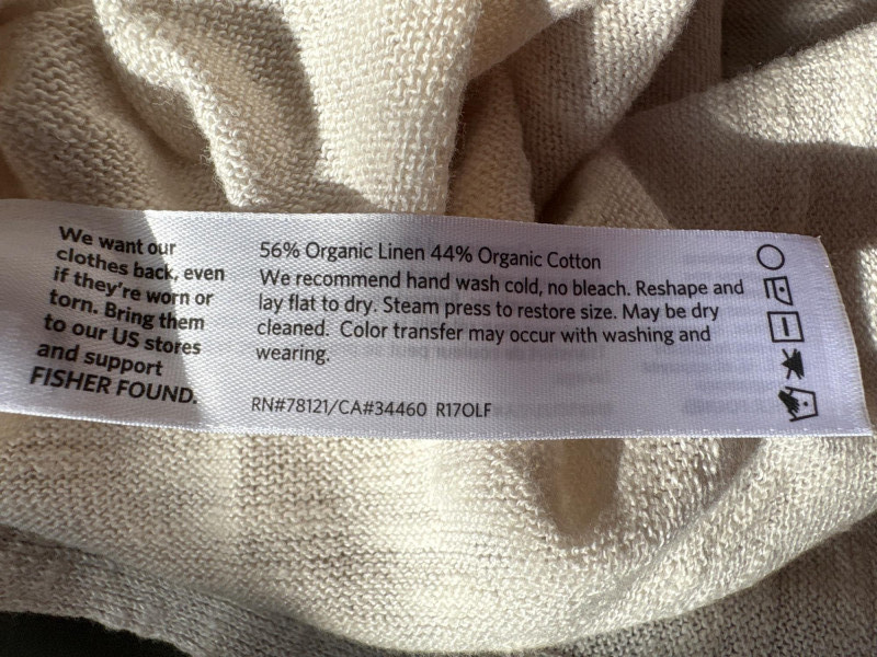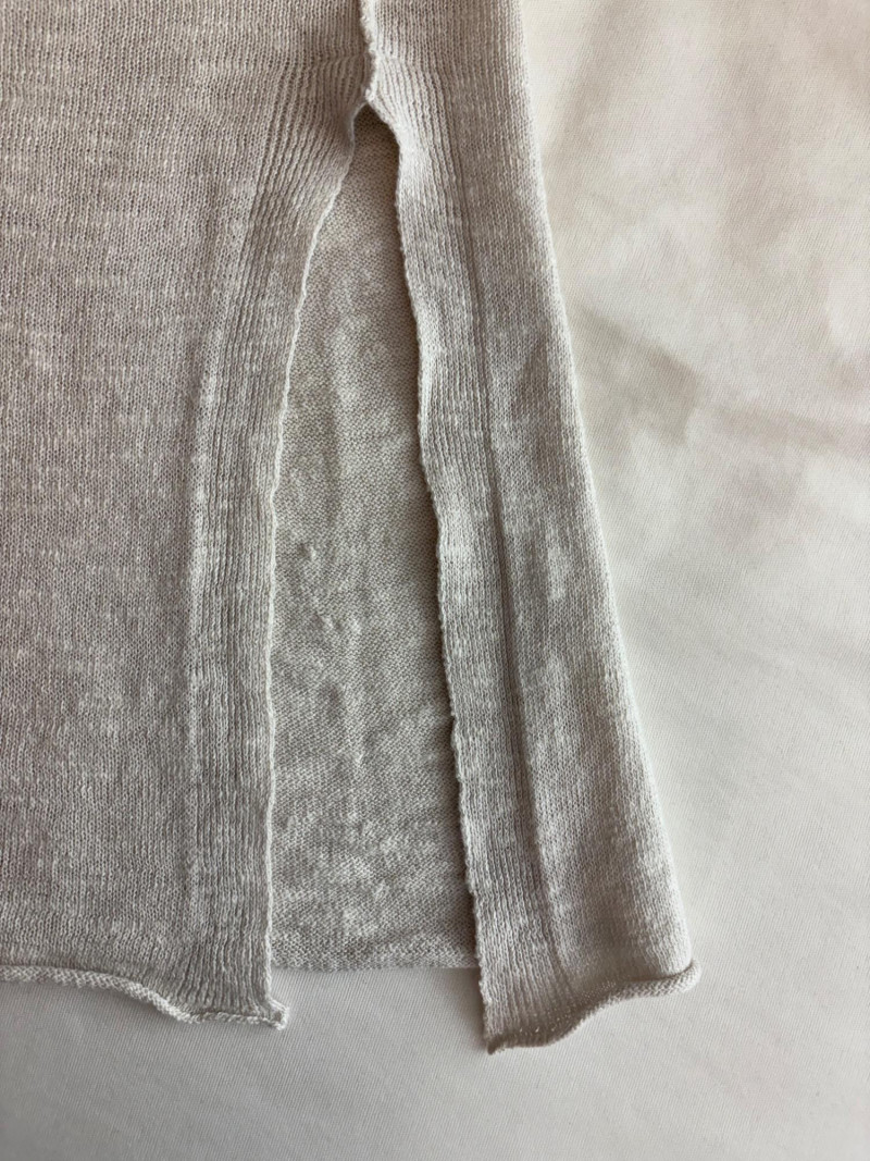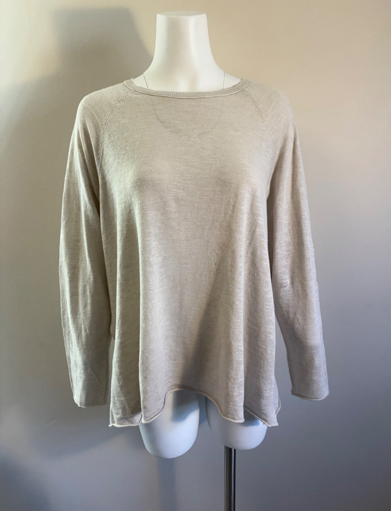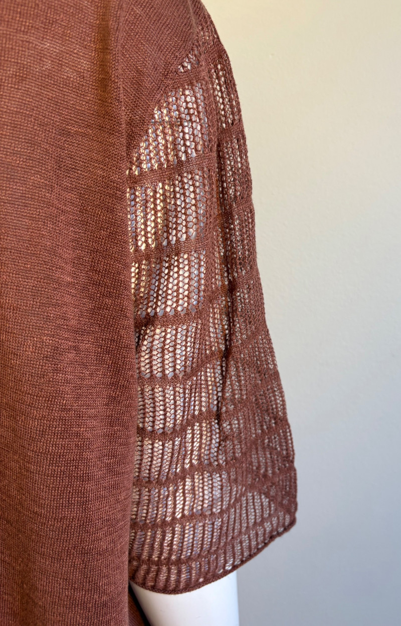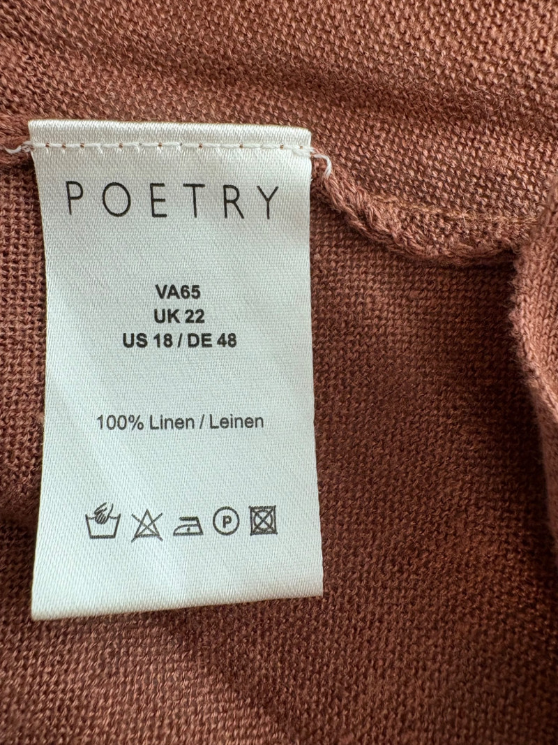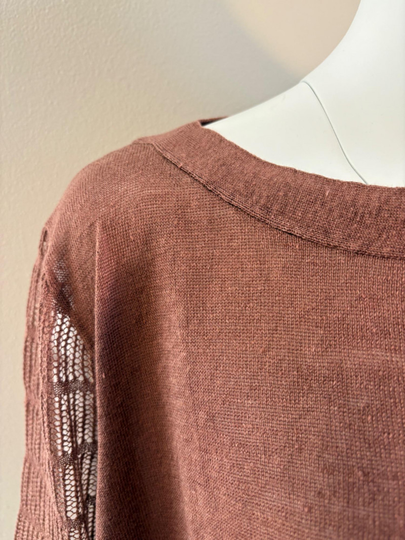 Two lightweight sweaters from Poetry and Eileen Fisher - perfect for seasonal transitions. Brown sweater from Poetry has open weave arms, round neck, and asymmetrical open weave hemline that comes to a point. In excellent condition. 100% linen. Measures 24" pit to pit and 31" from back neckline seam to asymmetric point of back hem. Size tag says 18. Super light creamy white sweater has ribbed neckline, rolled split hem, and raglan sleeves. 56% linen with 44% cotton. In excellent condition. Measures 23.5" to pit and 25" from back neck seam to bottom hem. Size tag says XL.