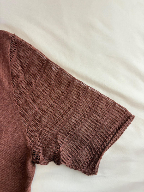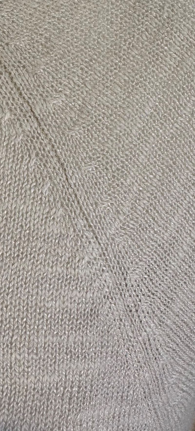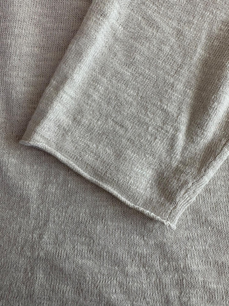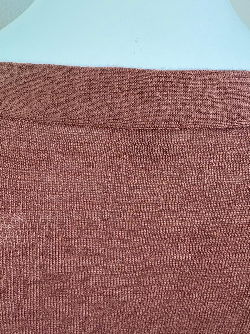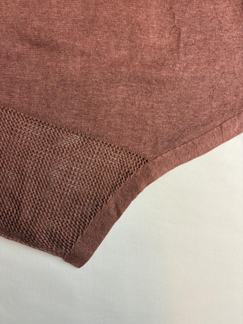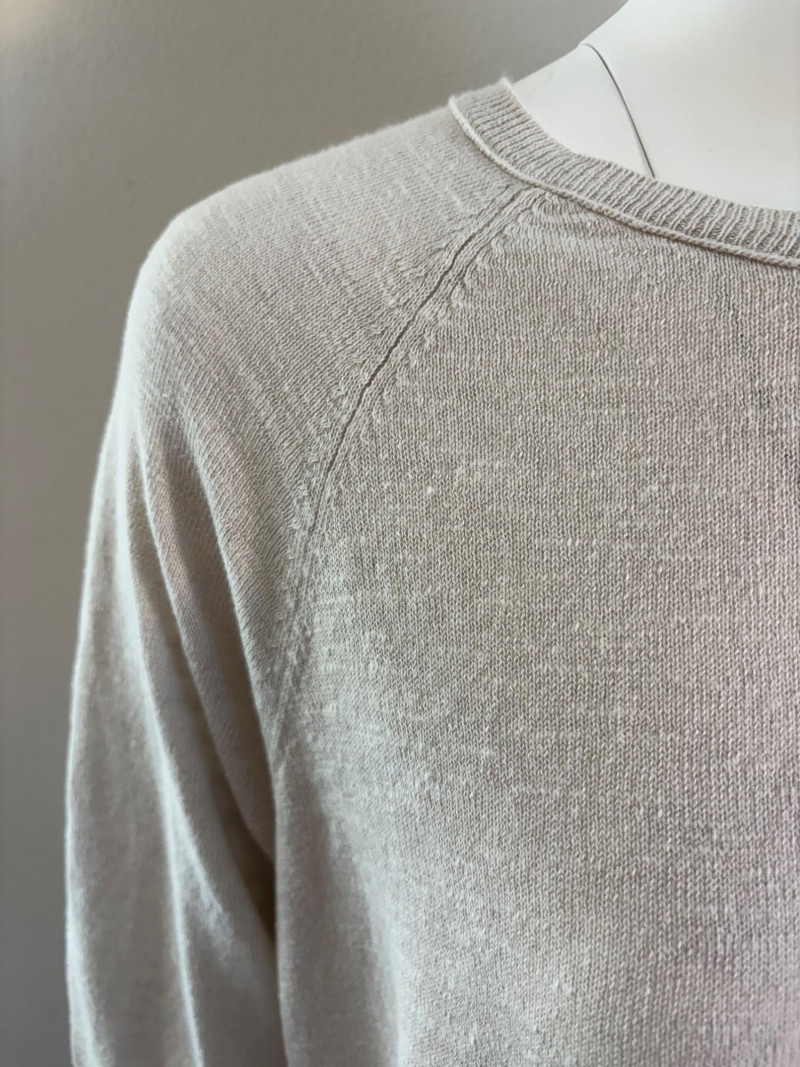 Two lightweight sweaters from Poetry and Eileen Fisher - perfect for seasonal transitions. Brown sweater from Poetry has open weave arms, round neck, and asymmetrical open weave hemline that comes to a point. In excellent condition. 100% linen. Measures 24" pit to pit and 31" from back neckline seam to asymmetric point of back hem. Size tag says 18. Super light creamy white sweater has ribbed neckline, rolled split hem, and raglan sleeves. 56% linen with 44% cotton. In excellent condition. Measures 23.5" to pit and 25" from back neck seam to bottom hem. Size tag says XL.