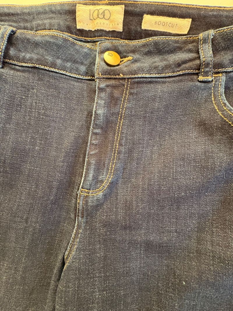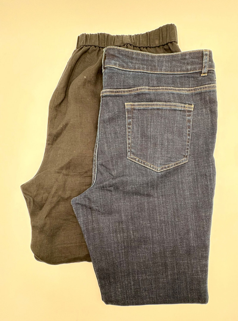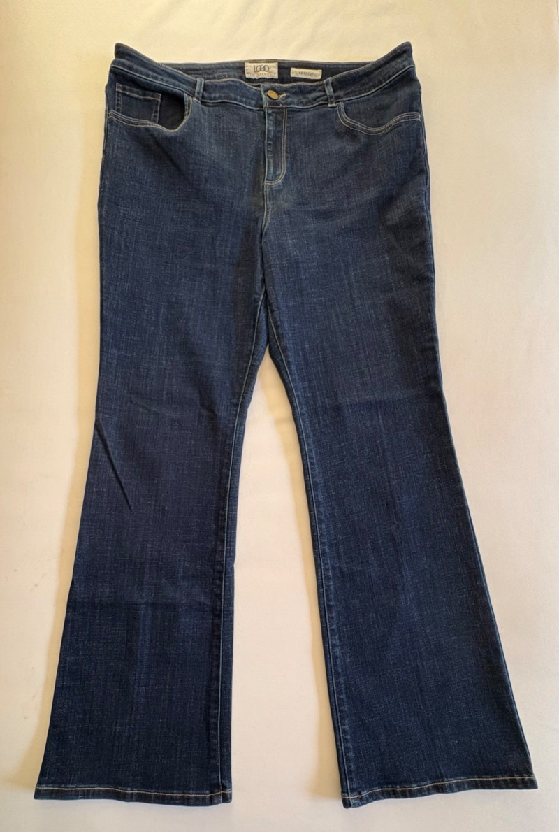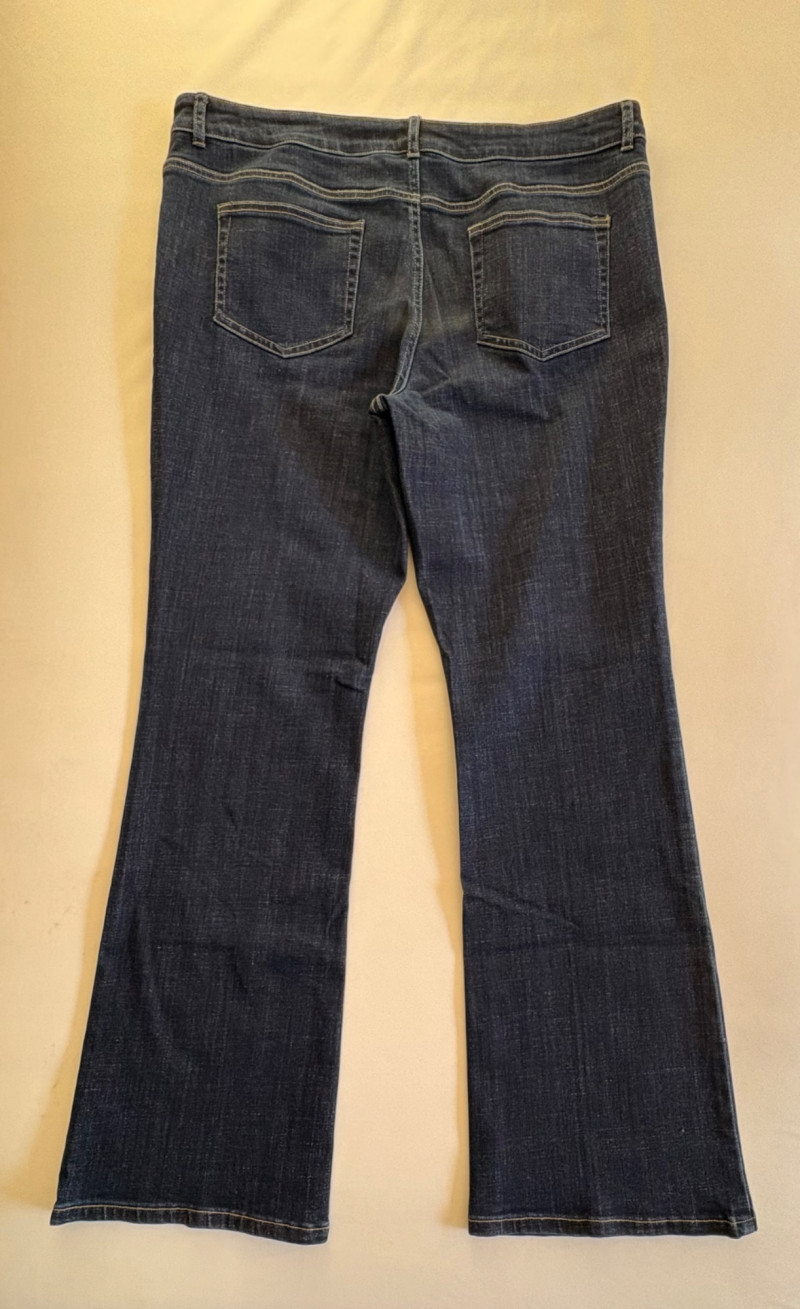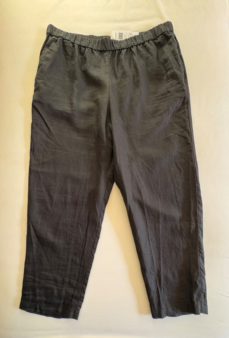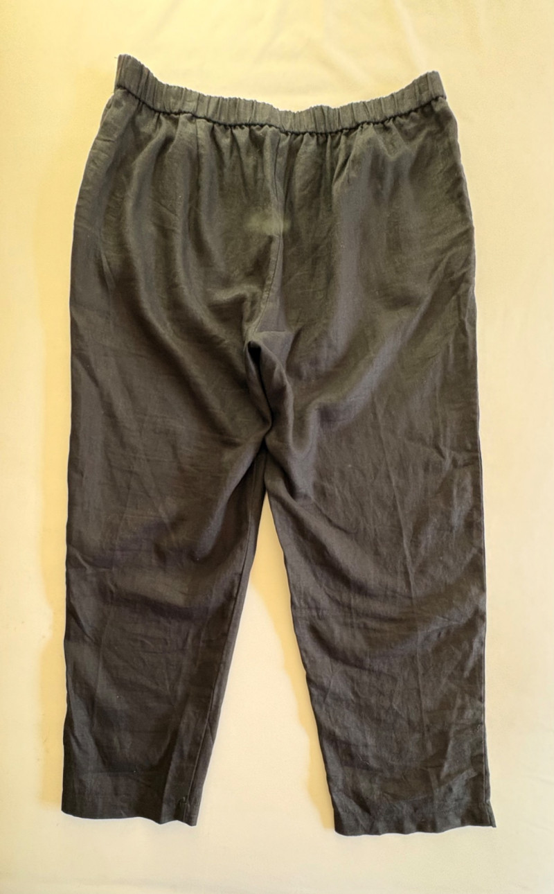 Casual and dressy in one lot from Eileen Fisher & Lori Goldstein Logo. Black linen pants have wide elasticated waistband, set-in side front pockets, back darts, and tapered legs. New with tag. 100% linen. Measures 19" side to side at waist with 27" inseam. Size tag says XL. Dark wash denim jeans from Lori Goldstein Logo have zip fly front and classic 5-pocket jeans styling. In excellent condition - no signs of being worn. 61% cotton, 23 % Lyocell,14% polyester, and 2% spandex. Measure 19" side to side at waist with 30.5" inseam. Size tag says 16.