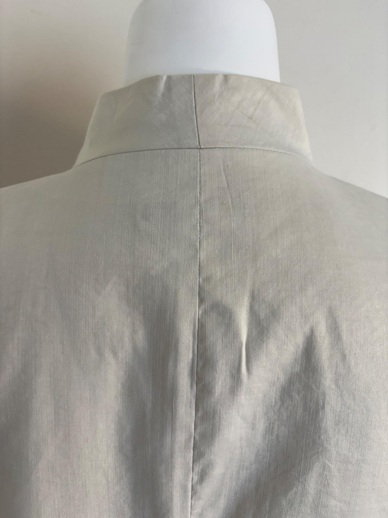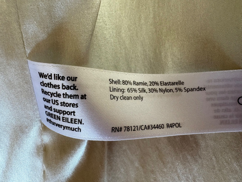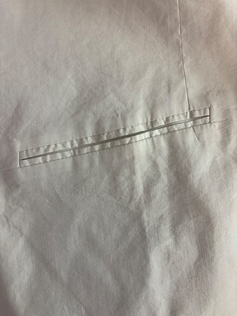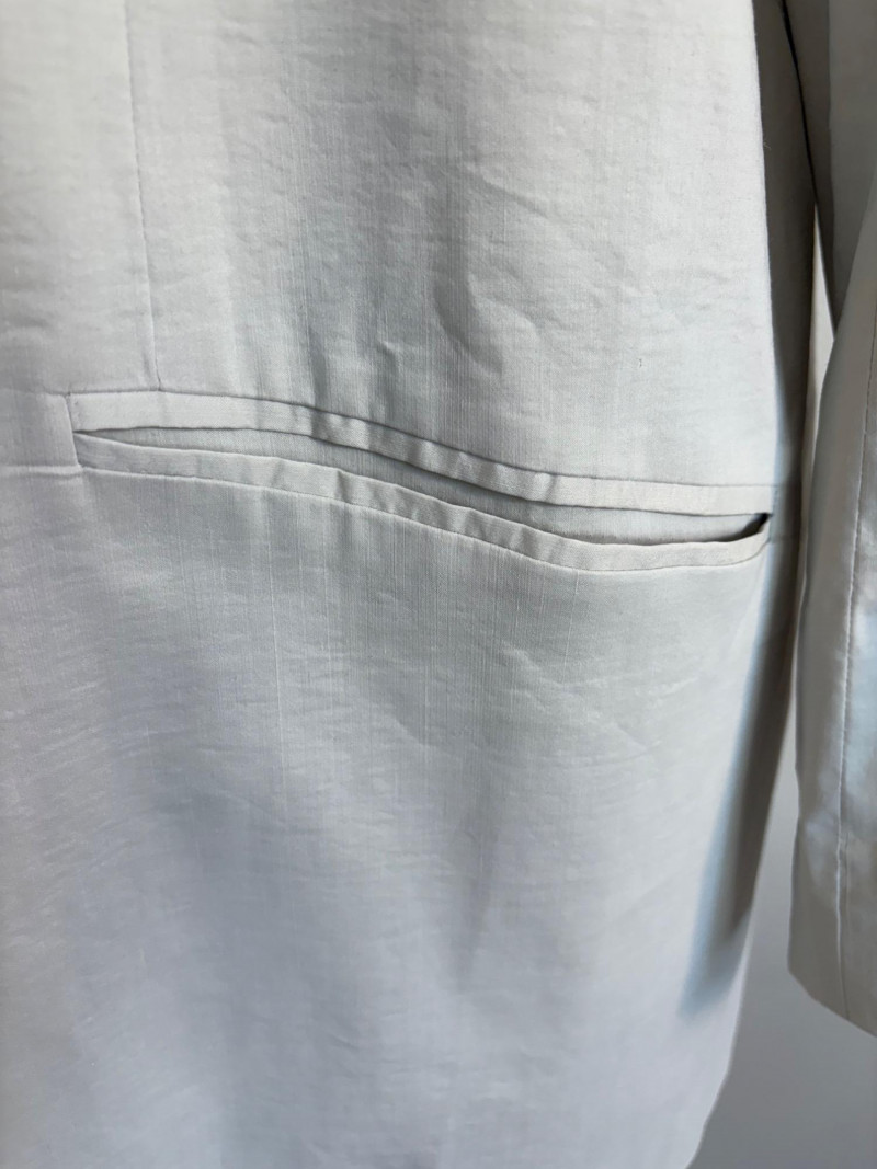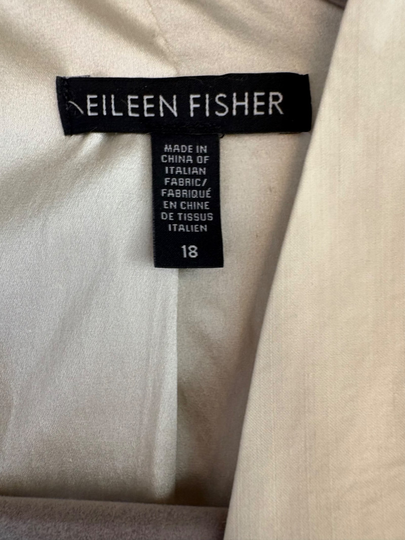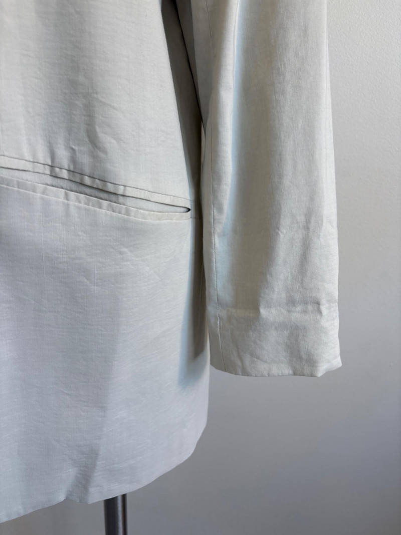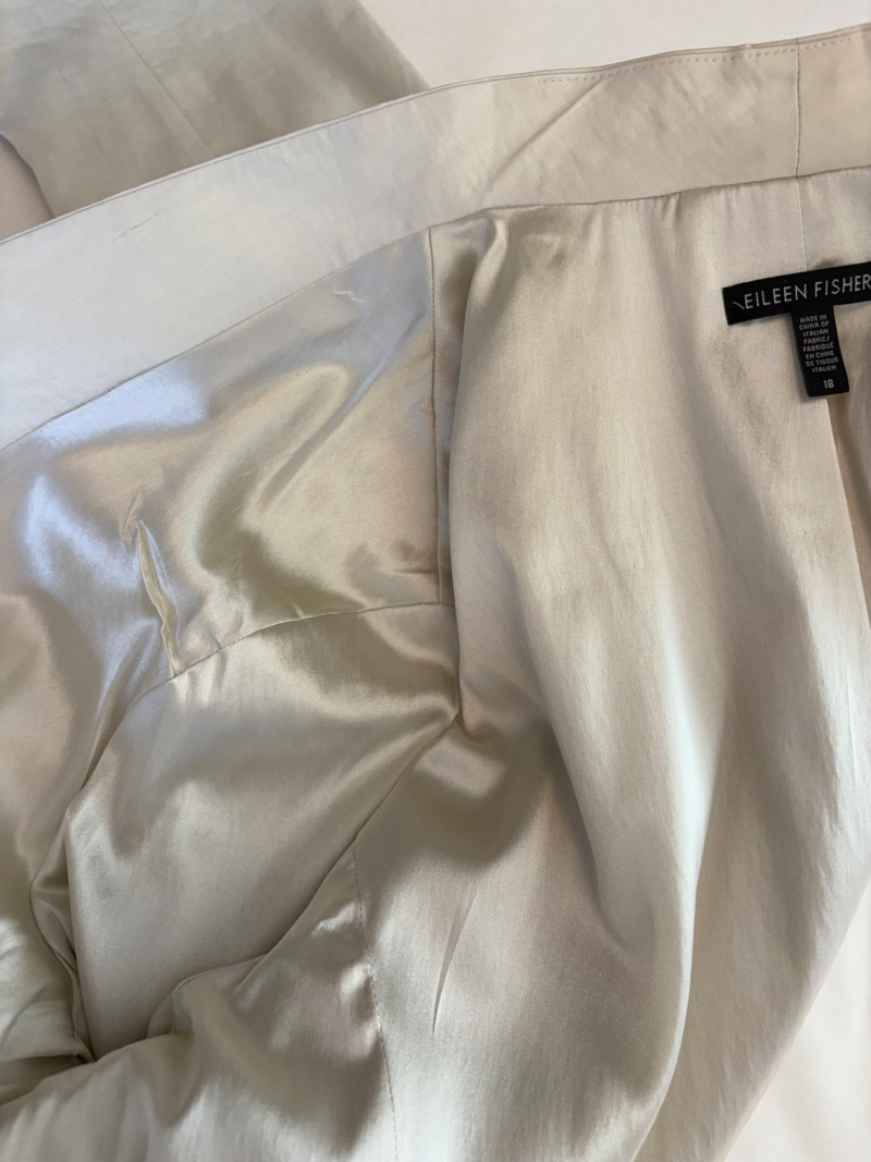 Amazing cream tuxedo jacket with elegant construction from Eileen Fisher. Has curved collar, open front, welted front slash pockets, two-piece sleeve, modified princess seams, and back vent. 80% ramie with 20% estarelle, Fully lined in silk blend. In excellent condition except for a very slight mark we noticed while photographing that may launder out - see last photo. Measures 23" pit to pit and 32" from back neck seam to back bottom hem.. Size tag says 18, but would probably fit a little larger because of open front and tailoring.
