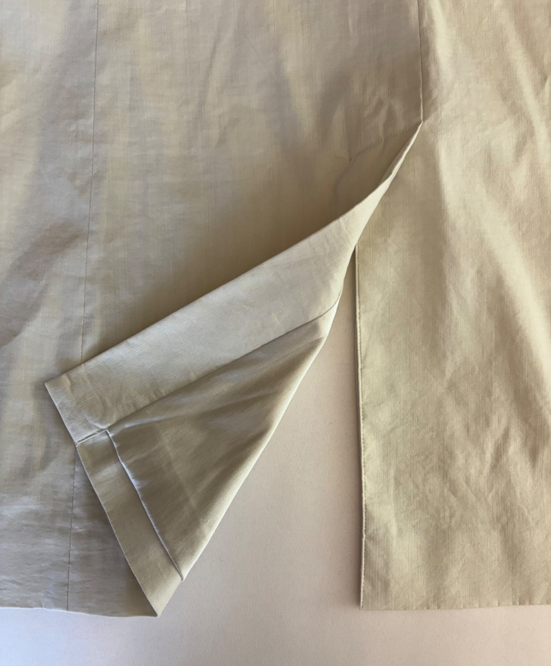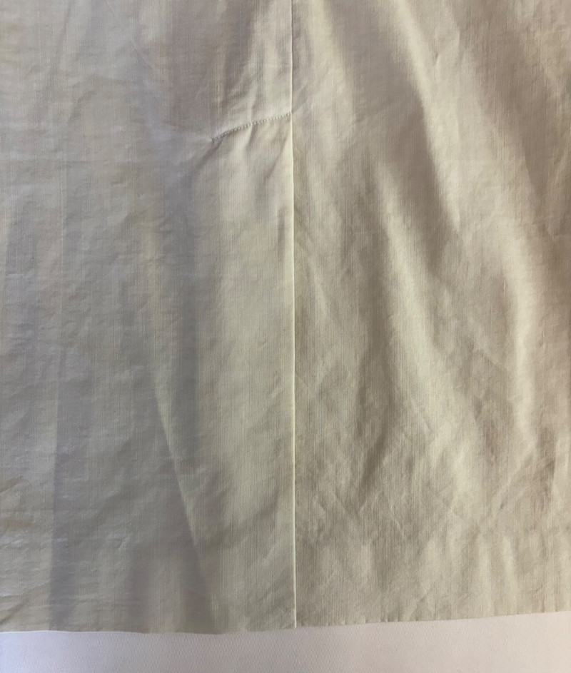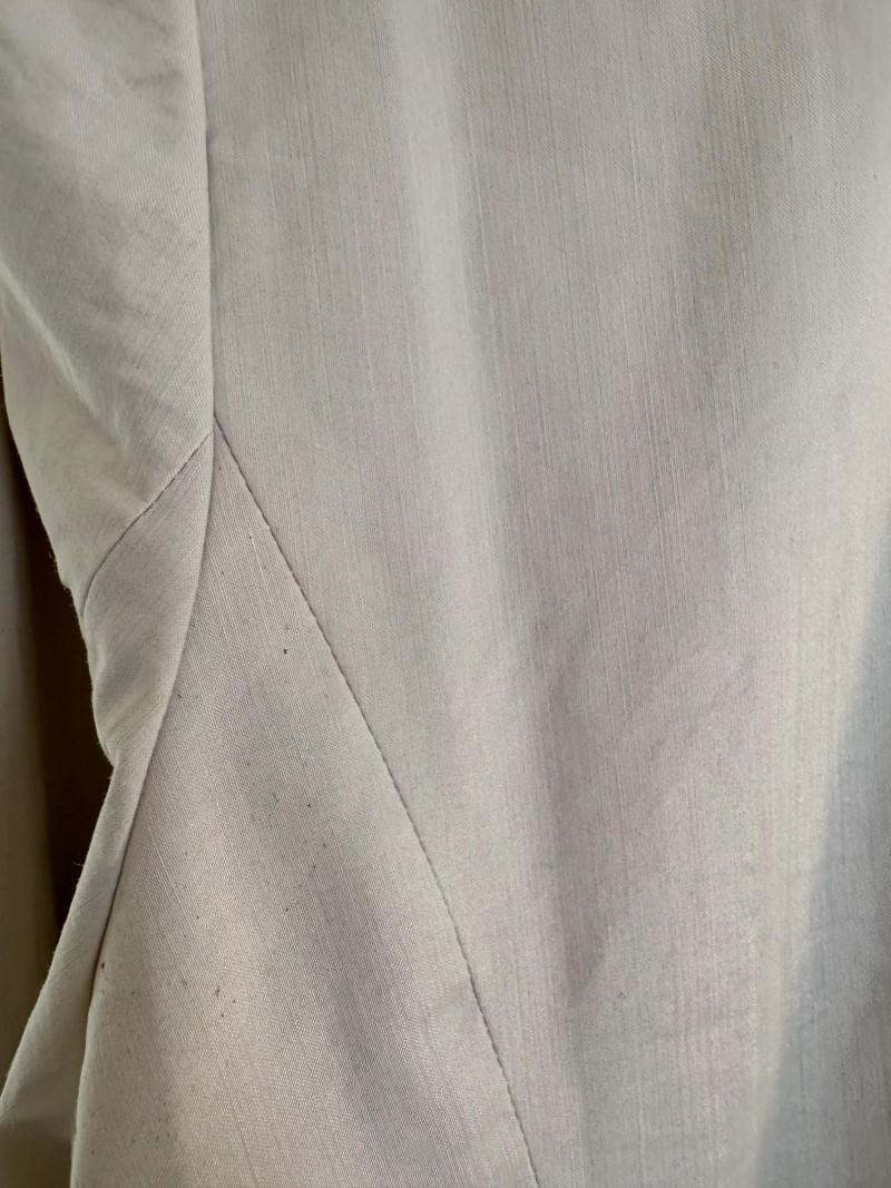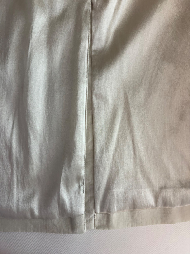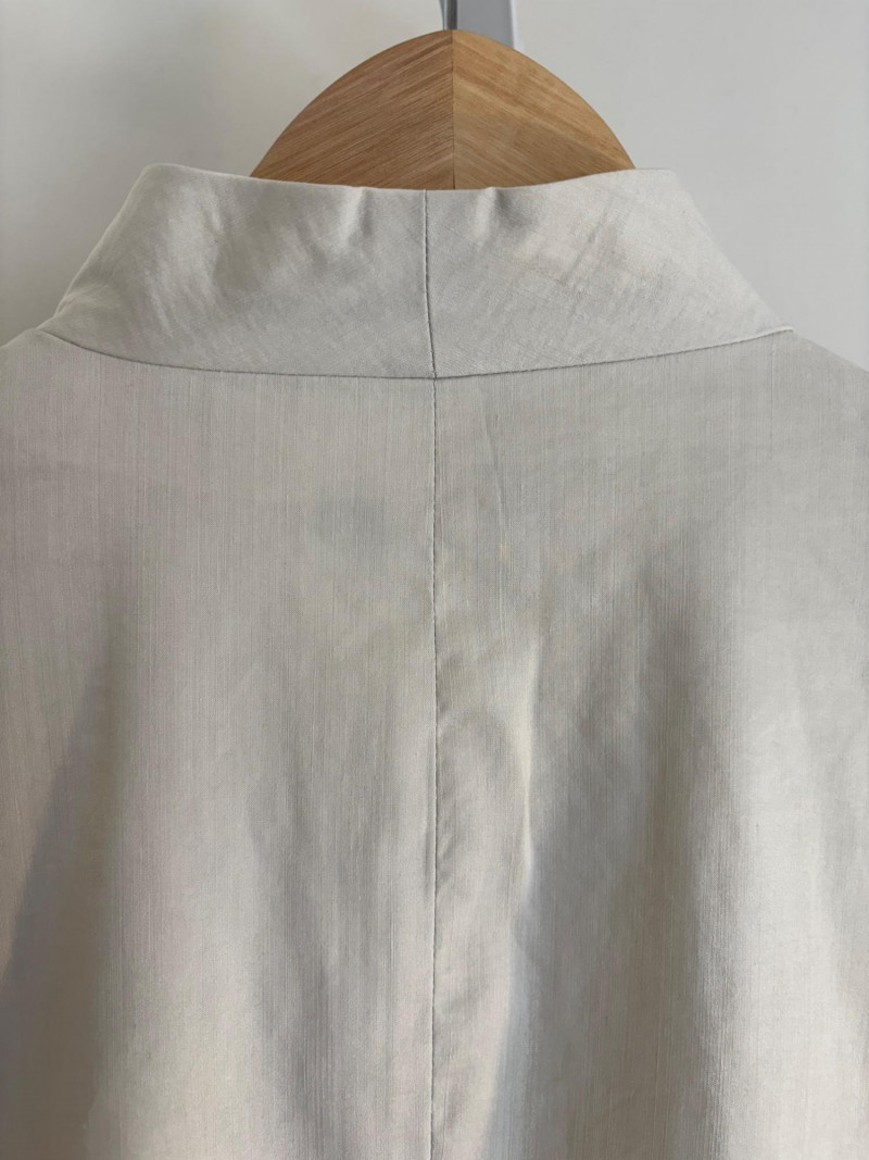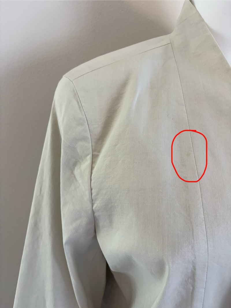 Amazing cream tuxedo jacket with elegant construction from Eileen Fisher. Has curved collar, open front, welted front slash pockets, two-piece sleeve, modified princess seams, and back vent. 80% ramie with 20% estarelle, Fully lined in silk blend. In excellent condition except for a very slight mark we noticed while photographing that may launder out - see last photo. Measures 23" pit to pit and 32" from back neck seam to back bottom hem.. Size tag says 18, but would probably fit a little larger because of open front and tailoring.