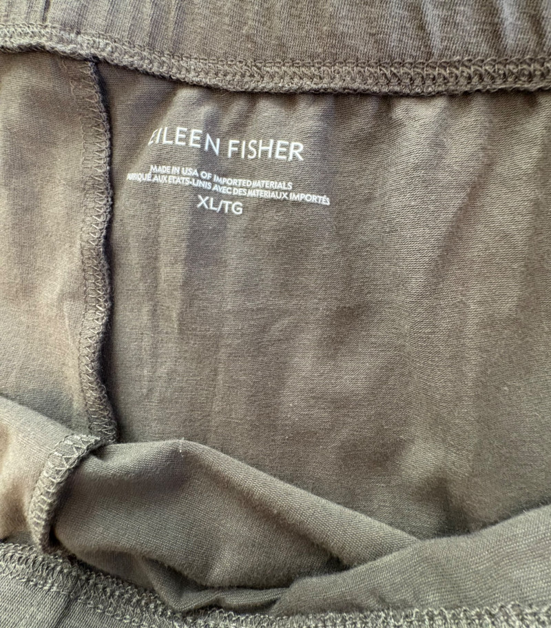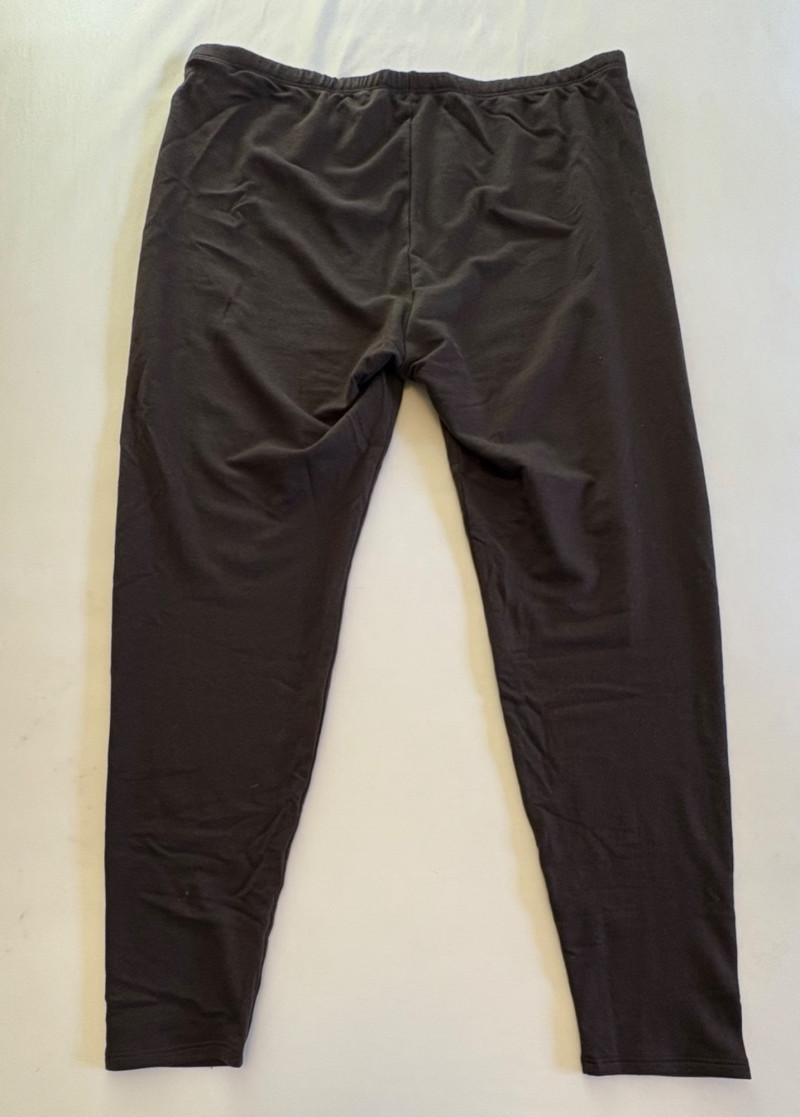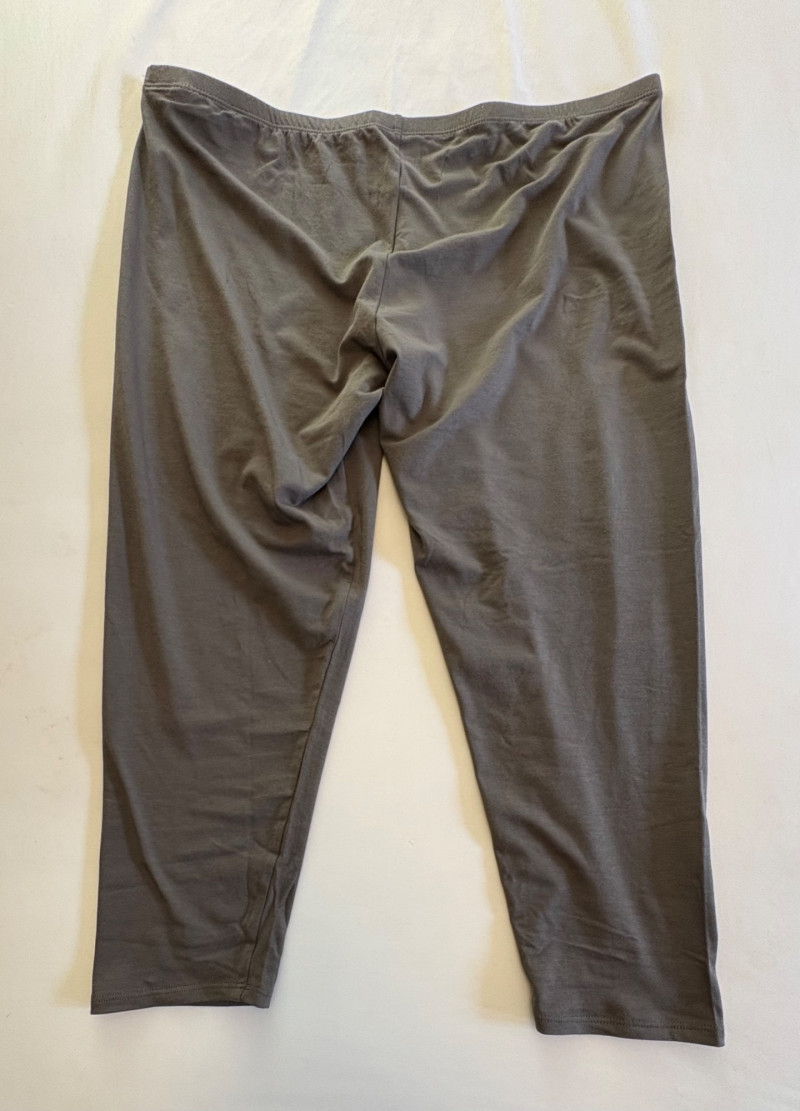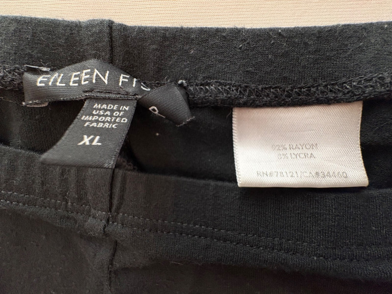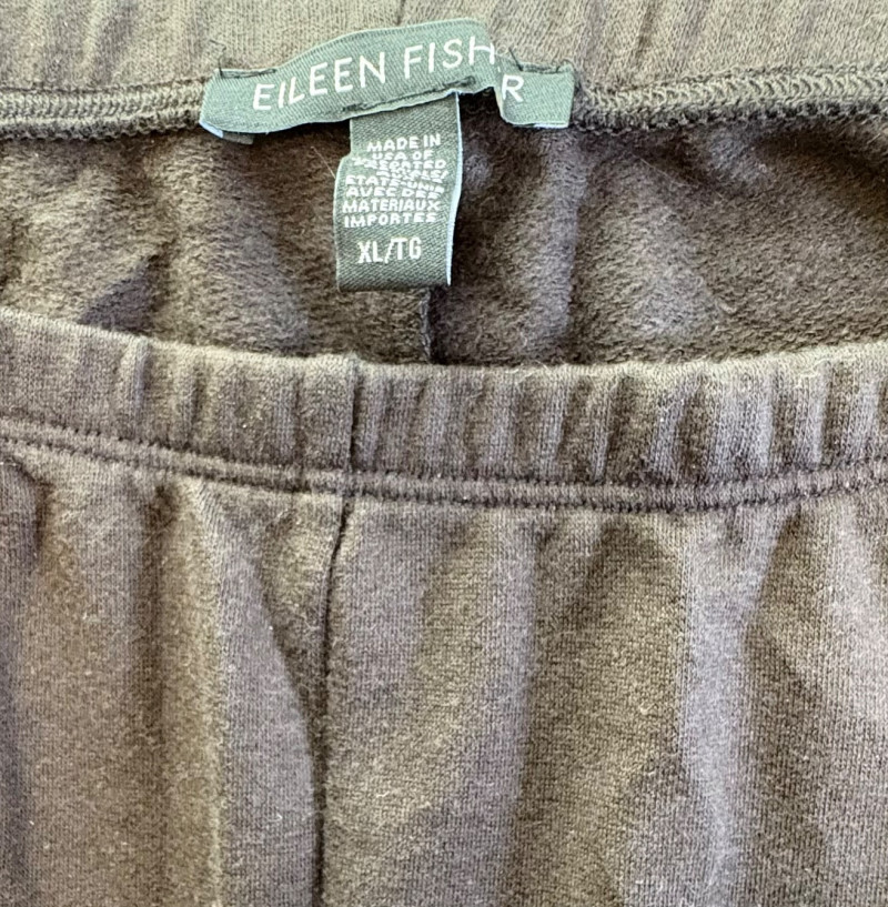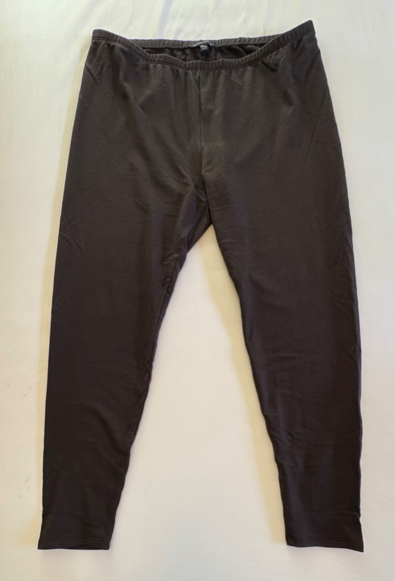 Trio of high-quality leggings in super smooth stretchy knit from Eileen Fisher. All three have elasticated waistband, tapered legs, and are in very good used condition. Black pair is made of 92% rayon with 8% Lycra. Measures 18" side to side at waist with 27" inseam. Size tag says XL. Dark brown hair is made of 60% Tencel and 28% organic cotton with 7% elastane. Measures 17" side to side at waist with 26.5" inseam. Size tag says XL. Dark taupe Is made of 92% organic cotton with 8% spandex. Measures 17.5" side side waist with 22" inseam. Size tag says XL Note that these are slightly cropped.