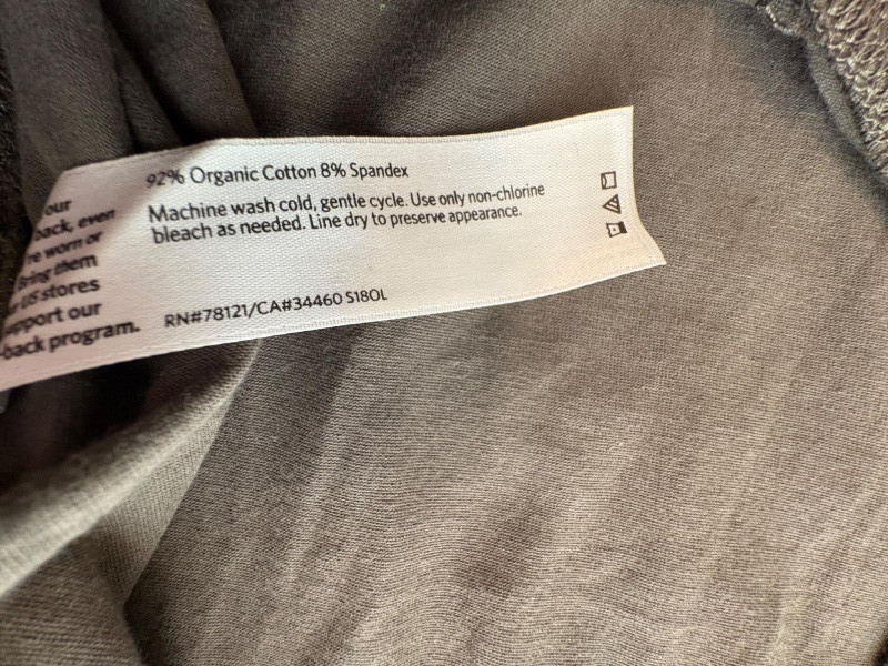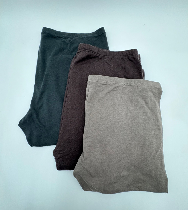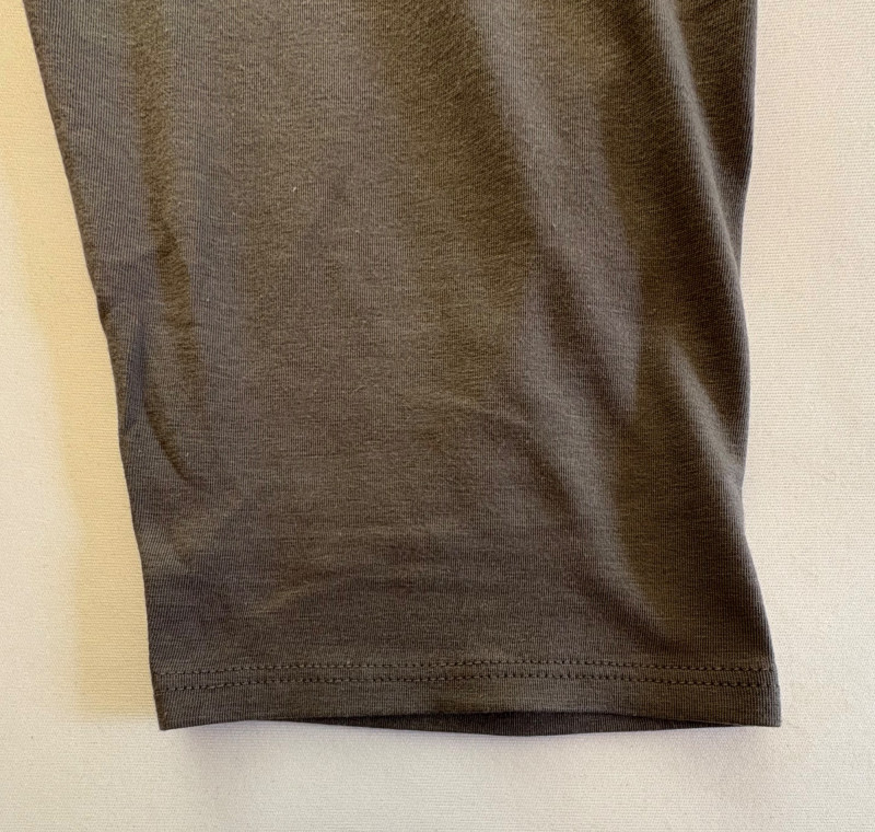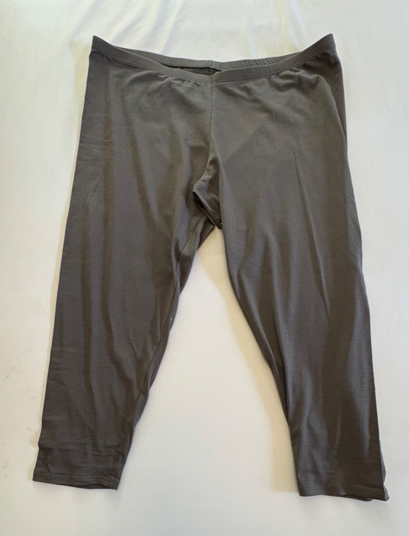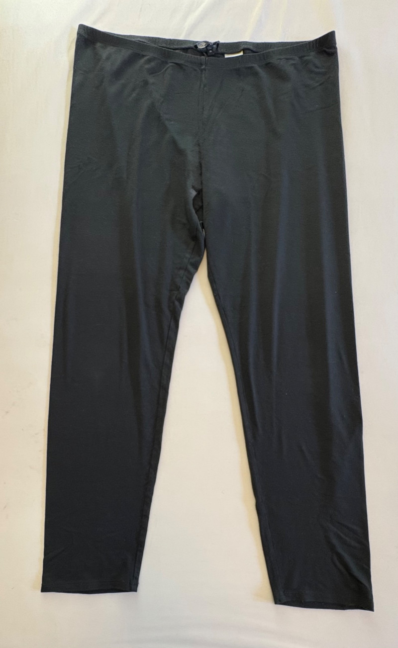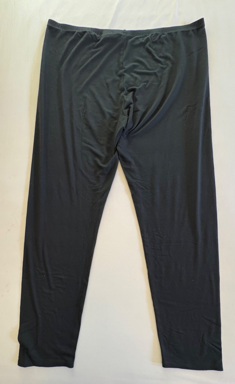 Trio of high-quality leggings in super smooth stretchy knit from Eileen Fisher. All three have elasticated waistband, tapered legs, and are in very good used condition. Black pair is made of 92% rayon with 8% Lycra. Measures 18" side to side at waist with 27" inseam. Size tag says XL. Dark brown hair is made of 60% Tencel and 28% organic cotton with 7% elastane. Measures 17" side to side at waist with 26.5" inseam. Size tag says XL. Dark taupe Is made of 92% organic cotton with 8% spandex. Measures 17.5" side side waist with 22" inseam. Size tag says XL Note that these are slightly cropped.
