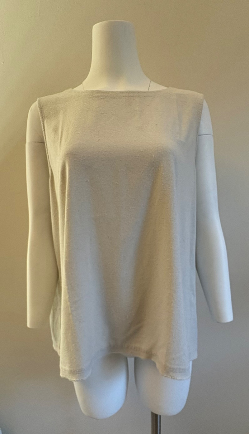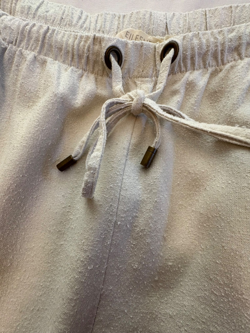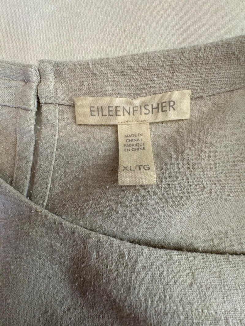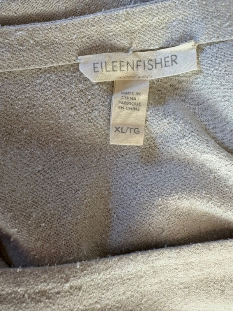 Three wonderful ivory separates in silk noil from Eileen Fisher. Simple curved neck shell has single button back neck closure and purposely frayed hem band. In very good used condition. 100% silk noil. Measures 23" pit to pit and 24" from back neckline to back hemline. Size tag says XL. Long sleeve top has curved neckline and purposely frayed split hem band. In very good used condition. 100% silk noil. Measures 25.5" pit to pit and 24.5" from back neckline to back bottom hem. Size tag says XL. Wide leg pants have elasticated waistline with metal capped drawstring and set-in side front pockets. In very good used condition. 100% silk noil. Measure 23" side to side at waist with 24" inseam. Size tag XL.