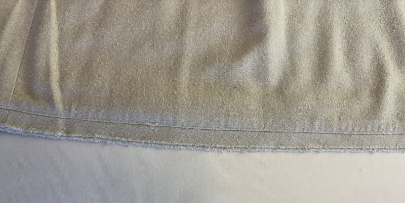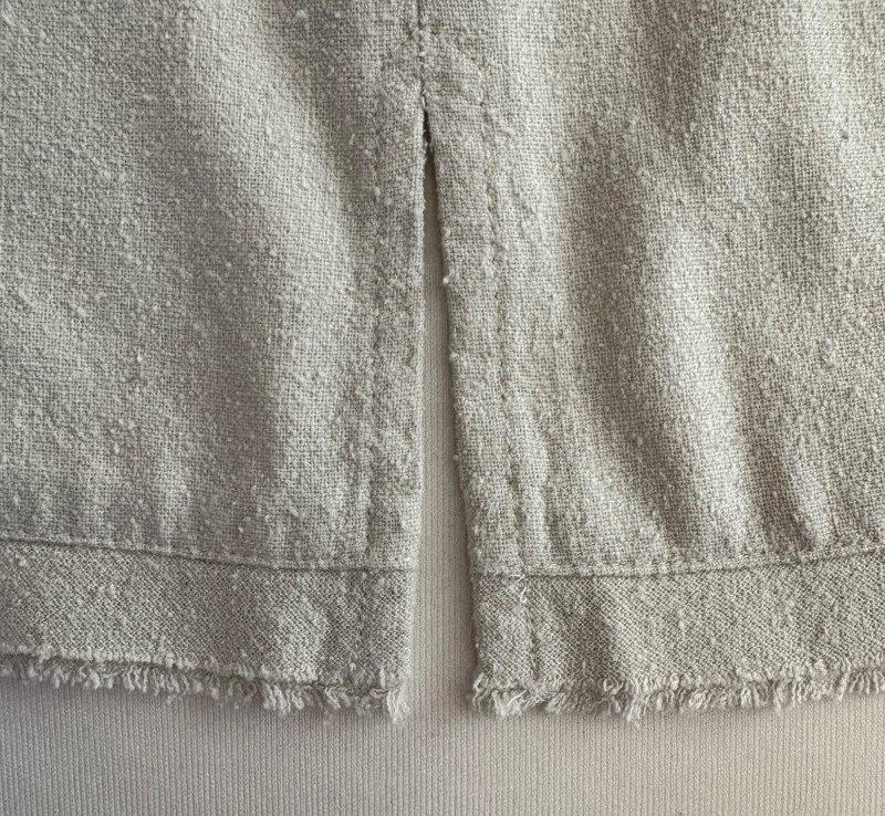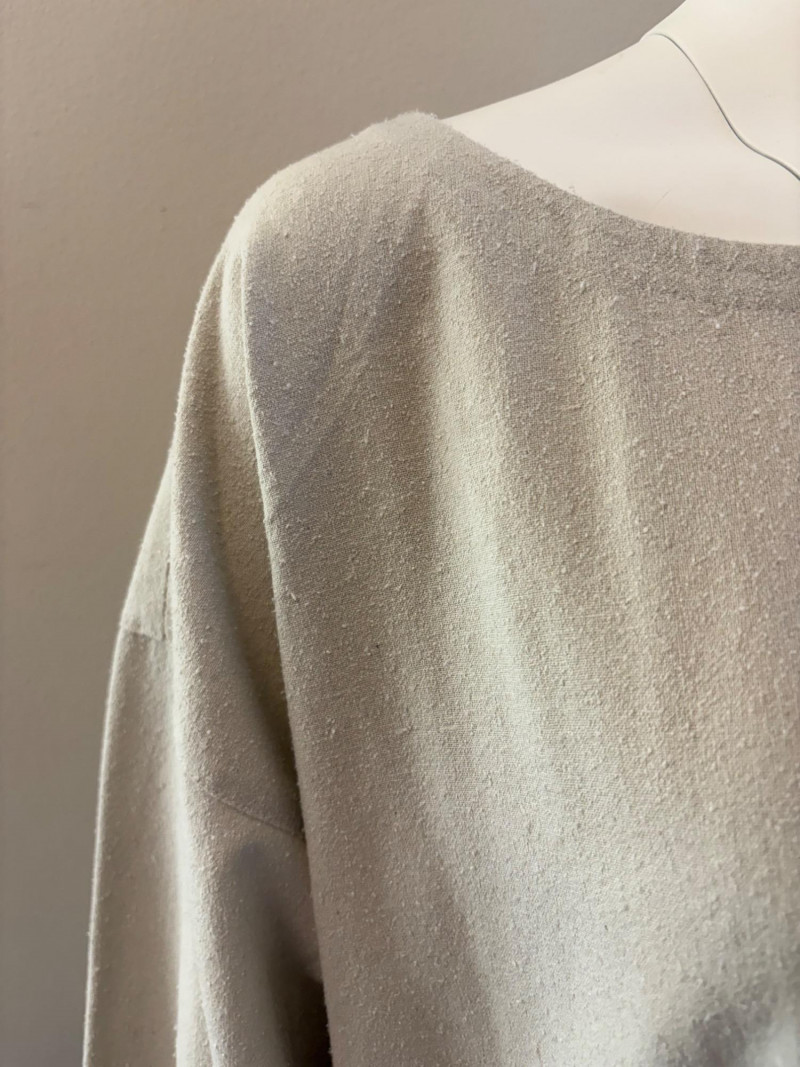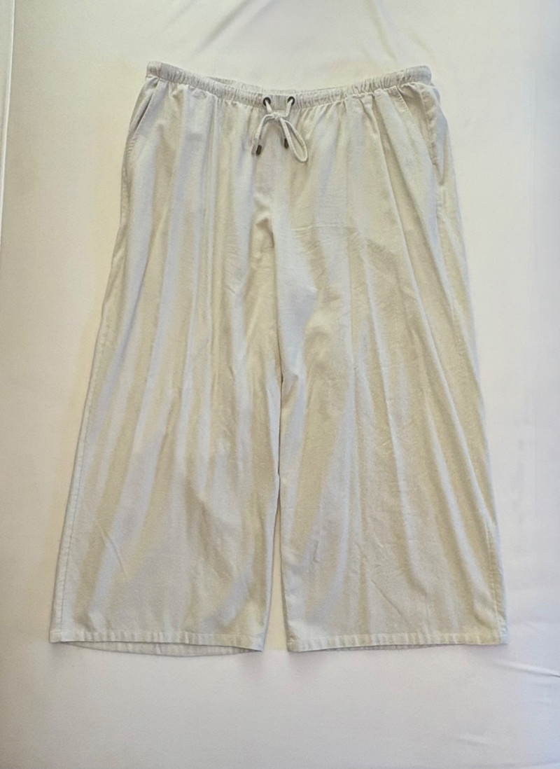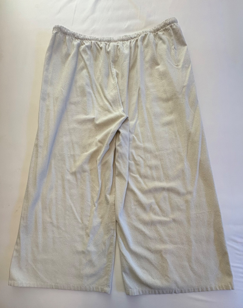 Three wonderful ivory separates in silk noil from Eileen Fisher. Simple curved neck shell has single button back neck closure and purposely frayed hem band. In very good used condition. 100% silk noil. Measures 23" pit to pit and 24" from back neckline to back hemline. Size tag says XL. Long sleeve top has curved neckline and purposely frayed split hem band. In very good used condition. 100% silk noil. Measures 25.5" pit to pit and 24.5" from back neckline to back bottom hem. Size tag says XL. Wide leg pants have elasticated waistline with metal capped drawstring and set-in side front pockets. In very good used condition. 100% silk noil. Measure 23" side to side at waist with 24" inseam. Size tag XL.