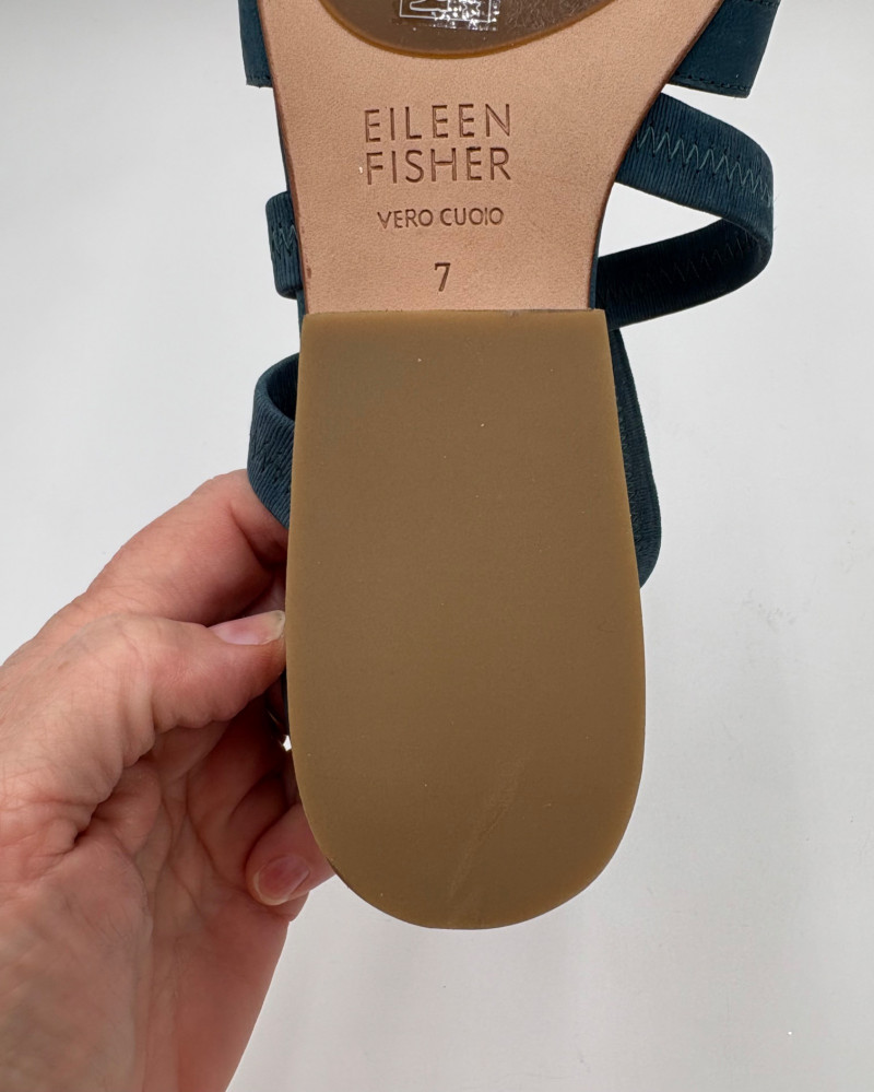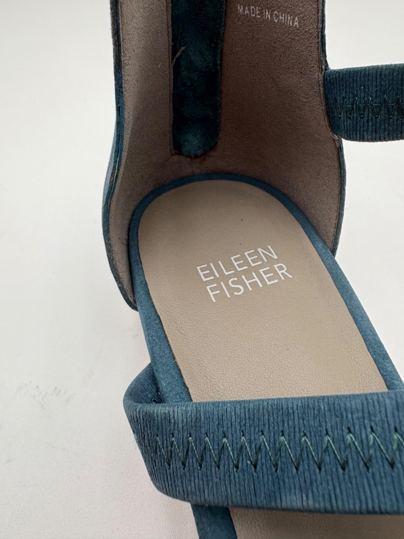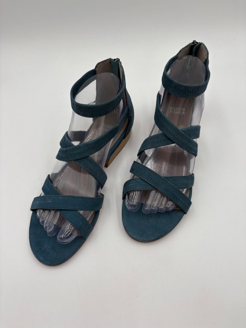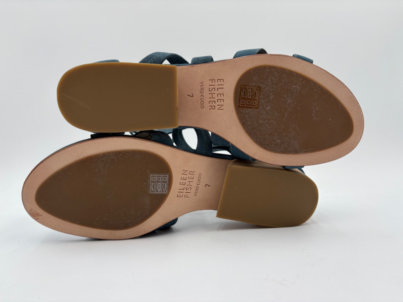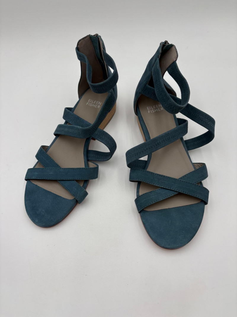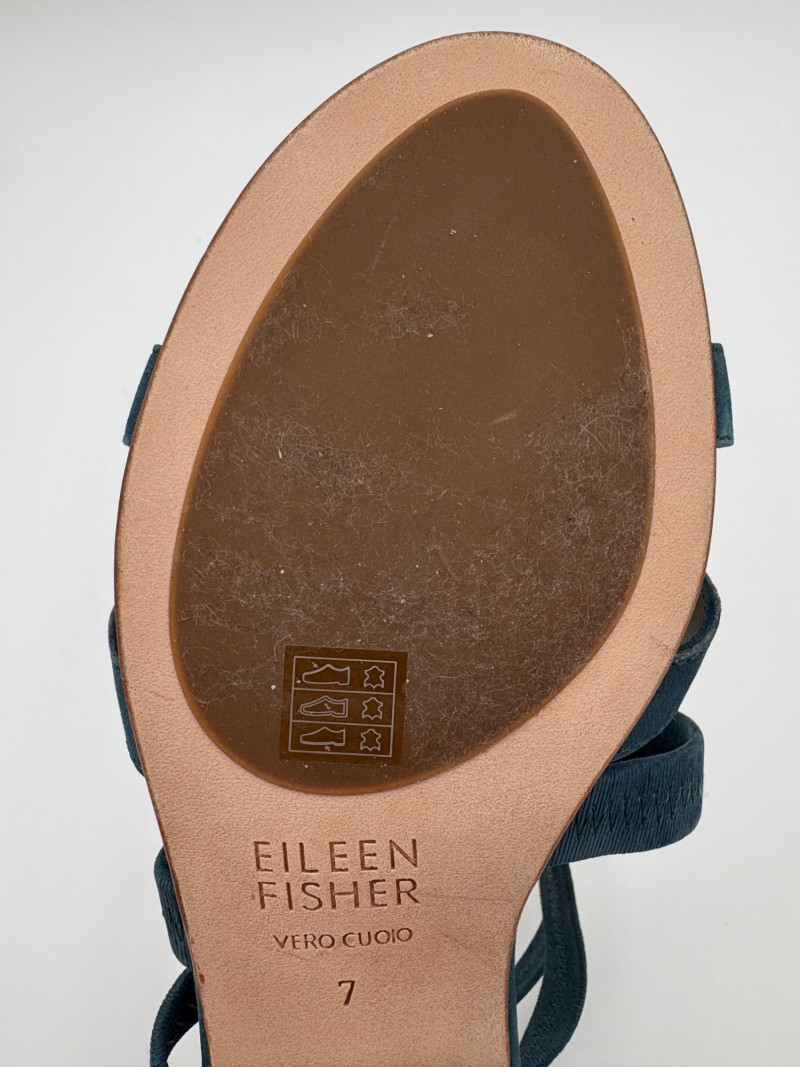 Strappy sandals from Eileen Fisher - these appear to be new with no signs of wear on uppers or soles. Blue leather sandals have a 1" stacked heel, natural-tone leather sole with rubber non-skid pad, crisscross straps across the vamp & instep, and an ankle strap. Back zip closure on heel. size 7