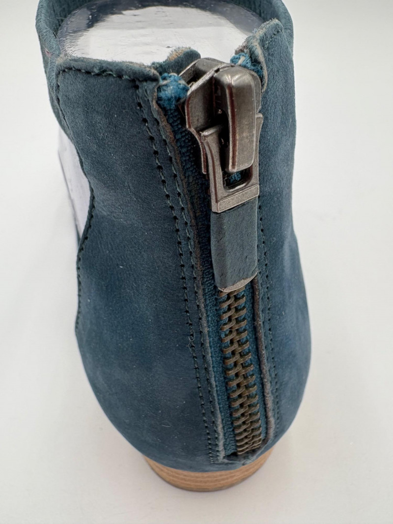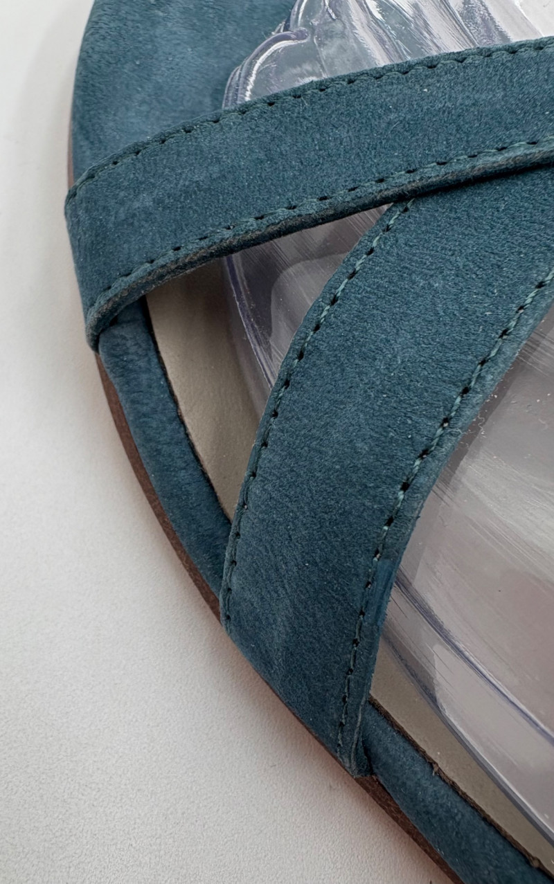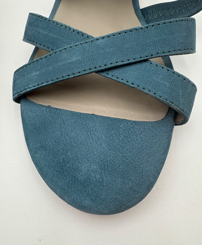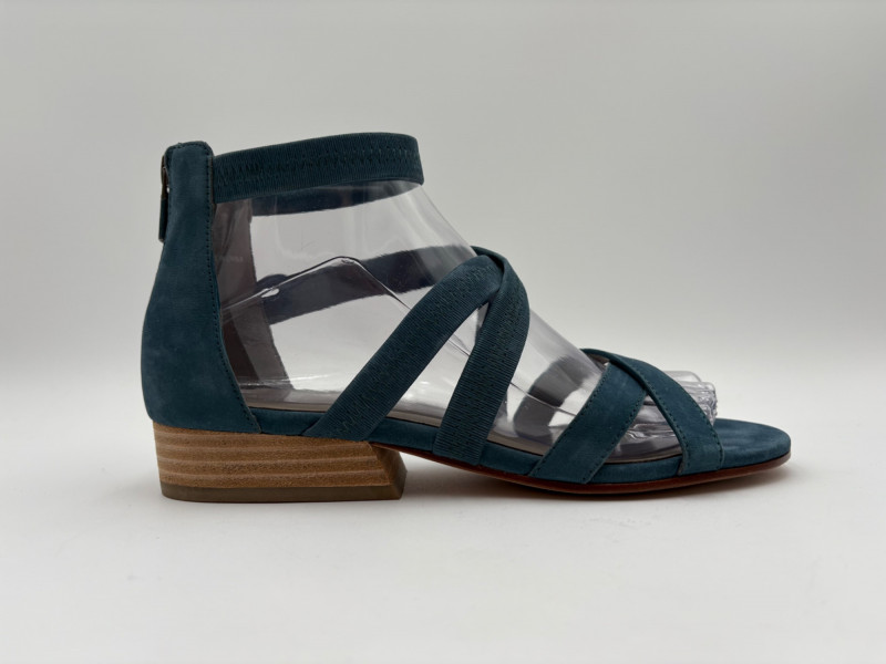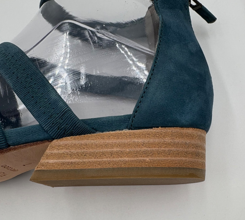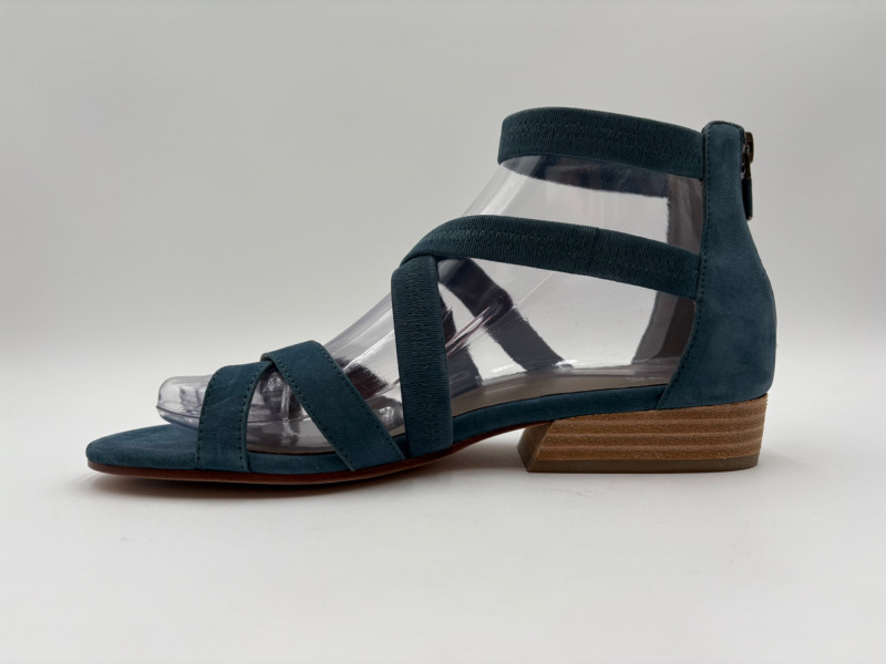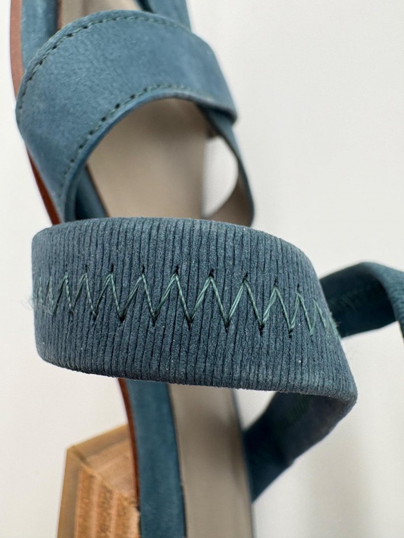 Strappy sandals from Eileen Fisher - these appear to be new with no signs of wear on uppers or soles. Blue leather sandals have a 1" stacked heel, natural-tone leather sole with rubber non-skid pad, crisscross straps across the vamp & instep, and an ankle strap. Back zip closure on heel. size 7